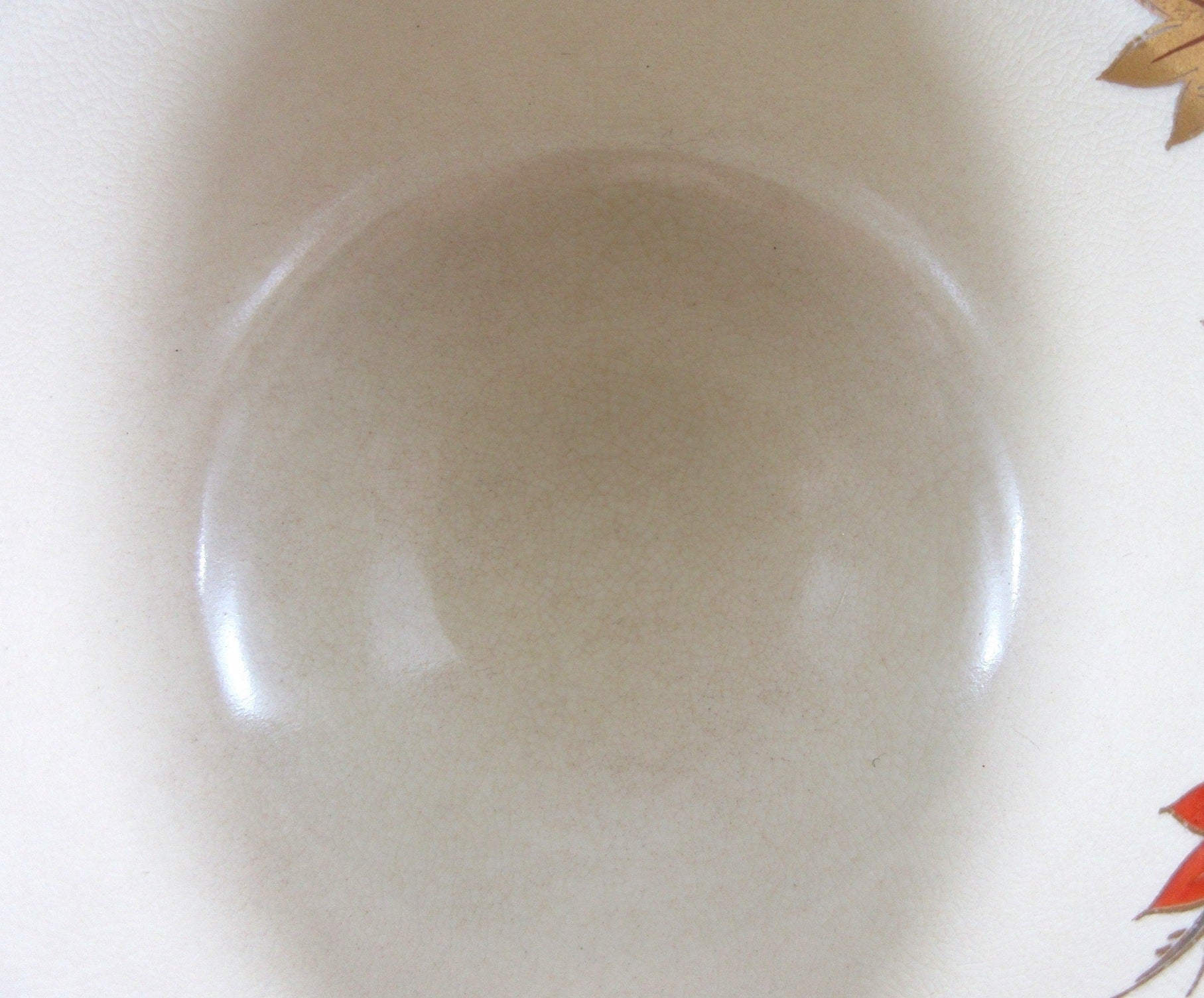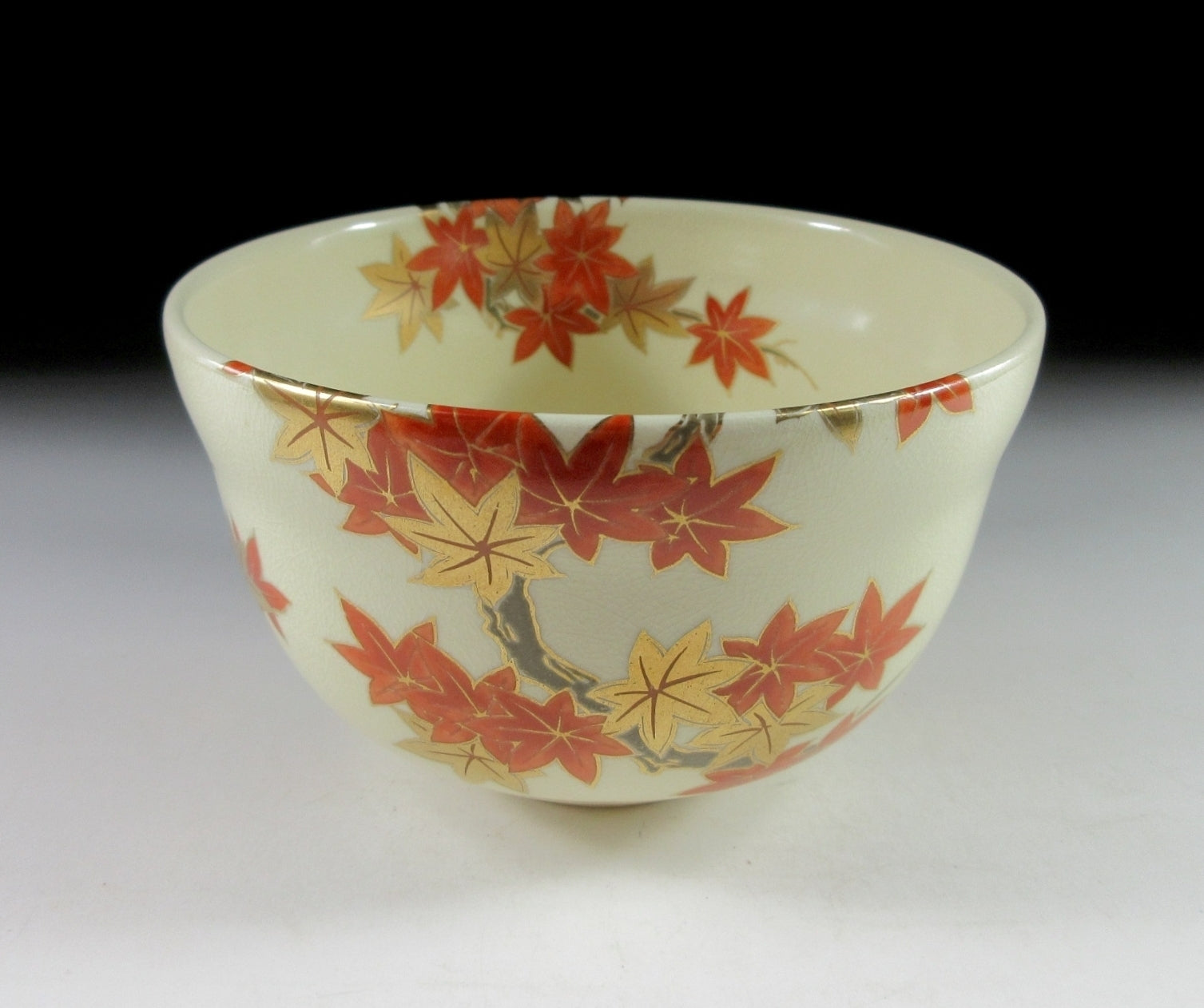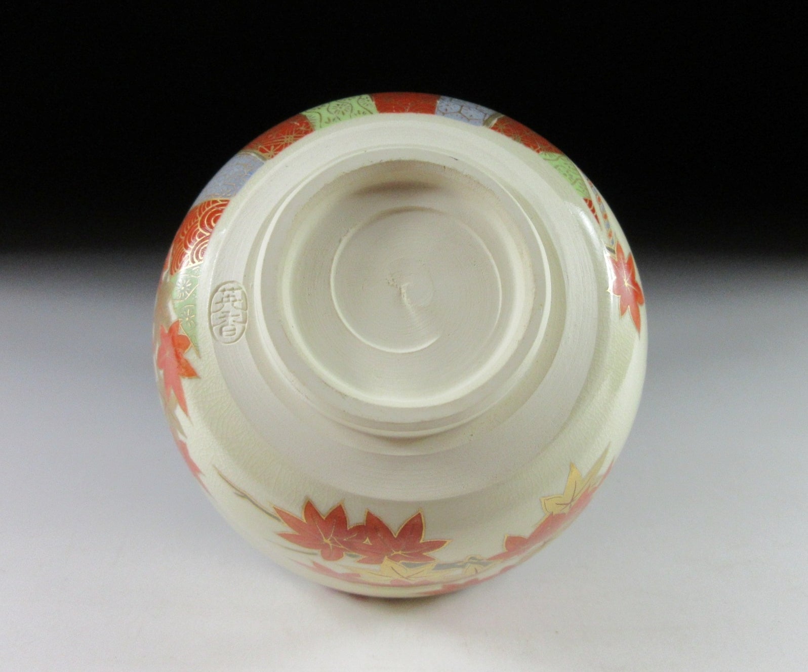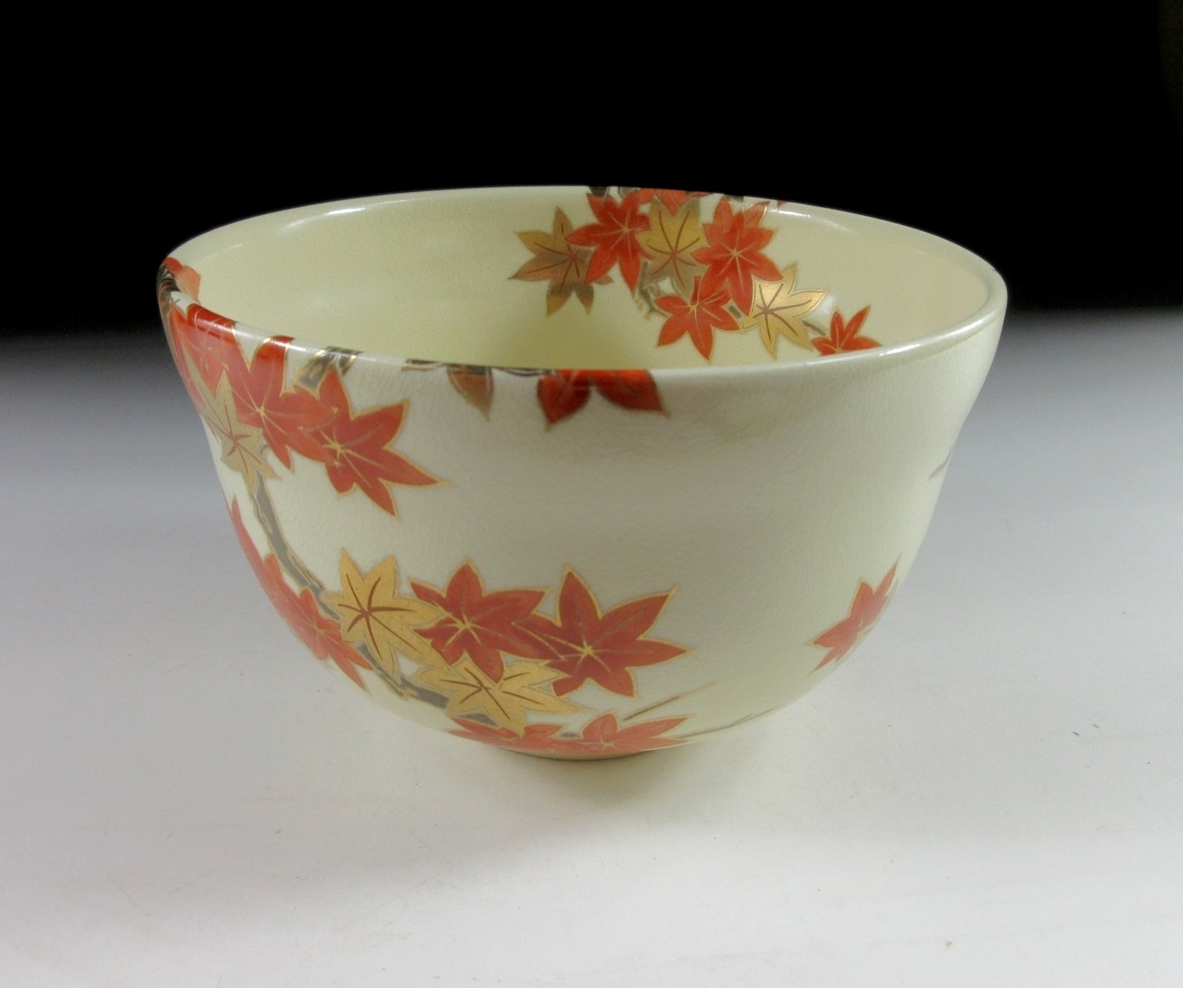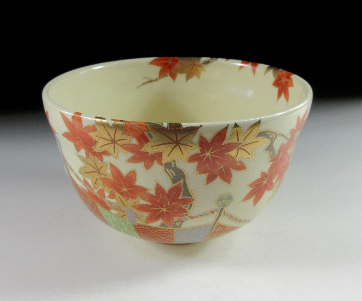 This listing is for a Kyo-ware chawan made by Miyaji Eika, and the paper box is dated Showa 61 (1986). It is wheel-thrown and made of high-fired stoneware. The decoration is Miyaji’s interpretation of Ninsei’s ‘momiji-gari’ chawan dating back to the Edo Period. Momiji-gari means autumn leaf viewing, both Ninsei’s work and the chawan in this listing depict a momiji-gari scene described in the Heian Period novel ‘The Tale of Genji’. Genji is not shown, the focus is on the splendid scenery during that particular occasion. This is a beautiful and vibrant piece ideally suited to serving thin tea. The stamp of the potter can be found on the bottom, and it comes with its original paper storage box.