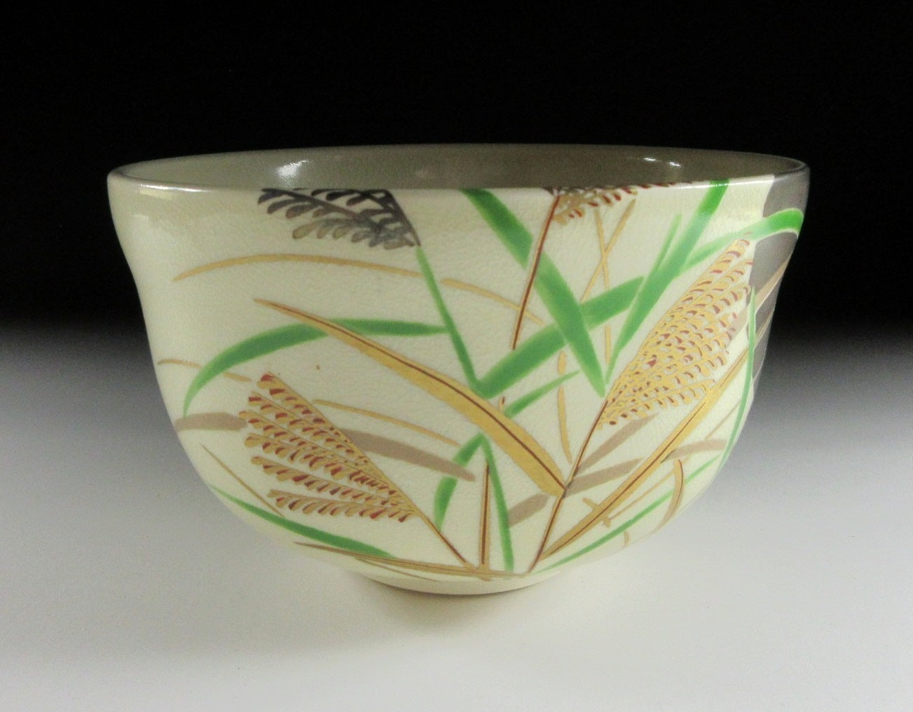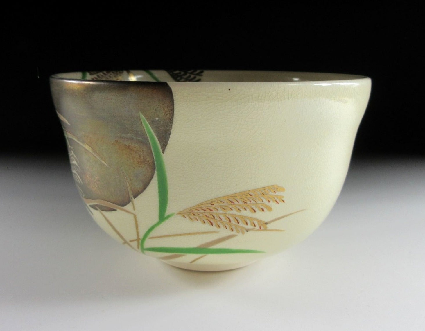 This listing is for a very pleasant autumnal chawan made around 20-30 years ago by noted potter, Miyaji Eika. It is wheel-thrown and is a copy of Nonomura Ninsei's 17th century chawan depicting the Musashino Plain. This is a beautiful hand-painted piece depicting the harvest moon with gently swaying silvergrass. During autumn in Japan, we celebrate the harvest moon festival which is known as tsukimi. Traditionally people gave thanks for bountiful harvests, they offered mochi and vegetables in return for successful crops again the following year. Some people have gatherings and write haiku, others display pampas grass and watch outdoor Noh performances. No matter the celebration it’s a beautiful time of year, and one that can be enjoyed with a bowl of tea. The seal of the potter can be found on the bottom, and it comes with its original paper box.