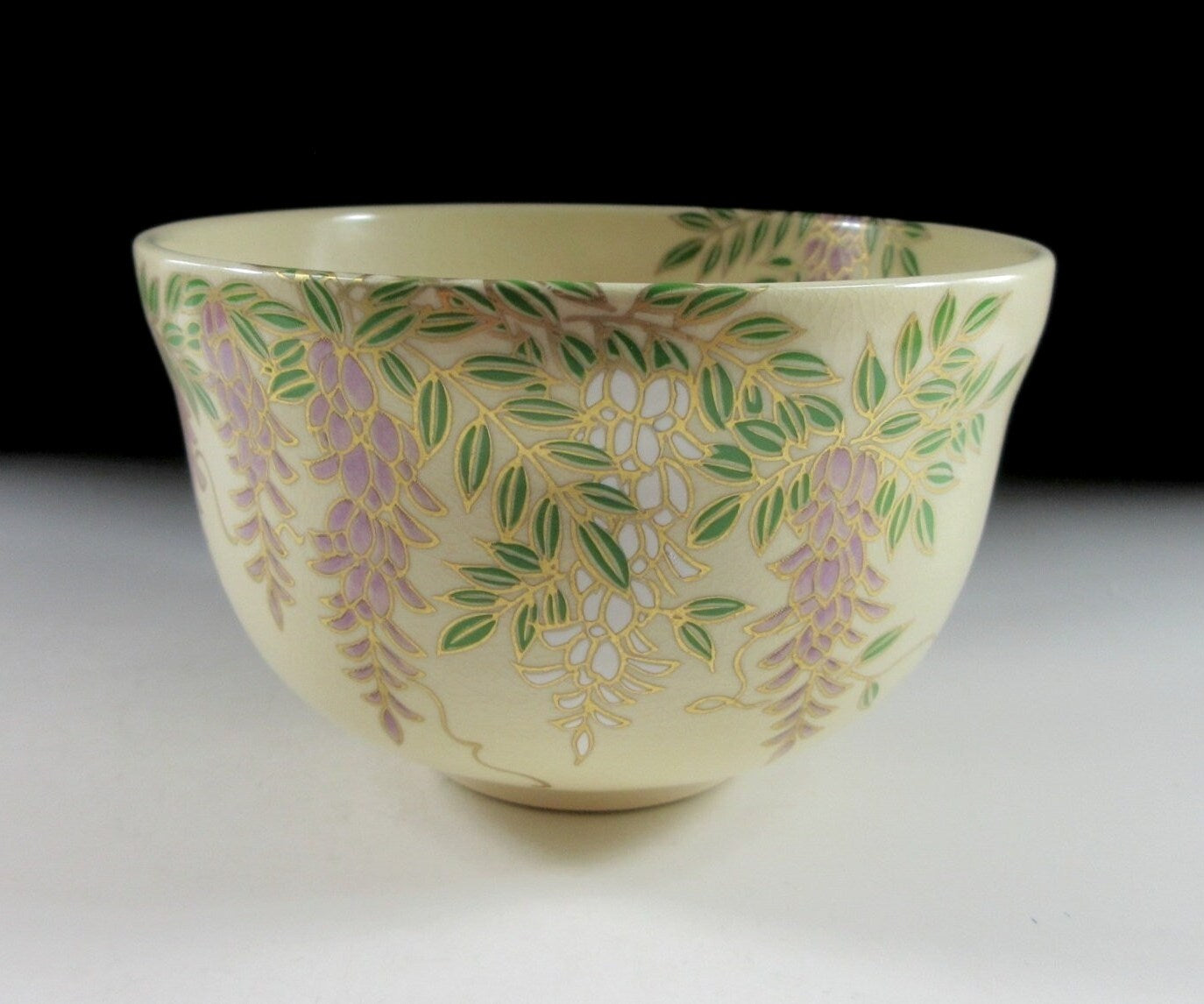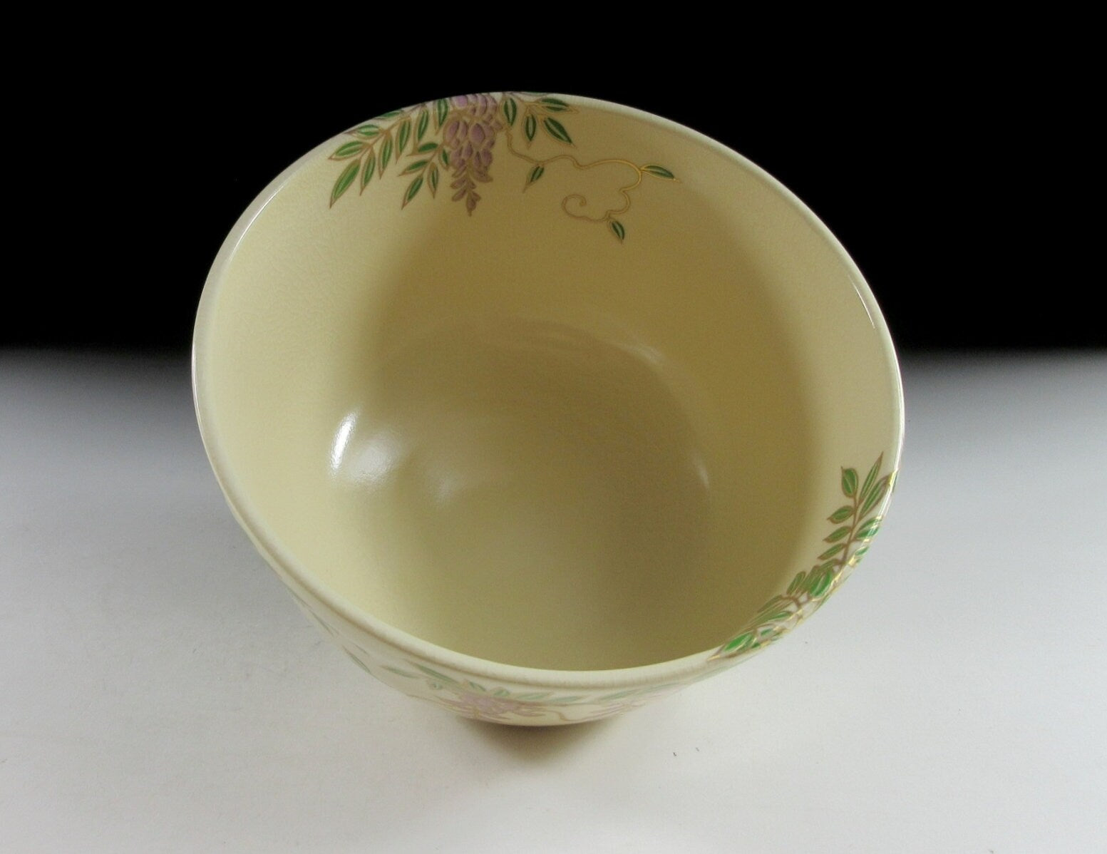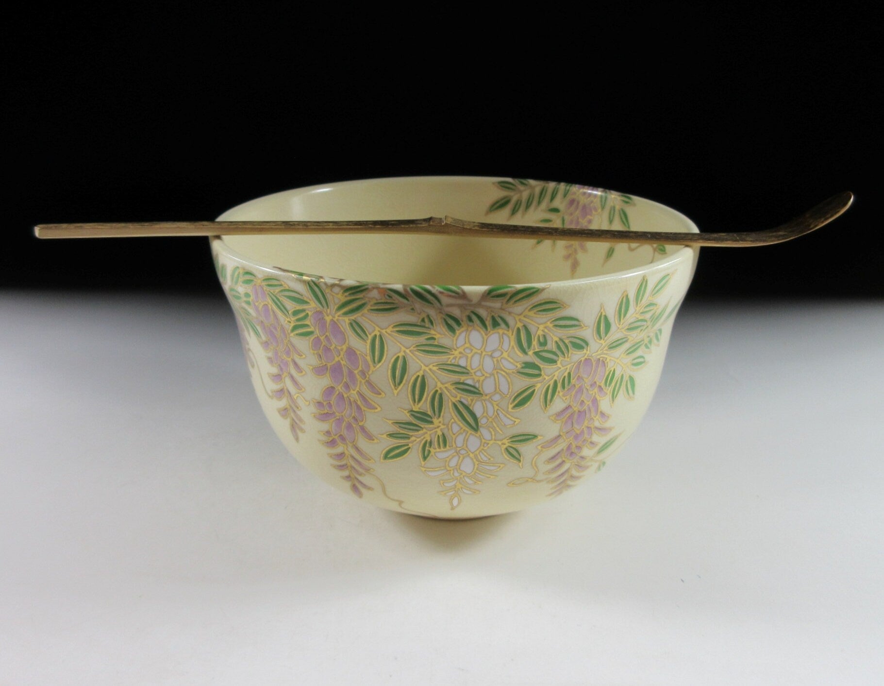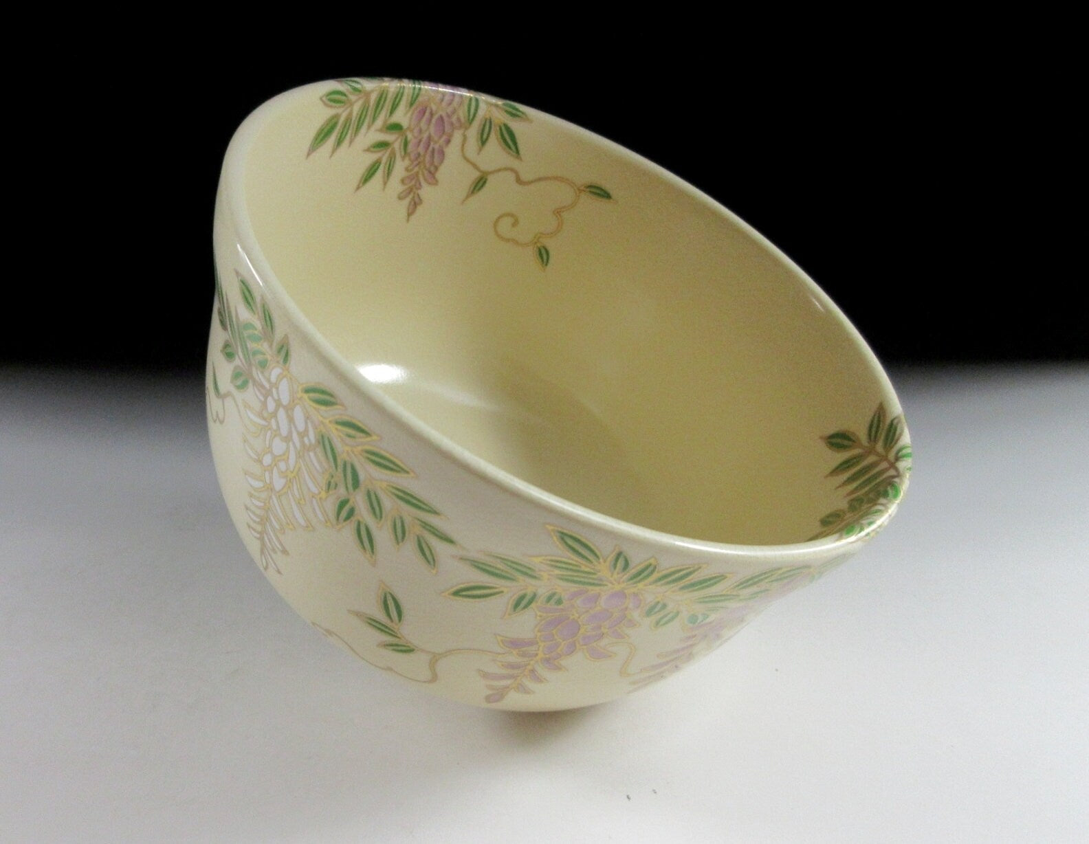 This listing is for a Kyo-ware chawan made around 20 years ago by noted potter, Miyaji Eika. It is wheel-thrown and is decorated with purple and white wisteria plumes. Wisteria typically bloom in May and are regarded as a symbol of good luck, success and longevity. Their purple colour is linked to nobility, and they are frequently used to decorate ornaments and teaware for the annual Children’s Day festival held on May 5th. The stamp of the potter can be found on the bottom, and it comes with its original signed paper storage box. *PLEASE NOTE THAT THE CHASHAKU TEA SCOOP IS NOT INCLUDED.