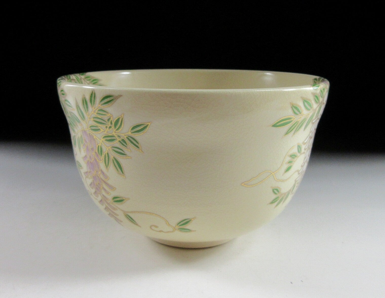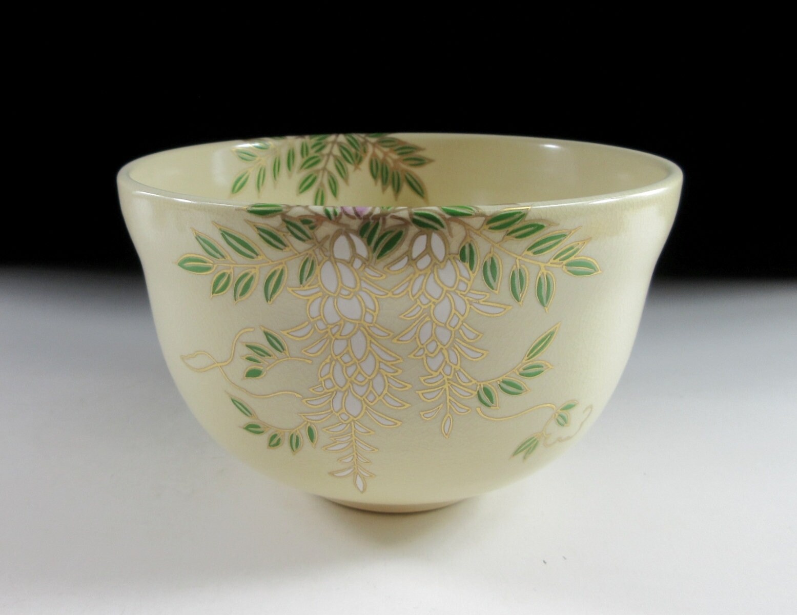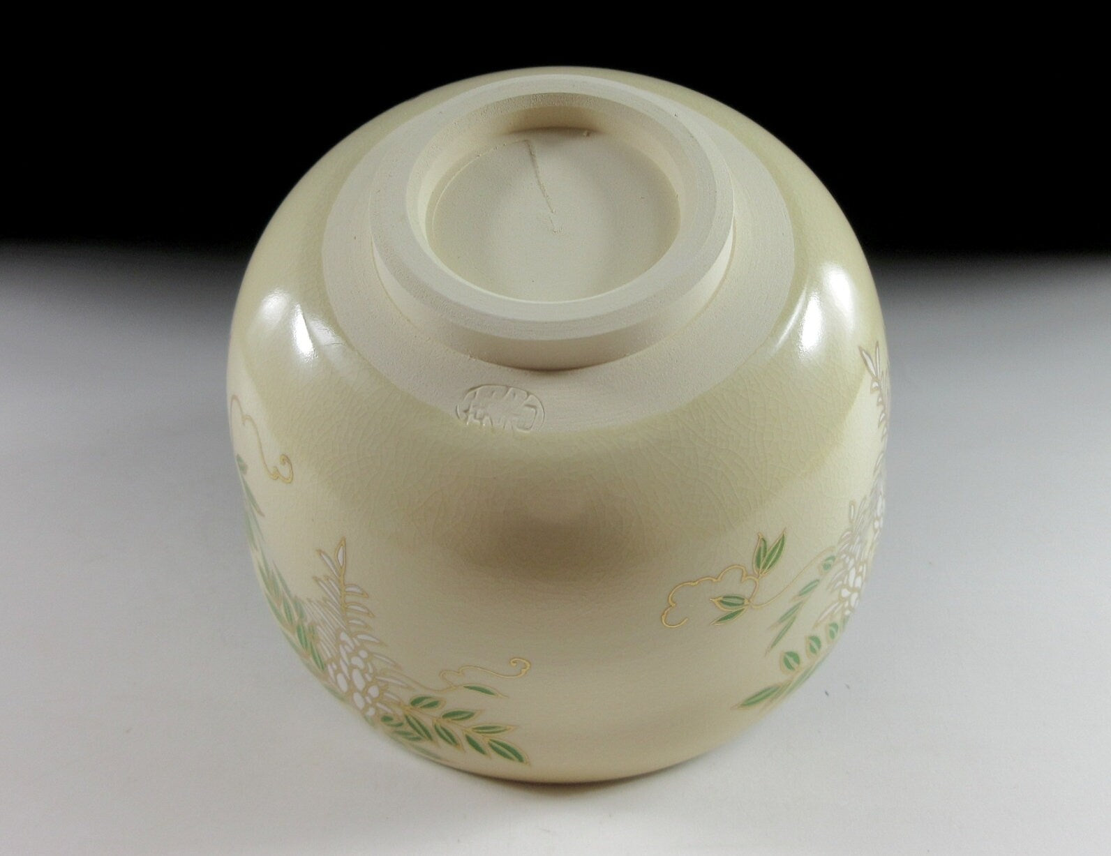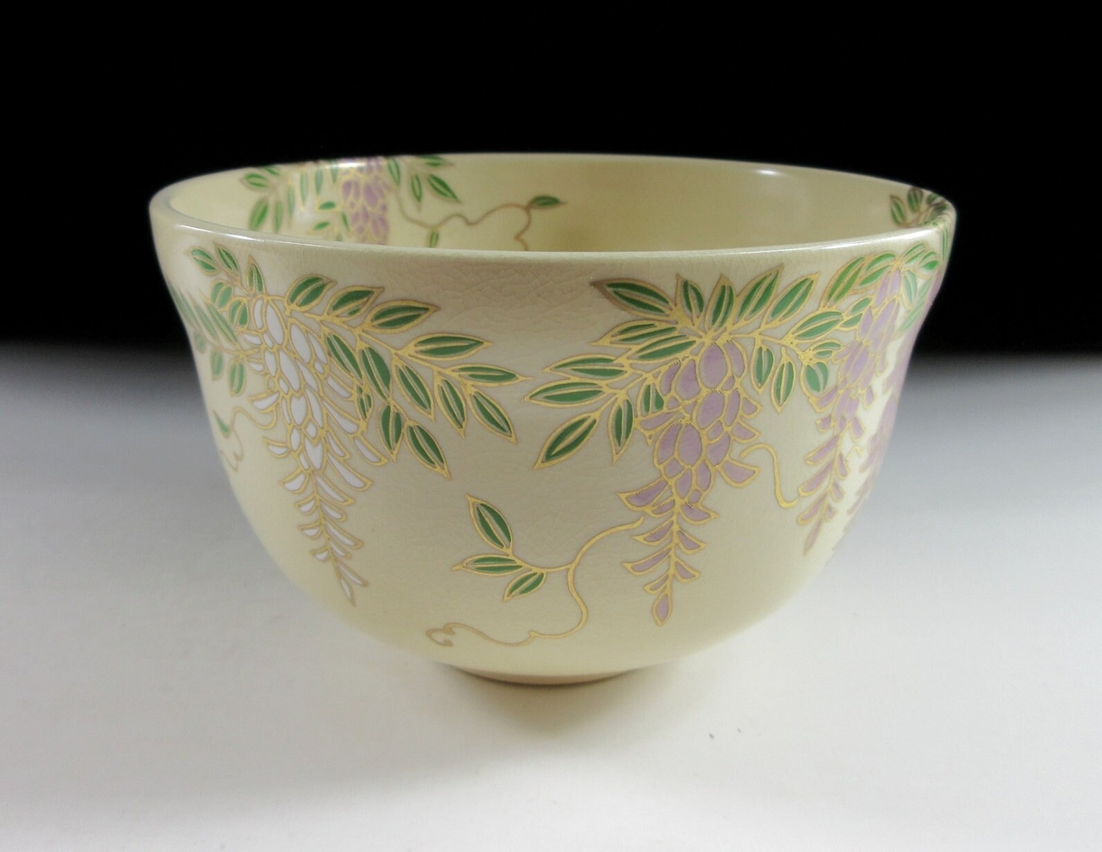 This listing is for a Kyo-ware chawan made around 20 years ago by noted potter, Miyaji Eika. It is wheel-thrown and is decorated with purple and white wisteria plumes. Wisteria typically bloom in May and are regarded as a symbol of good luck, success and longevity. Their purple colour is linked to nobility, and they are frequently used to decorate ornaments and teaware for the annual Children’s Day festival held on May 5th. The stamp of the potter can be found on the bottom, and it comes with its original signed paper storage box. *PLEASE NOTE THAT THE CHASHAKU TEA SCOOP IS NOT INCLUDED.