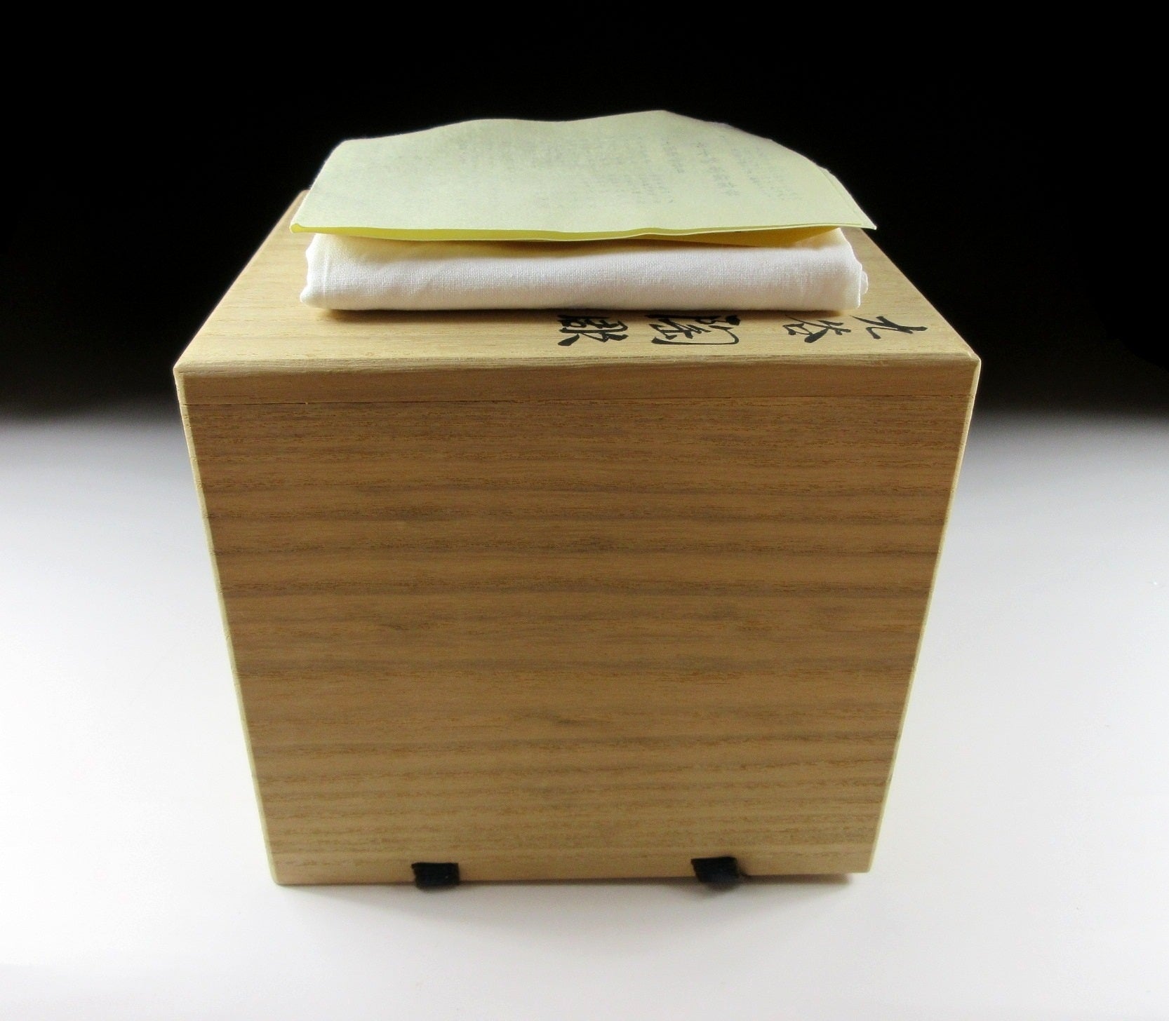 This listing is for a Kutani-ware okimono made around 20-30 years ago by noted potter, Miyamoto Tomotada. It is made from a slip mould and moulded to resemble a pair of rabbits. Each rabbit is coated in partially transparent white glaze, and their ears and eyes are trimmed with red glaze. This piece was most likely made to commemorate the Year of the Rabbit back in 1999. The signature of the potter can be found on the bottom, and it comes with its original signed wooden storage box. It also comes with a yellow wrapping cloth to protect the item when it’s not in use.