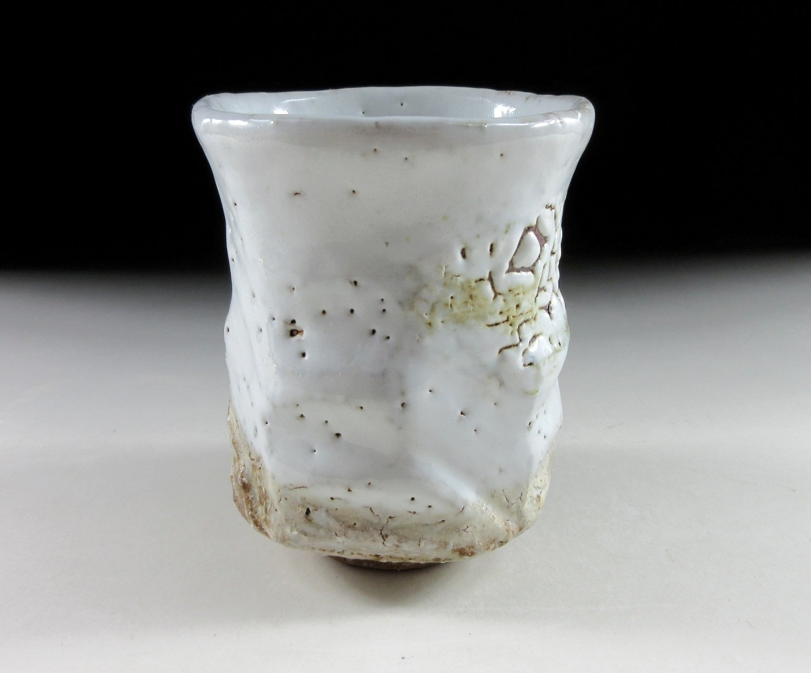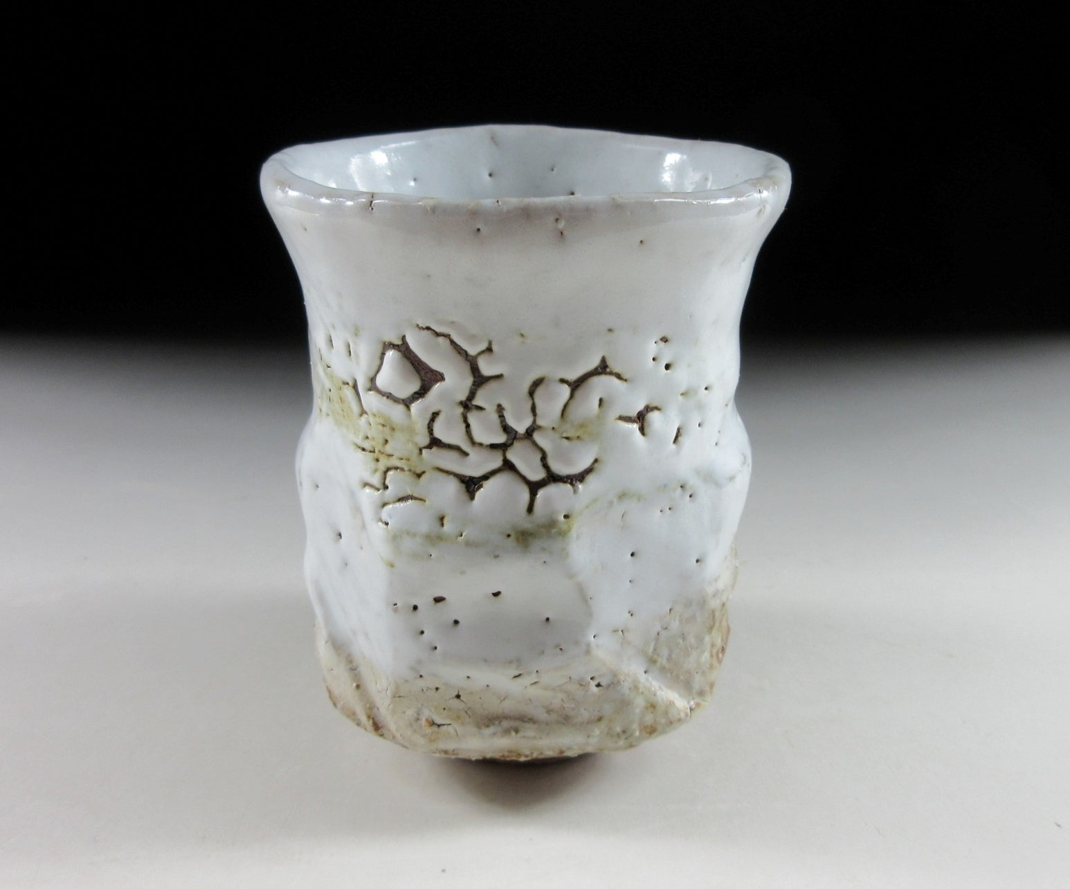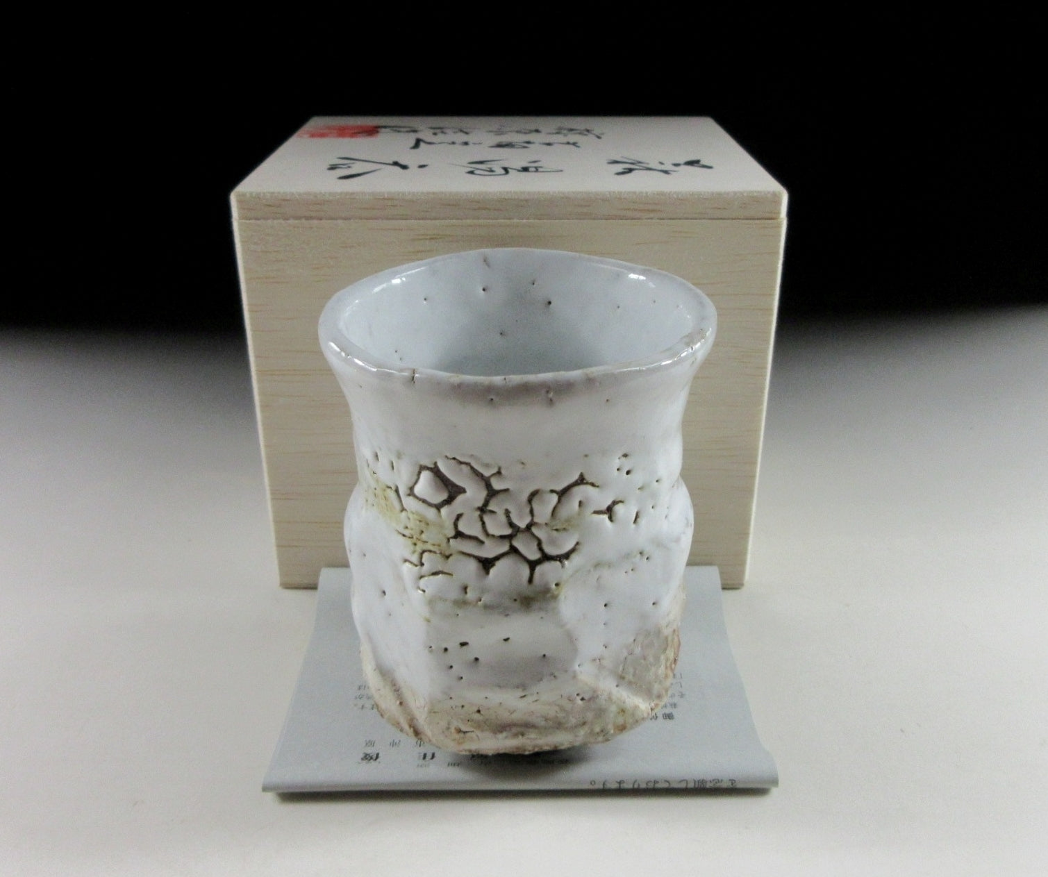 This listing is for a splendid Hagi-ware yunomi tea cup made around 5 years ago by noted potter, Mukuhara Kashun. It is wheel-thrown and dipped in white glaze made from rice straw ash. It appears completely unused and is suitable for daily use. The stamp of the potter can be found on the bottom, and it comes with its original signed wooden storage box. It also comes with a Japanese language profile paper about the potter.