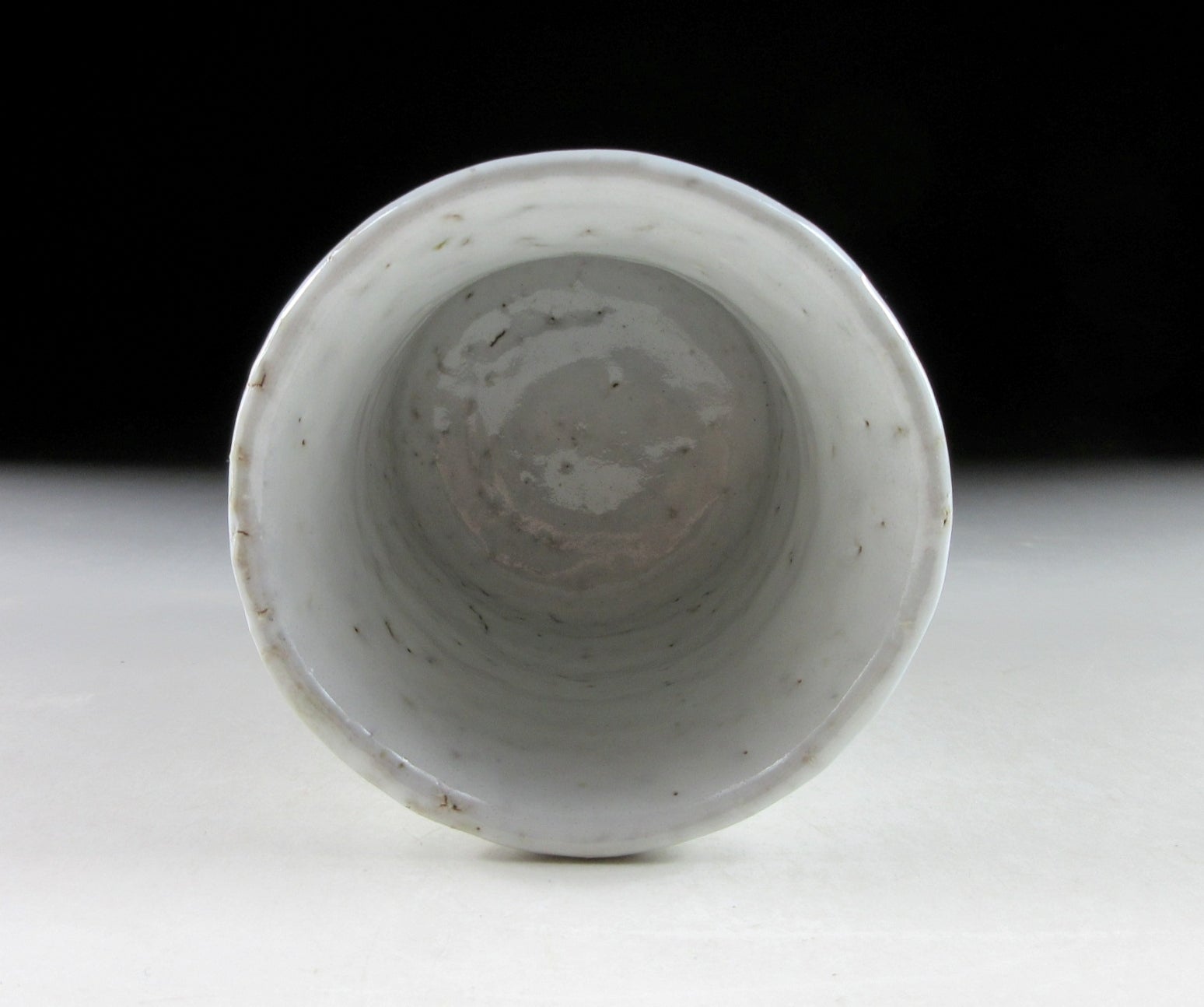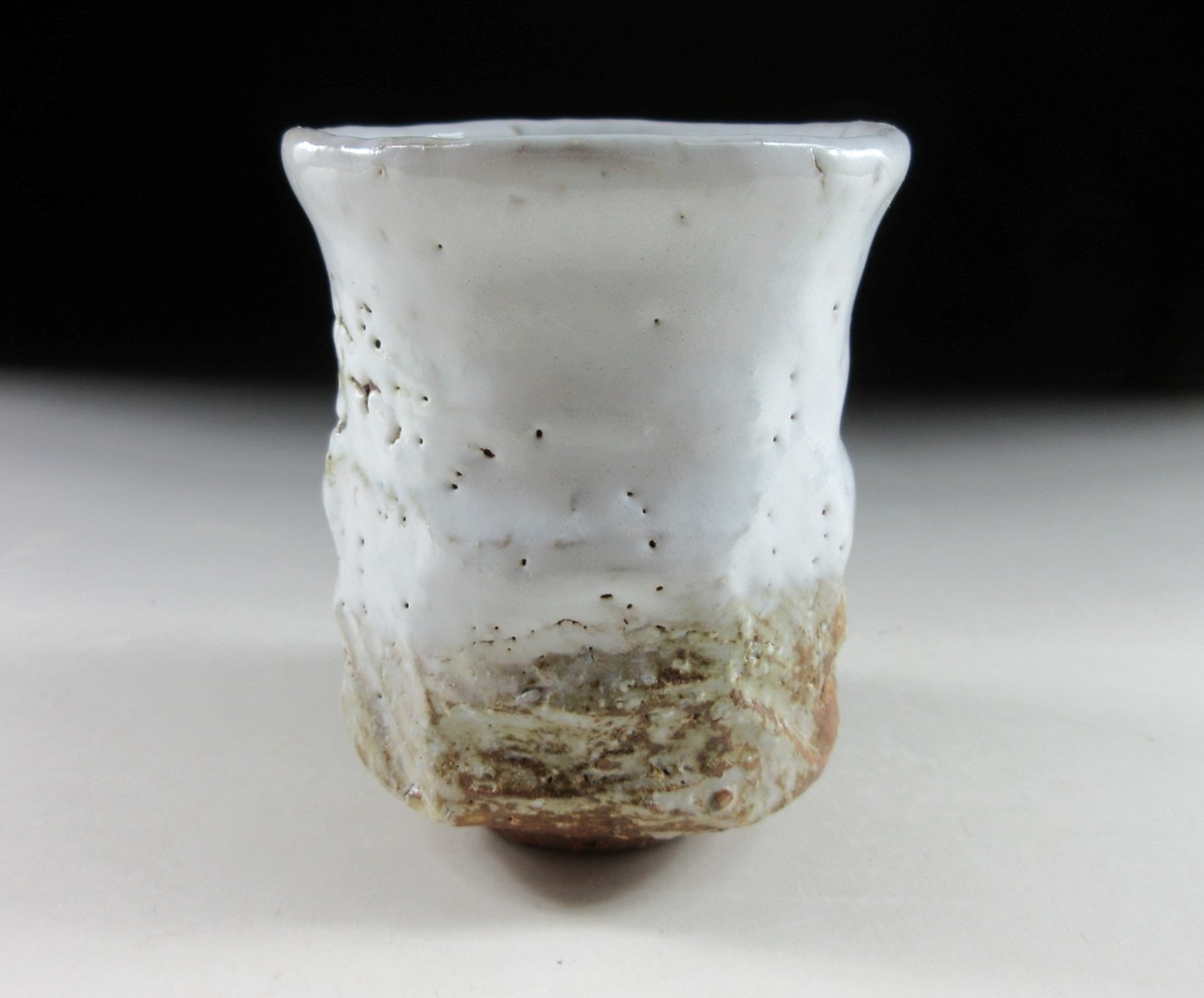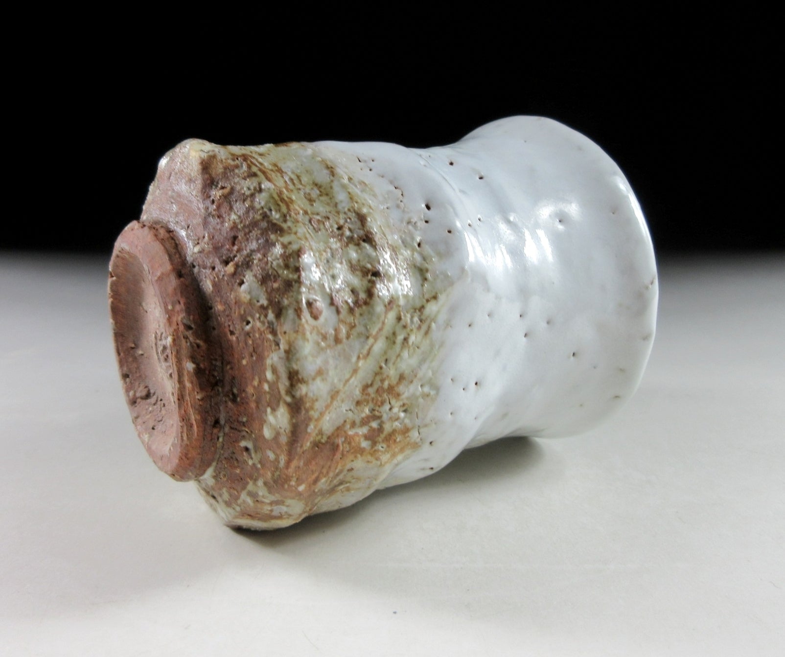 This listing is for a splendid Hagi-ware yunomi tea cup made around 5 years ago by noted potter, Mukuhara Kashun. It is wheel-thrown and dipped in white glaze made from rice straw ash. It appears completely unused and is suitable for daily use. The stamp of the potter can be found on the bottom, and it comes with its original signed wooden storage box. It also comes with a Japanese language profile paper about the potter.