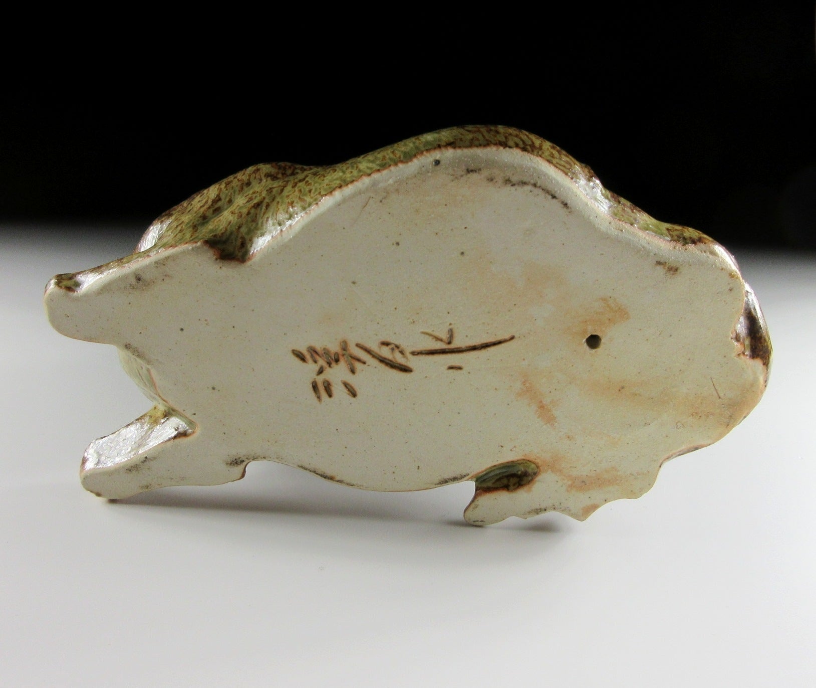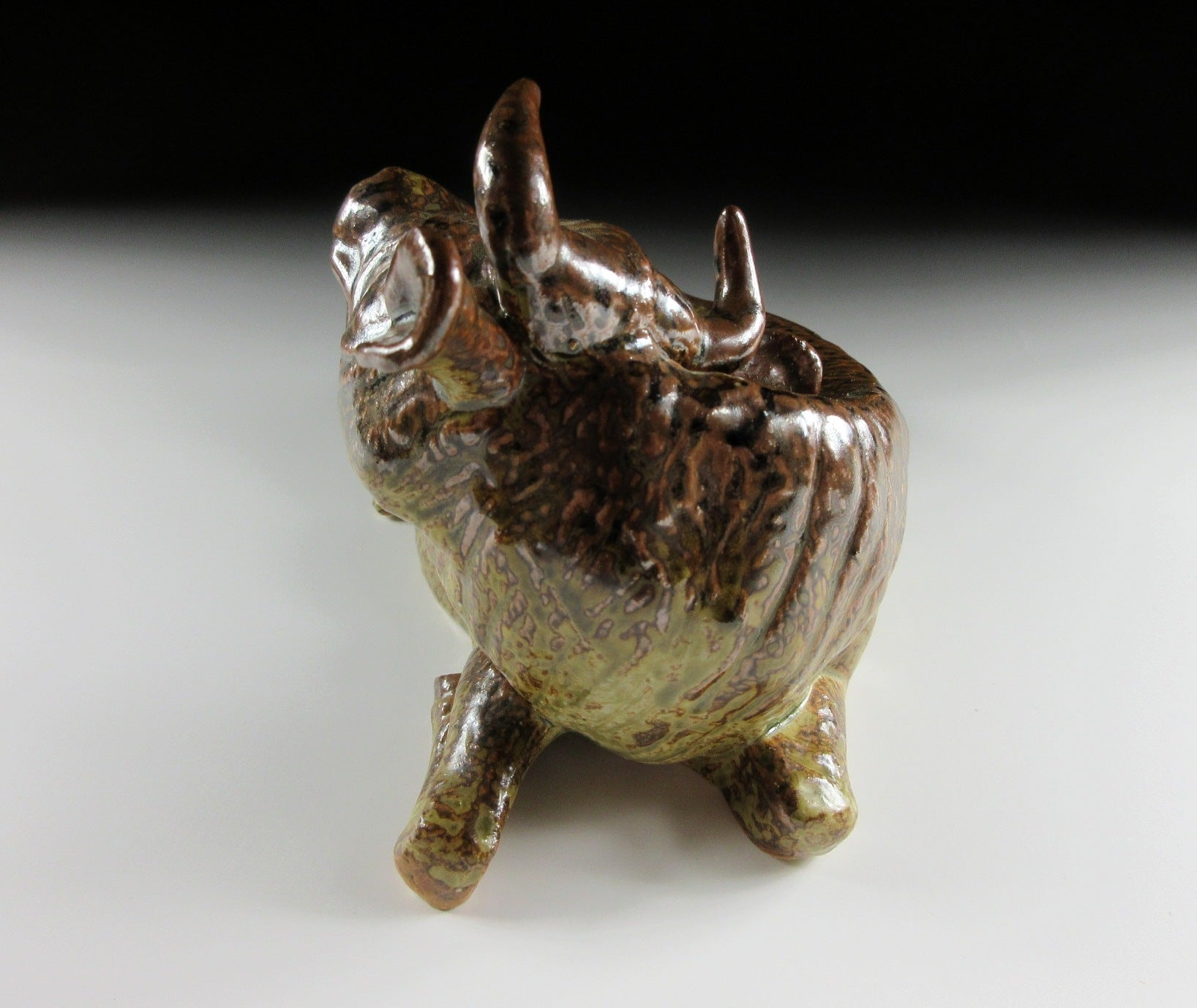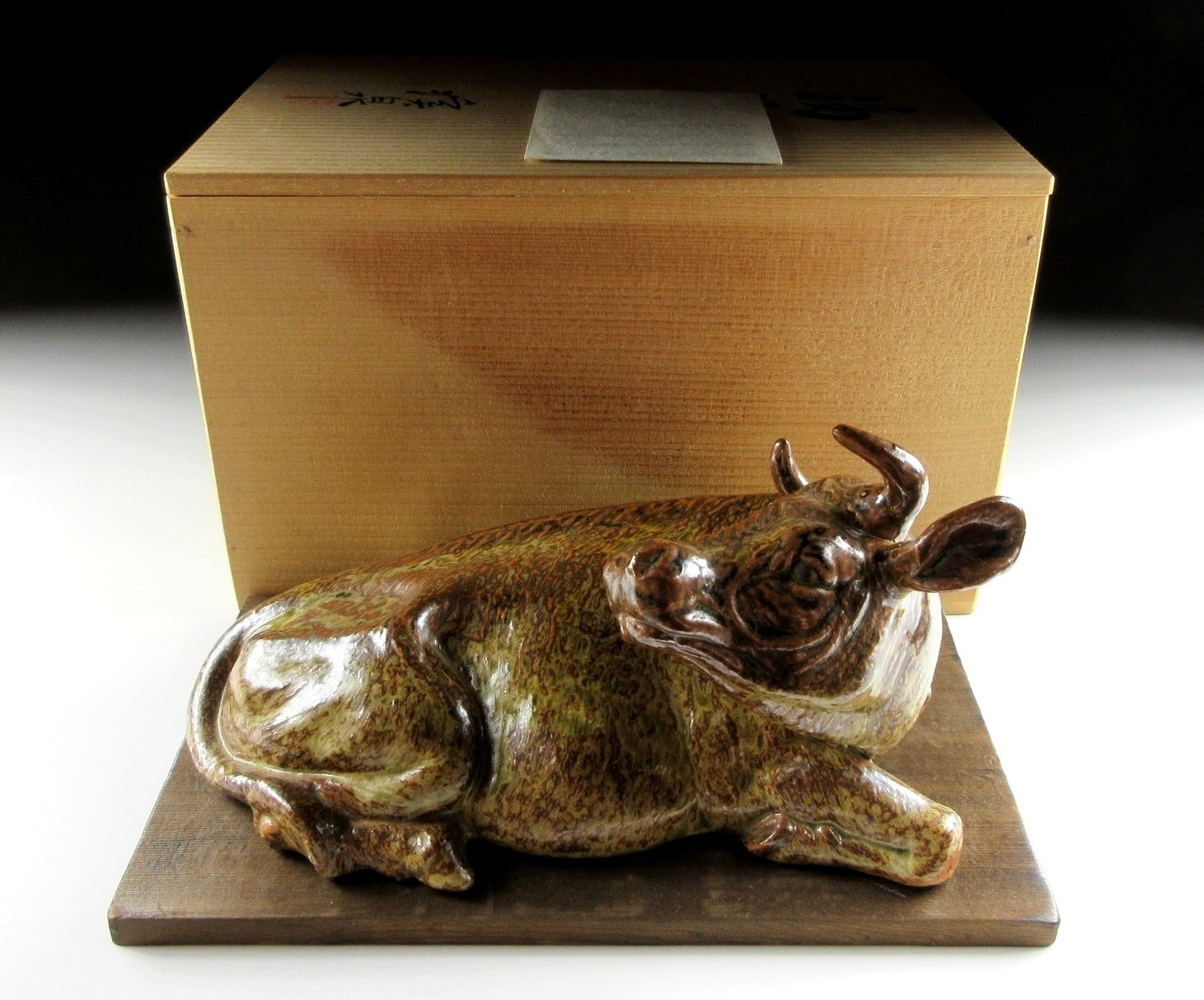This listing is for a Seto-ware okimono made around 30 years ago by Murakami Yoshimi. It was made from a slip mould and moulded to resemble a resting ox. The exterior features brown iron based glaze with light coloured ash based glaze over the top. This piece was most likely made to commemorate the Year of the Ox in 1985. The signature of the potter can be found on the bottom, and it comes with its original signed wooden storage box. It also comes with a wooden display board, as well as a Japanese language profile paper about the potter.