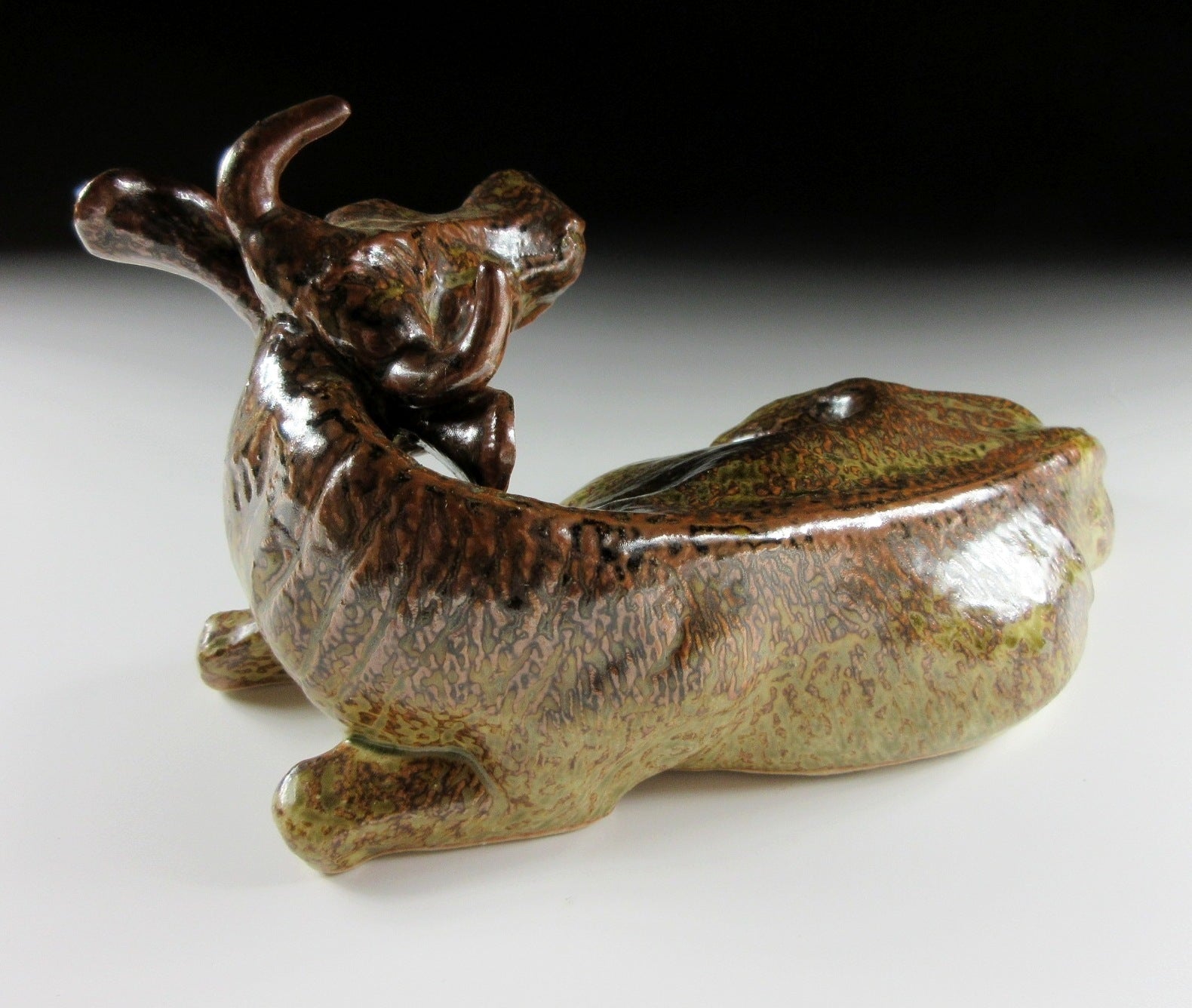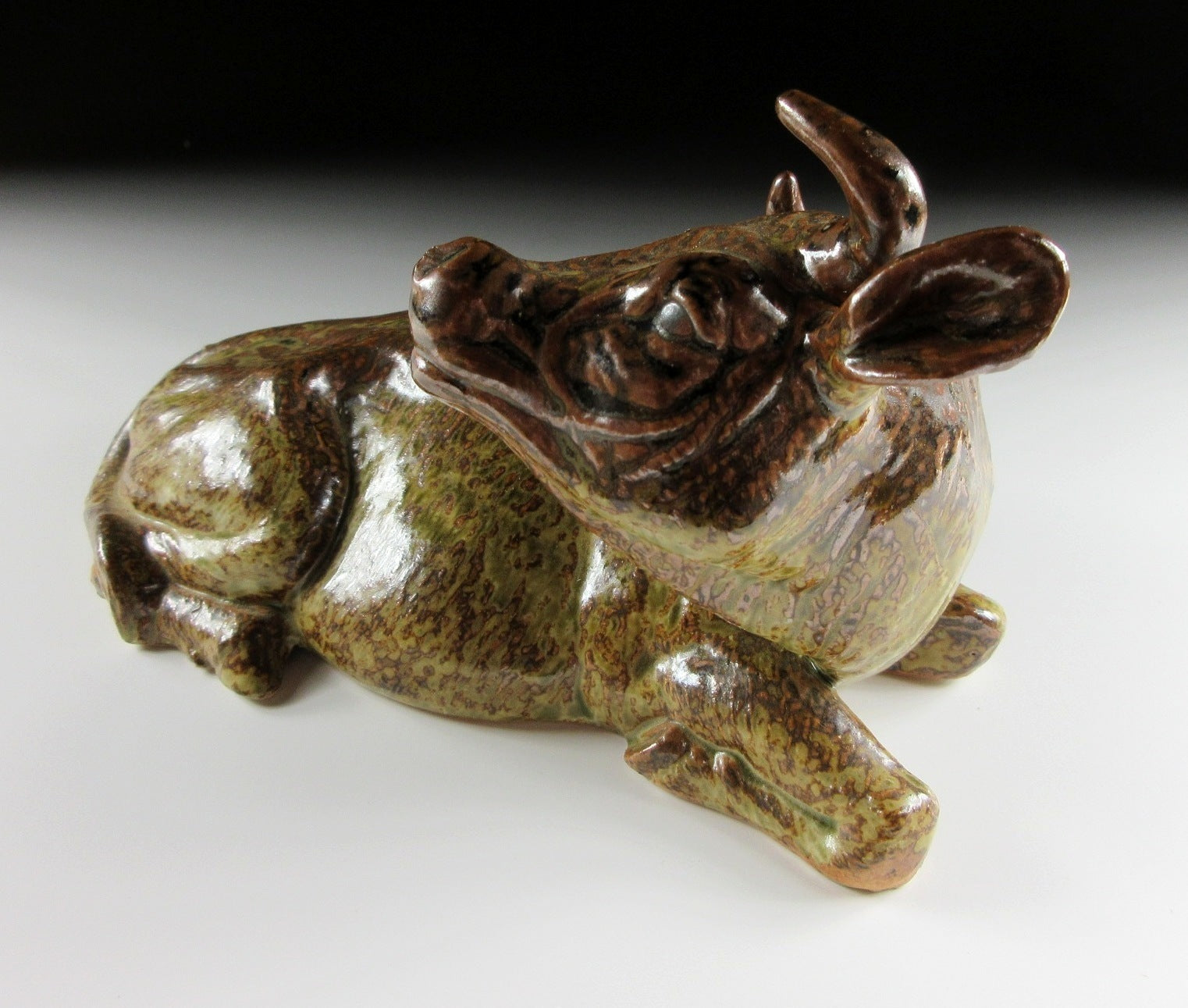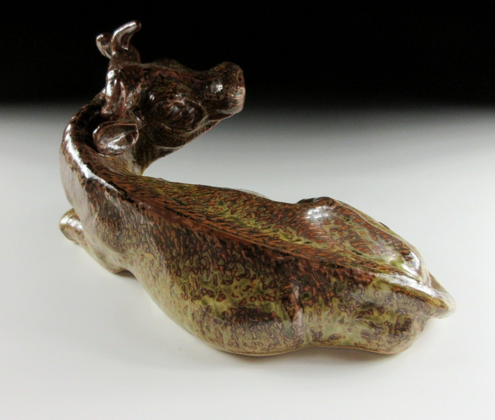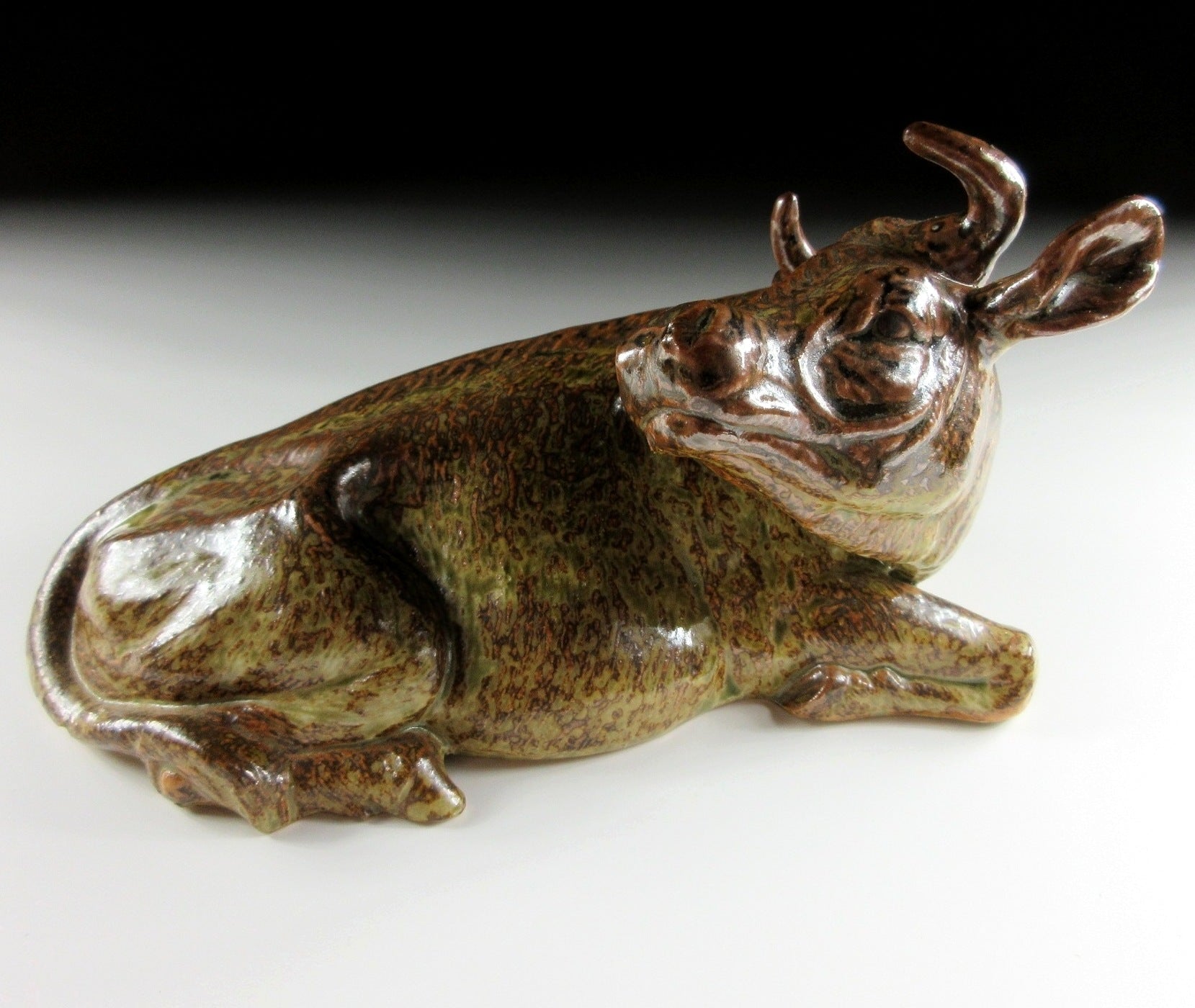 This listing is for a Seto-ware okimono made around 30 years ago by Murakami Yoshimi. It was made from a slip mould and moulded to resemble a resting ox. The exterior features brown iron based glaze with light coloured ash based glaze over the top. This piece was most likely made to commemorate the Year of the Ox in 1985. The signature of the potter can be found on the bottom, and it comes with its original signed wooden storage box. It also comes with a wooden display board, as well as a Japanese language profile paper about the potter.