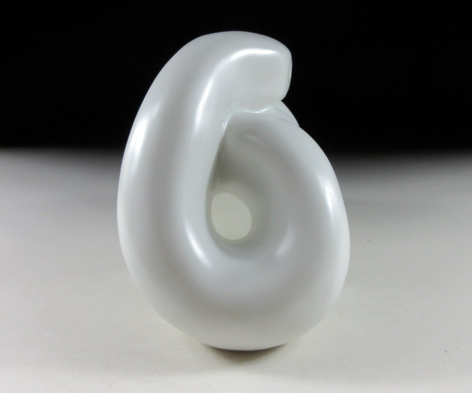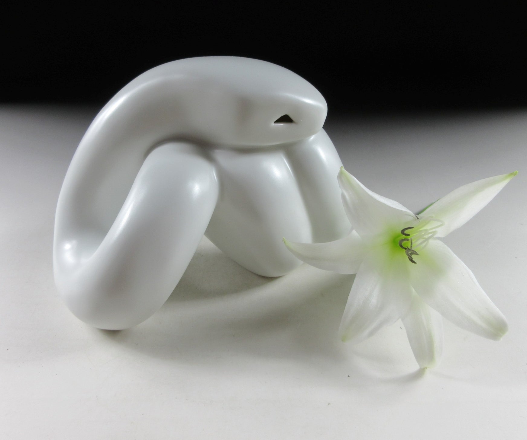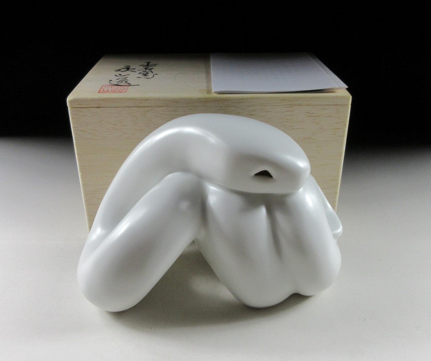 This listing is for a splendid Izushi-ware snake okimono made by distinguished potter, Nagasawa Eishin IV. It has a smooth milky white surface, and was possibly made to commemorate the Year of the Snake back in 2013. The process for making okimono involves crushing locally sourced stones, dissolving them in water, and pouring the liquid into a mould. After drying, details such as eyes are carved out and the item is fired at 1300 degrees. The piece is then glazed and refired at a high temperature for an entire day. The seal of the potter can be found on the bottom, and it comes with its original signed wooden storage box. It also comes with a Japanese language profile about the Nagasawa family of potters.