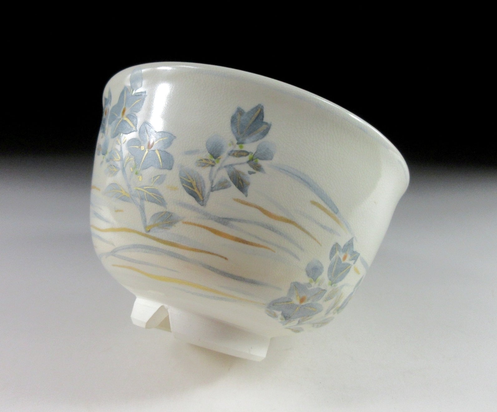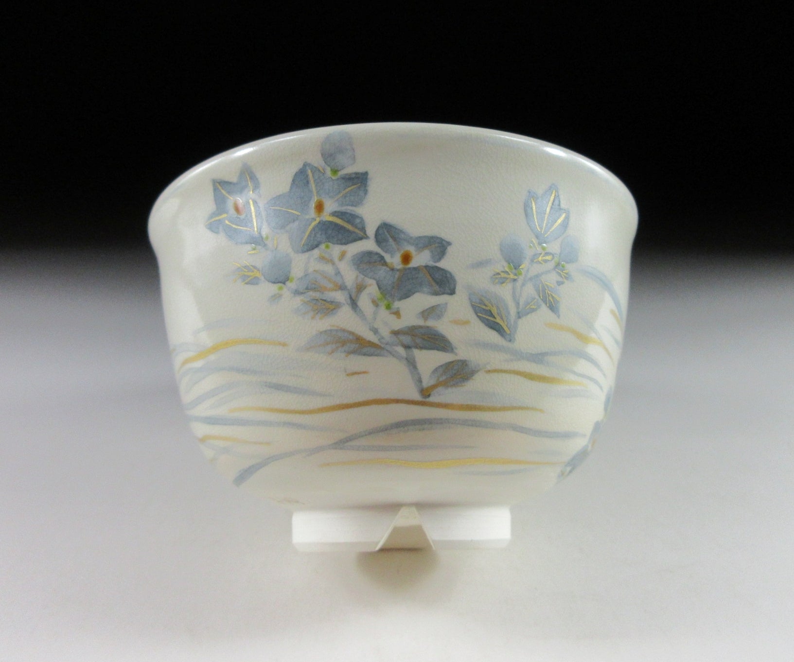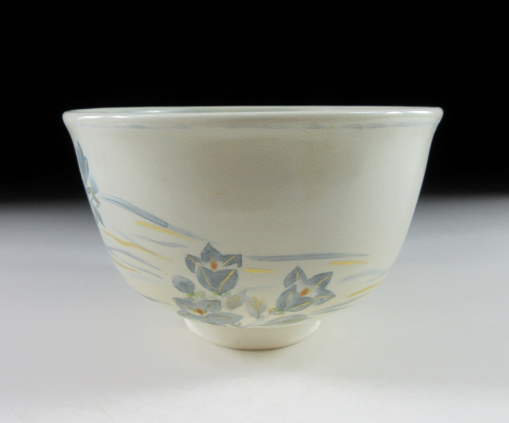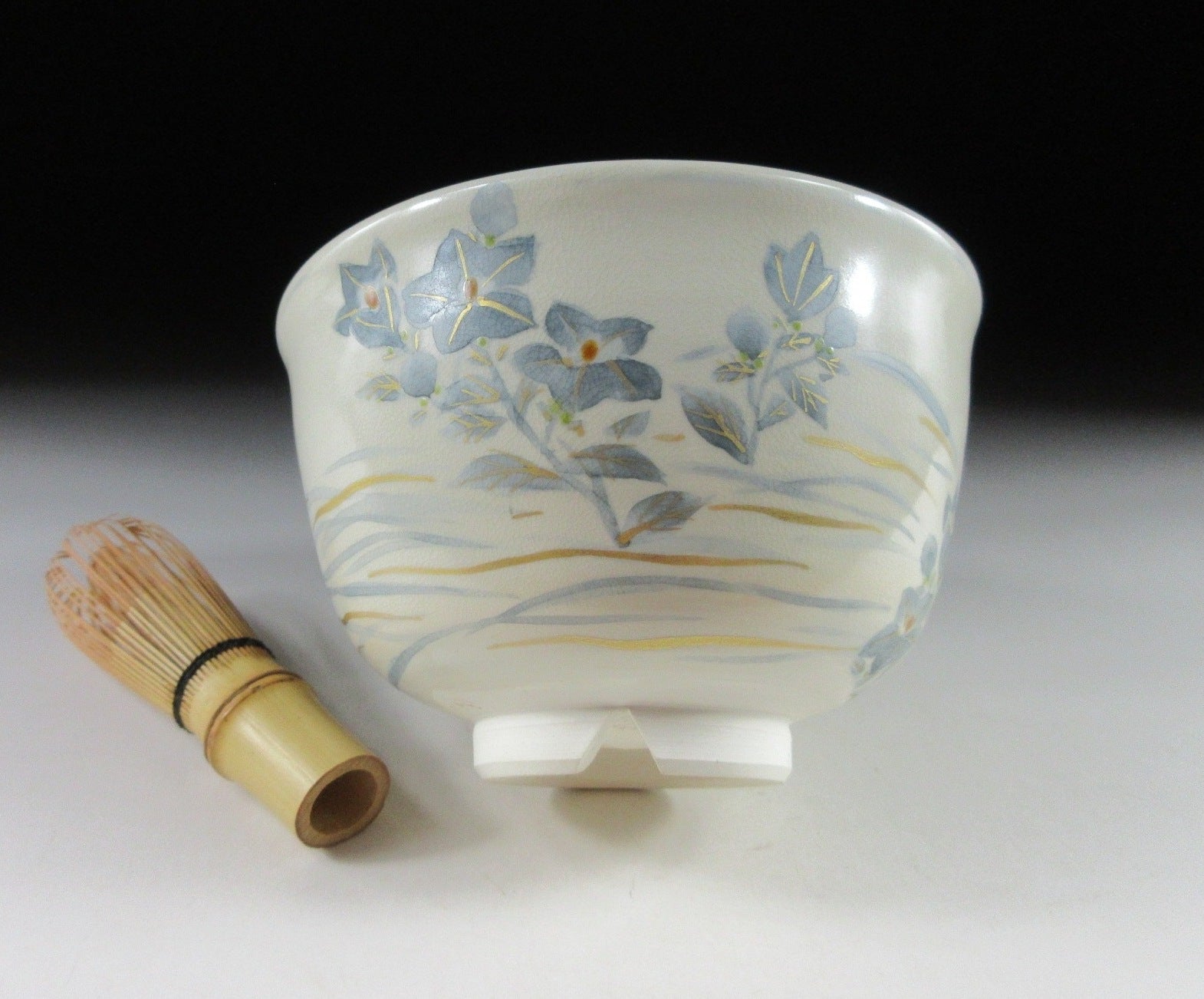 This listing is for a Kyo-ware chawan made around 30 years ago by Nakamura Juzan. It is wheel-thrown and decorated with hand-painted depictions of bellflowers. Bellflowers are one of the seven flowers of autumn, and are often used to decorate textiles, scrolls and tableware. The official seven flowers of autumn are bellflowers, pampas grass, kudzu, dianthus, golden lace, hemp agrimony, and bush clover. These seasonal favourites have been popular since the latter half of the eighth century when a collection of waka poems known as Manyo-shu were compiled by a waka poet named Yamanoue-no-Okura. The signature of the potter can be found on the bottom, and it comes with its original signed wooden storage box. It also comes with a stamped turmeric coloured wrapping cloth for when the item is not in use, as well as an outer paper storage box to protect the wooden tomobako. *PLEASE NOTE THAT THE CHASEN TEA WHISK IS NOT INCLUDED.