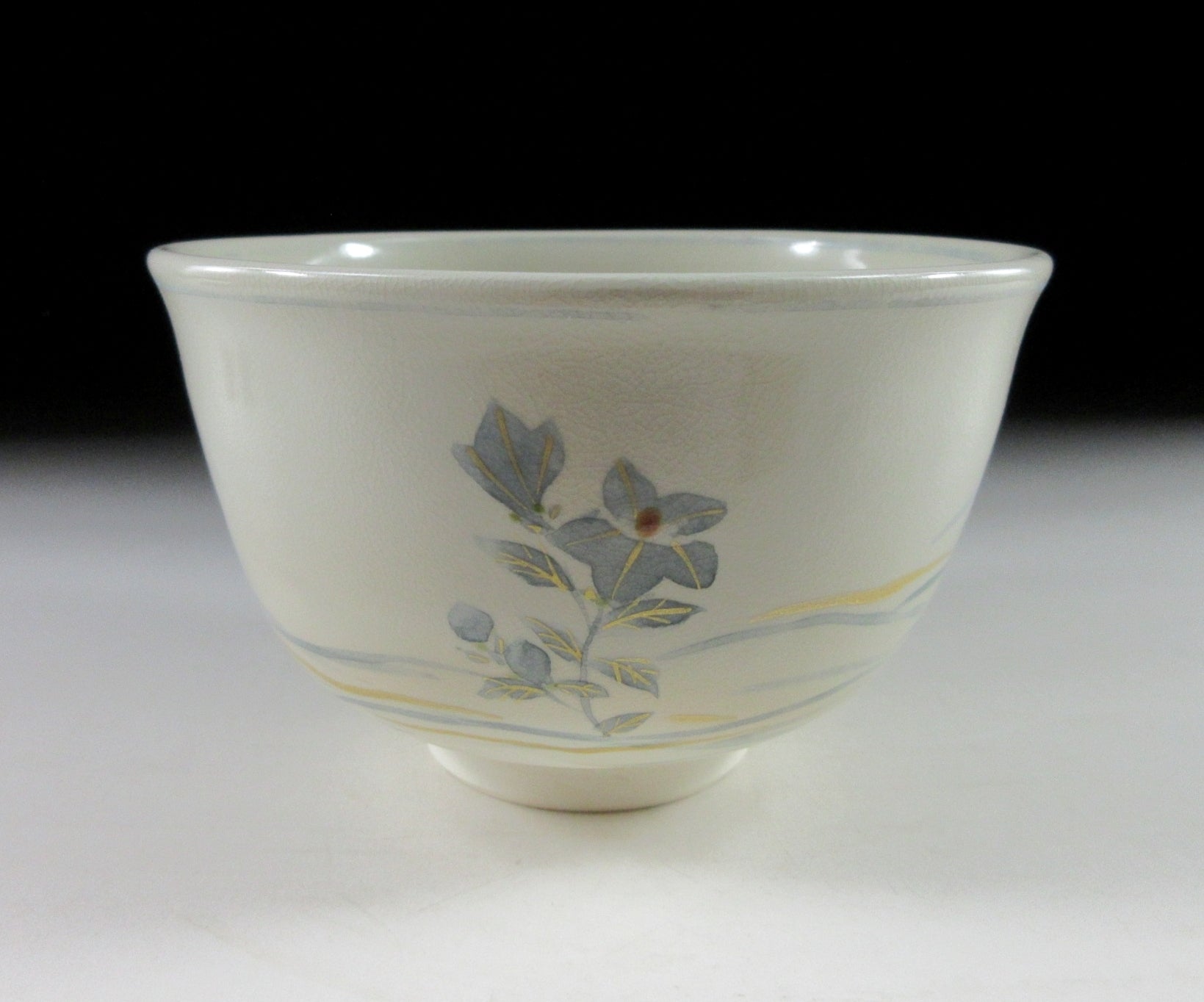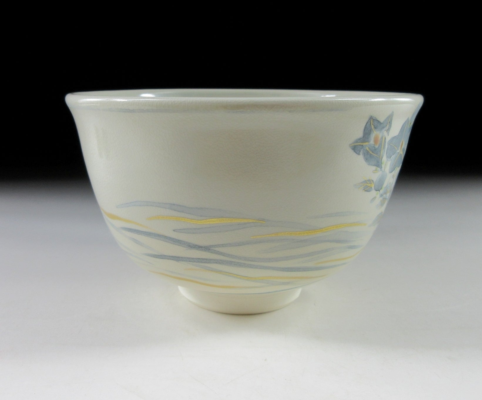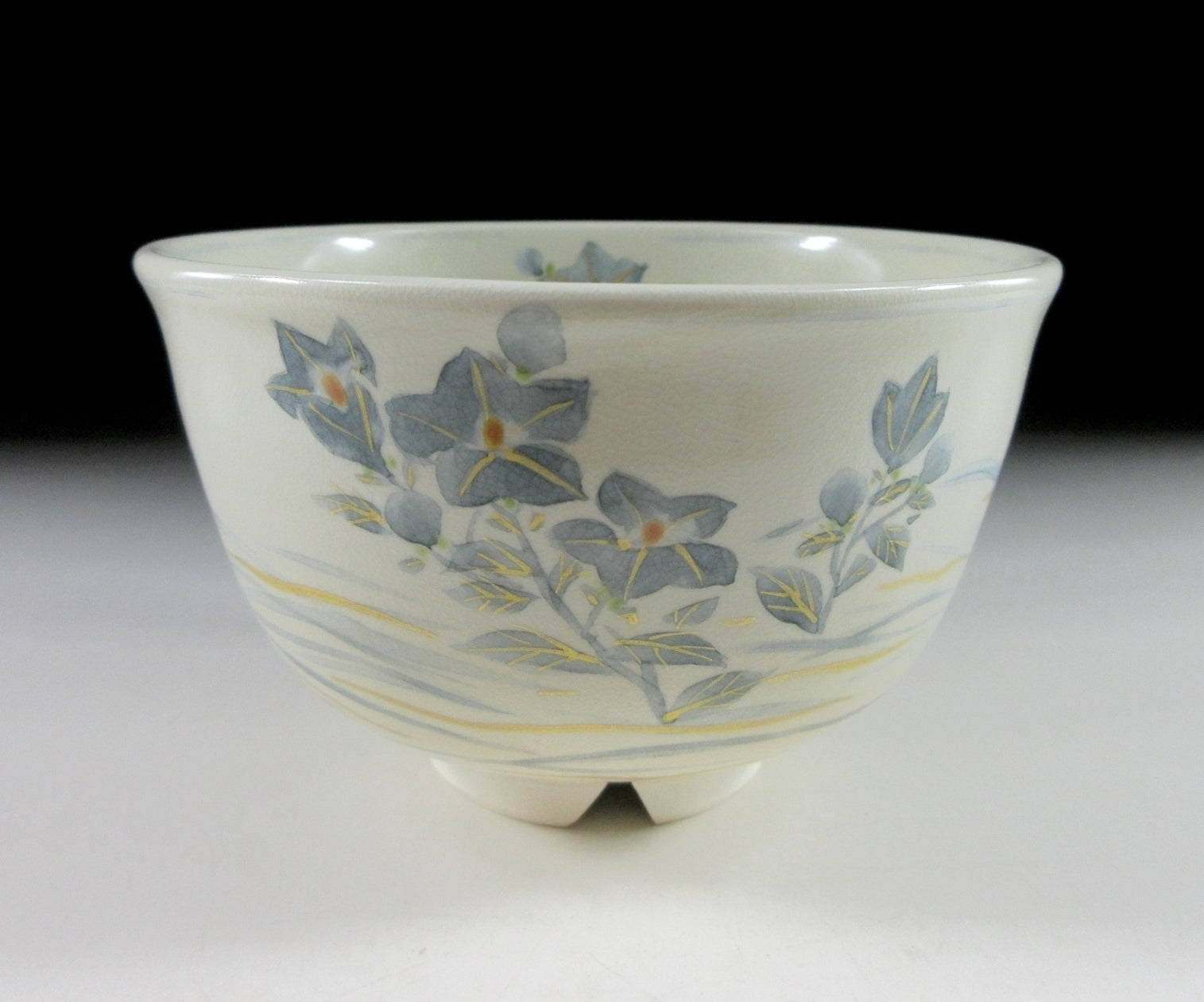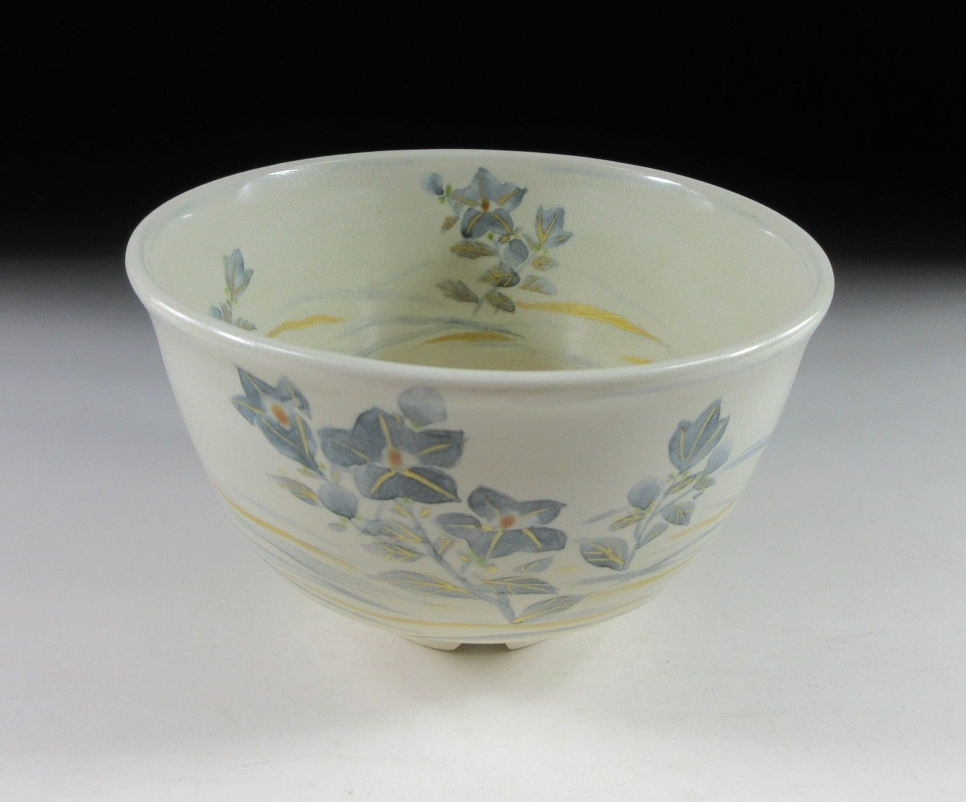This listing is for a Kyo-ware chawan made around 30 years ago by Nakamura Juzan. It is wheel-thrown and decorated with hand-painted depictions of bellflowers. Bellflowers are one of the seven flowers of autumn, and are often used to decorate textiles, scrolls and tableware. The official seven flowers of autumn are bellflowers, pampas grass, kudzu, dianthus, golden lace, hemp agrimony, and bush clover. These seasonal favourites have been popular since the latter half of the eighth century when a collection of waka poems known as Manyo-shu were compiled by a waka poet named Yamanoue-no-Okura. The signature of the potter can be found on the bottom, and it comes with its original signed wooden storage box. It also comes with a stamped turmeric coloured wrapping cloth for when the item is not in use, as well as an outer paper storage box to protect the wooden tomobako. *PLEASE NOTE THAT THE CHASEN TEA WHISK IS NOT INCLUDED.