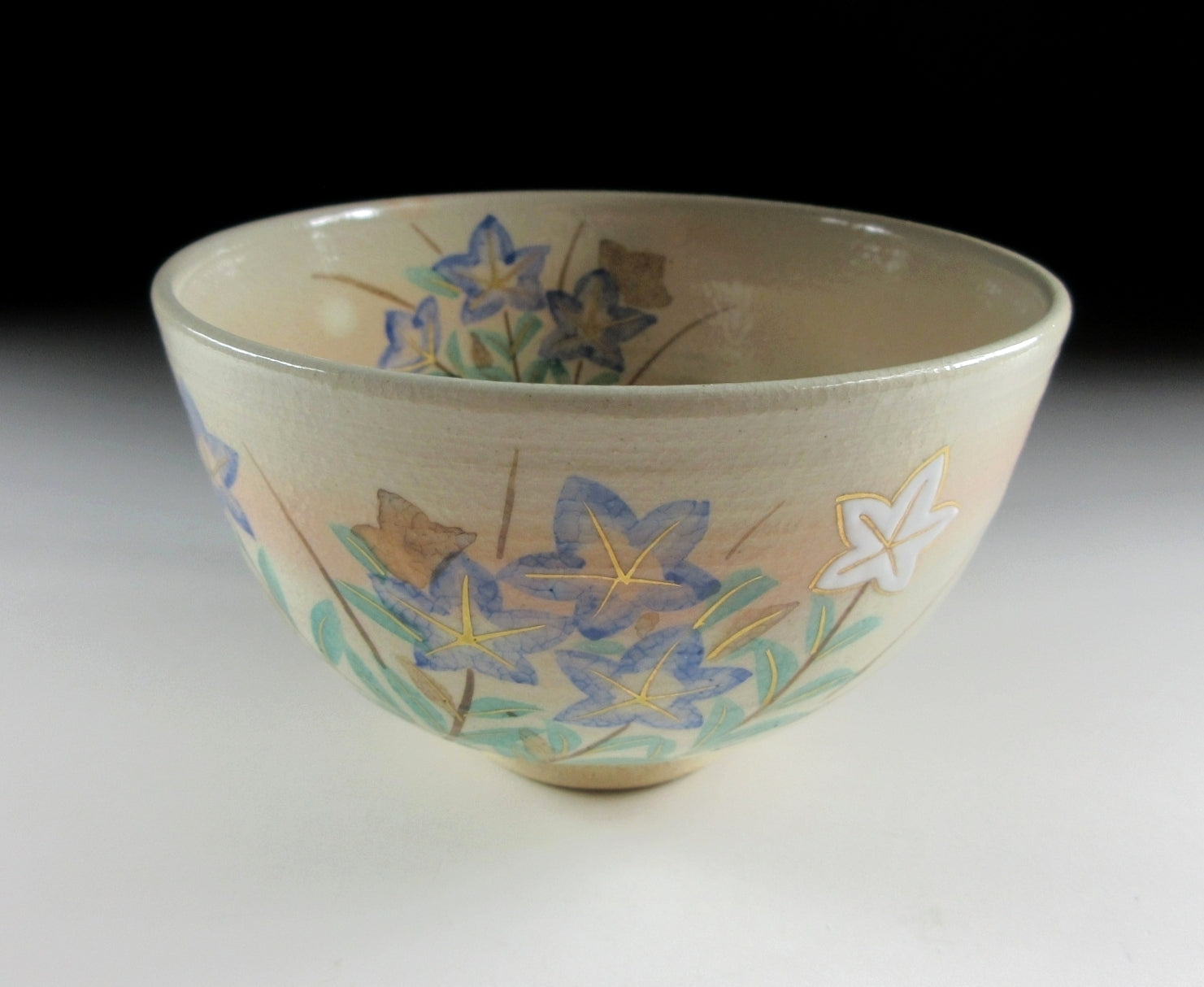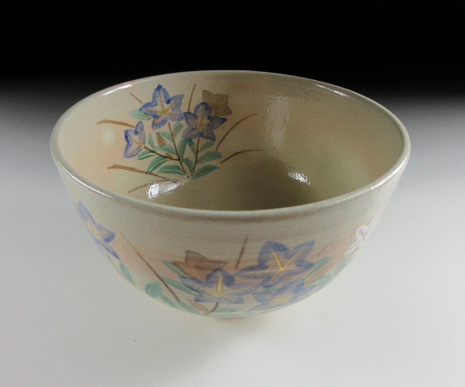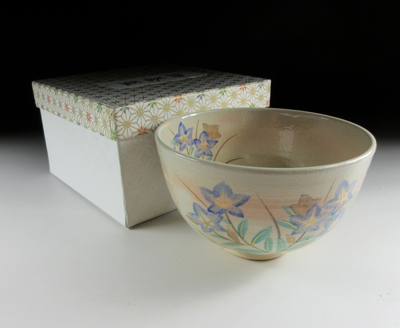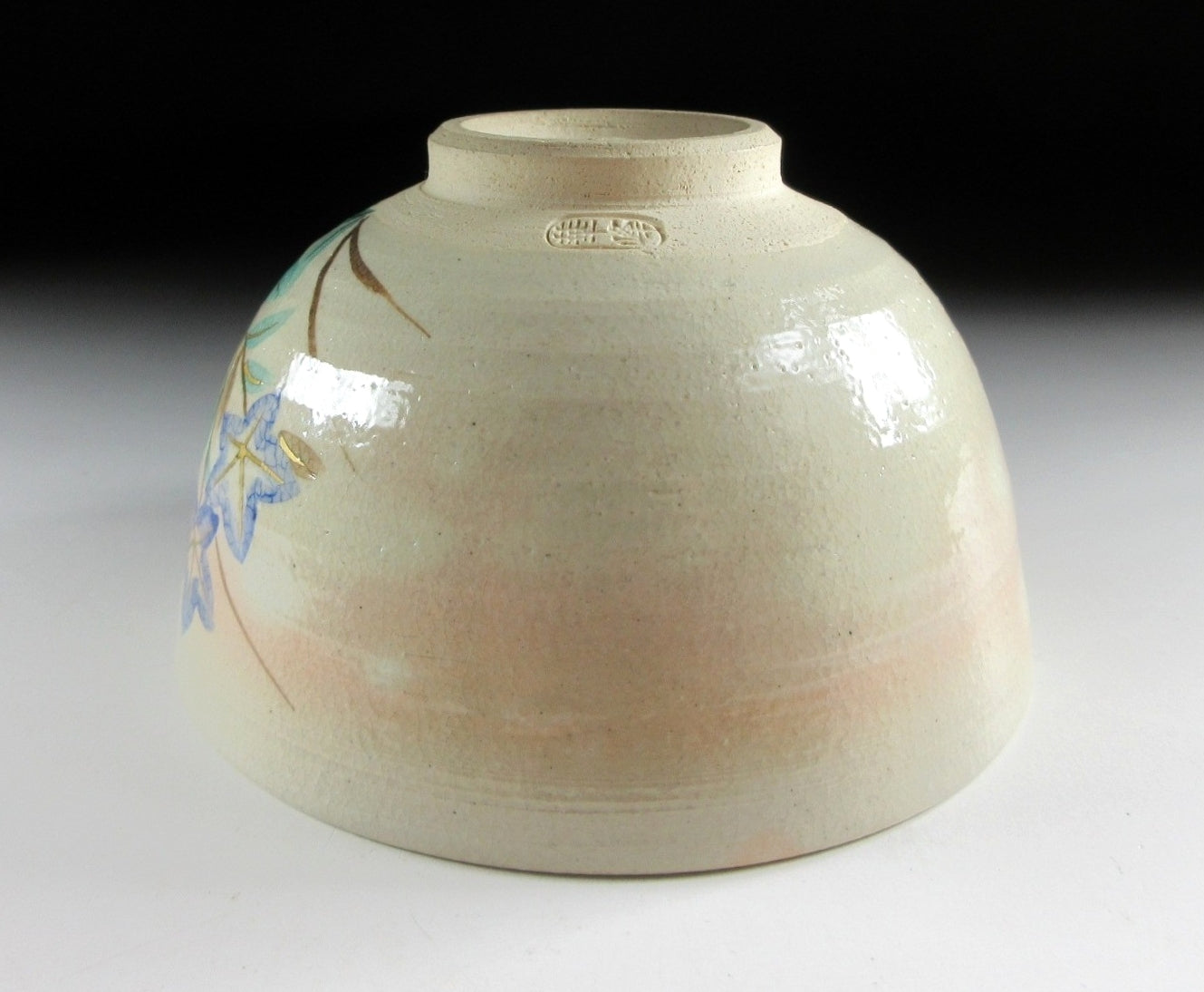This listing is for a seasonal Kyo-ware chawan made around 20 years ago by Nakamura Kaho. It is wheel-thrown and the front and interior is decorated with blue and white bellflowers. The exterior is blushed with pink and features gohonte markings. Gohonte refers to the pale spots that appear on the pottery due to the natural reactions from the iron found in the clay when being fired in the kiln. This piece has beautiful soft colours and will take you right through autumn. The stamp of the potter can be found on the bottom, and it comes with its original paper storage box.