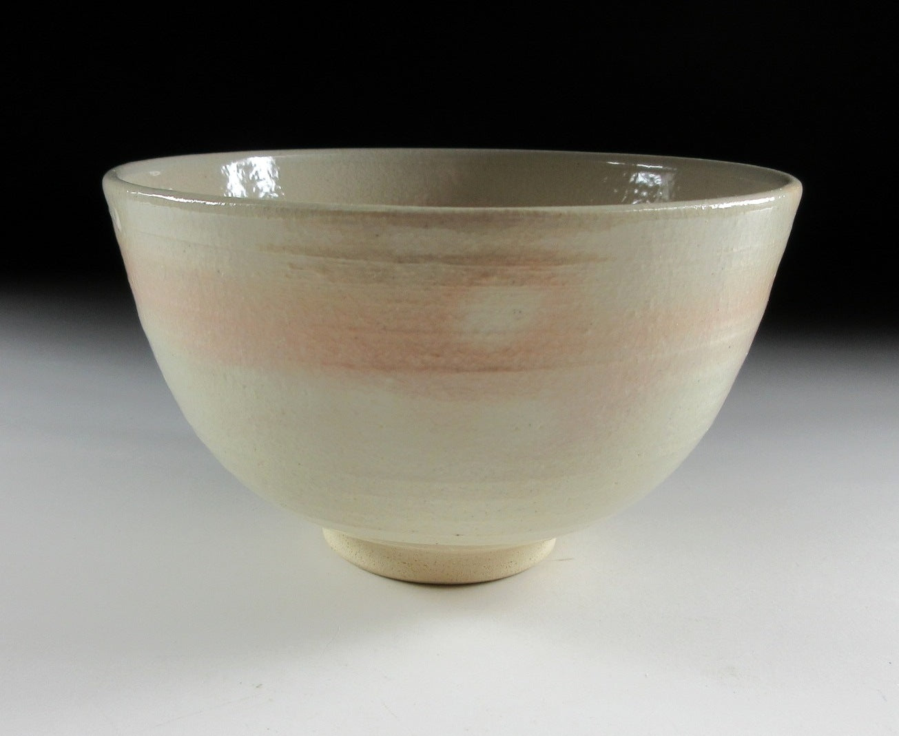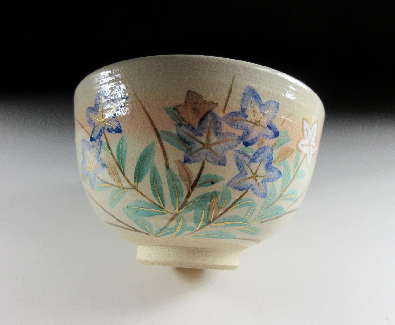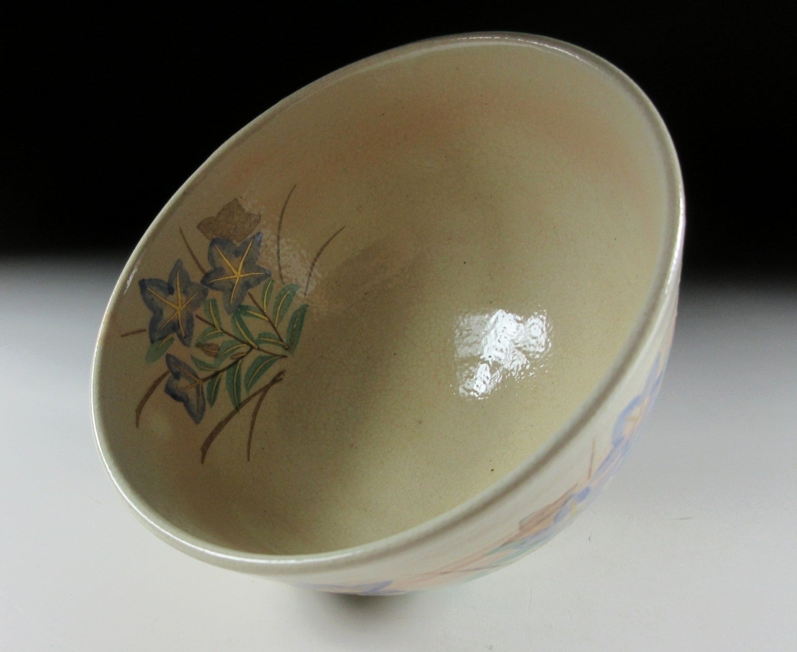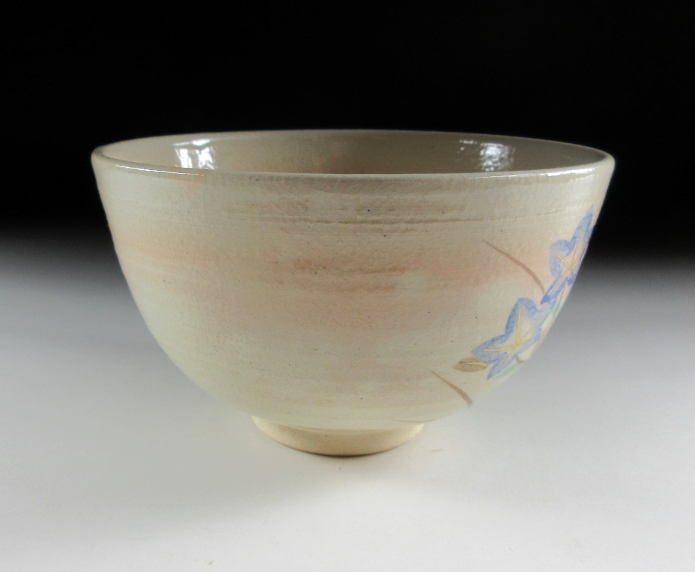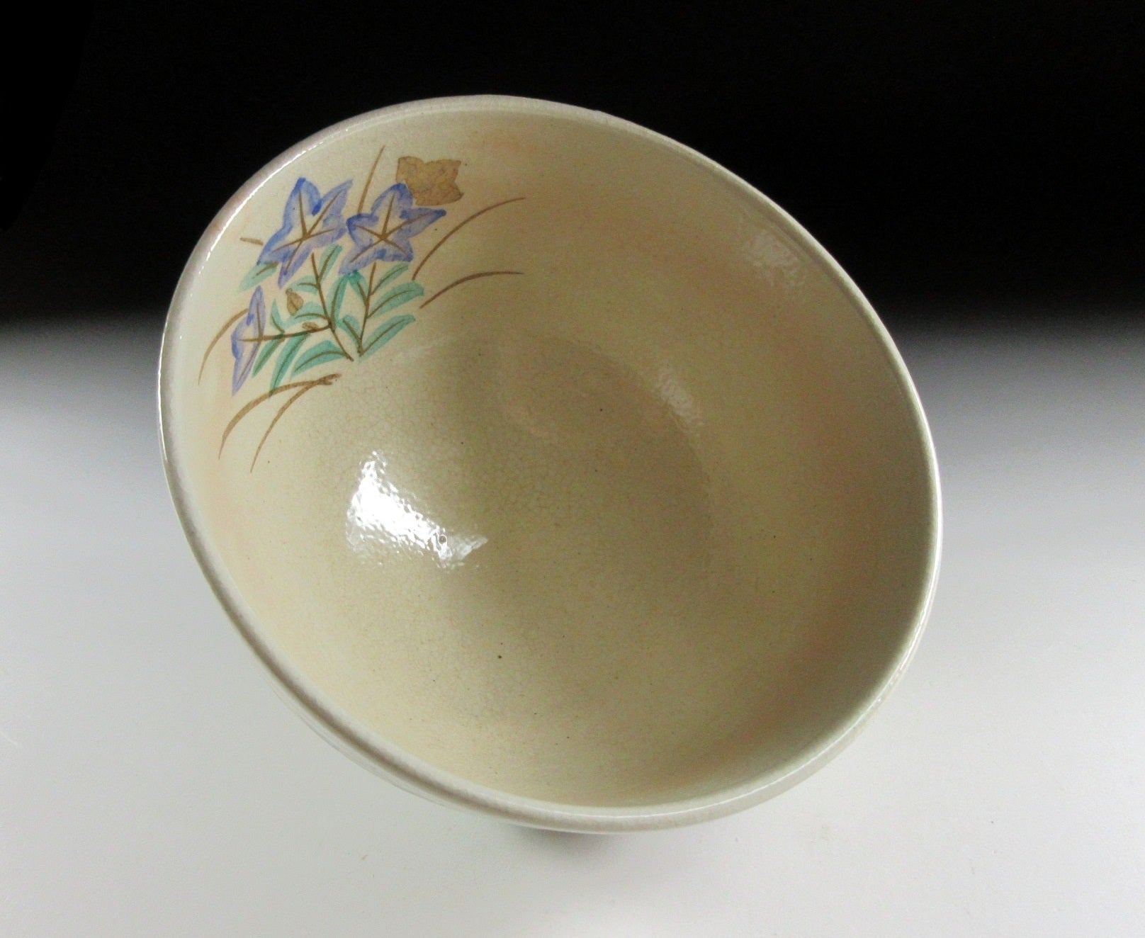 This listing is for a seasonal Kyo-ware chawan made around 20 years ago by Nakamura Kaho. It is wheel-thrown and the front and interior is decorated with blue and white bellflowers. The exterior is blushed with pink and features gohonte markings. Gohonte refers to the pale spots that appear on the pottery due to the natural reactions from the iron found in the clay when being fired in the kiln. This piece has beautiful soft colours and will take you right through autumn. The stamp of the potter can be found on the bottom, and it comes with its original paper storage box.