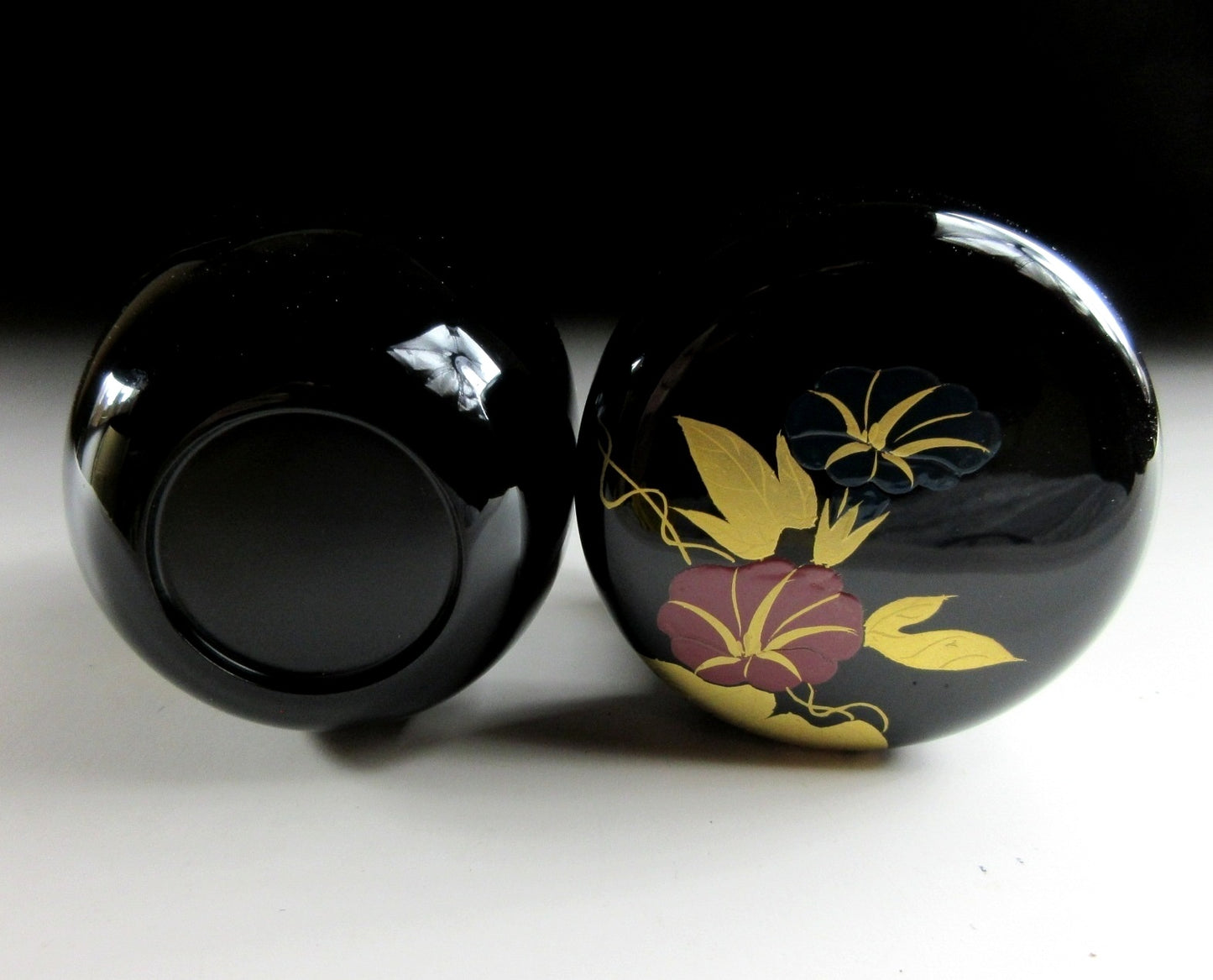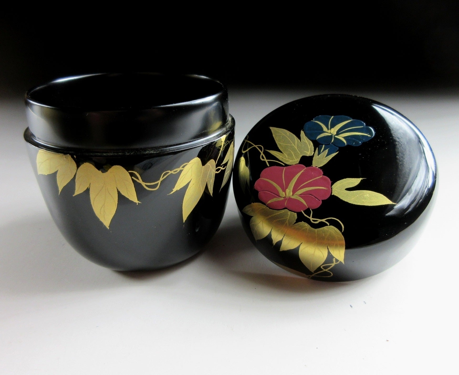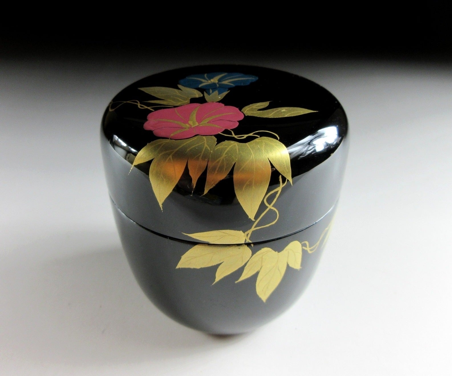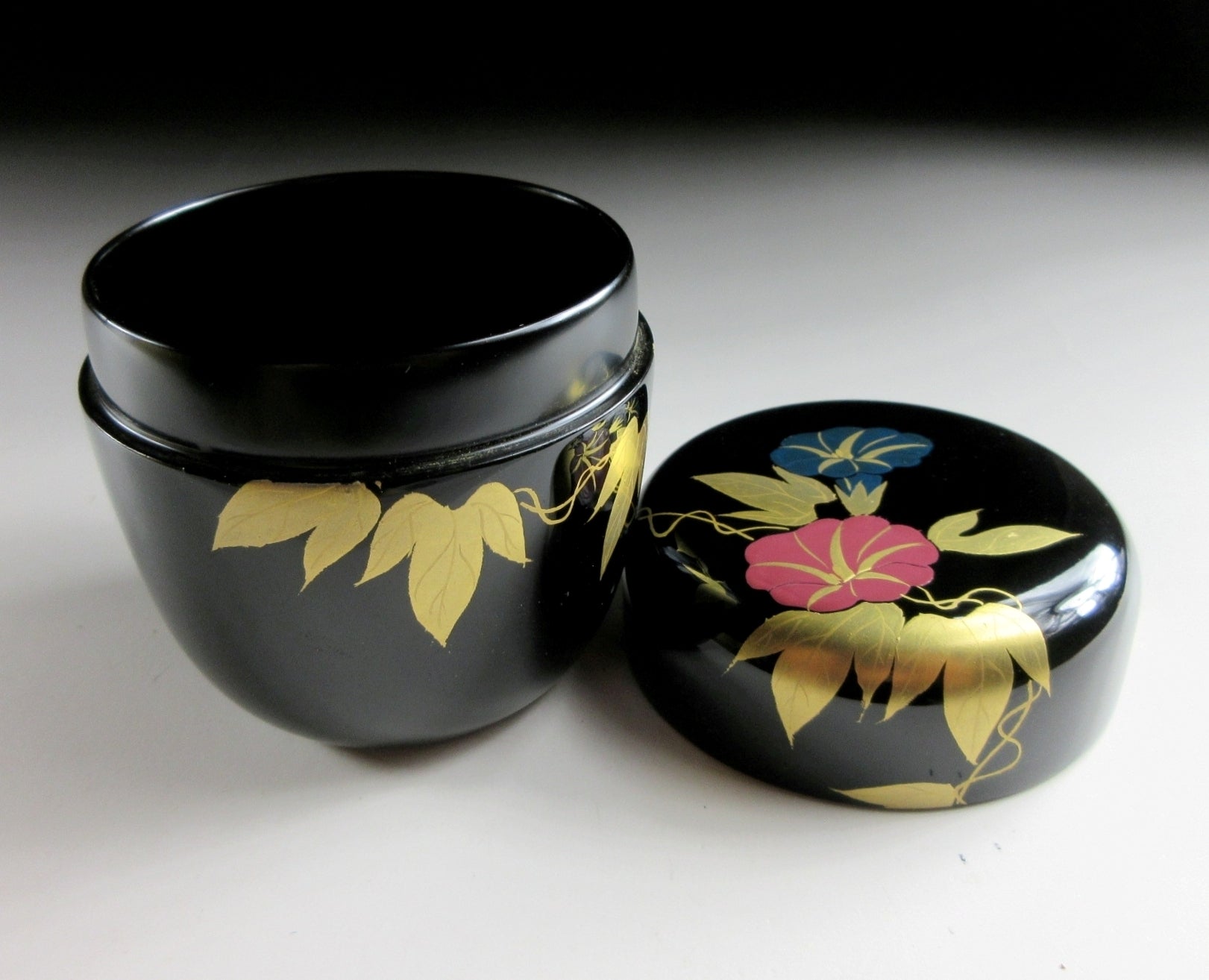 This listing is for a very beautiful natsume made around 20 years ago by makie artist Nakamura Kaho. It is made of wood and features hand-painted morning glory blossoms over a black lacquered base. Gold leaves and tendrils spill over on one side, thus bringing the vine to life. This piece is as beautiful as a summer haiku, and one of Nakamura’s finest. It comes with its original signed wooden storage box, as well as a turmeric coloured wrapping cloth for when the item is not in use.