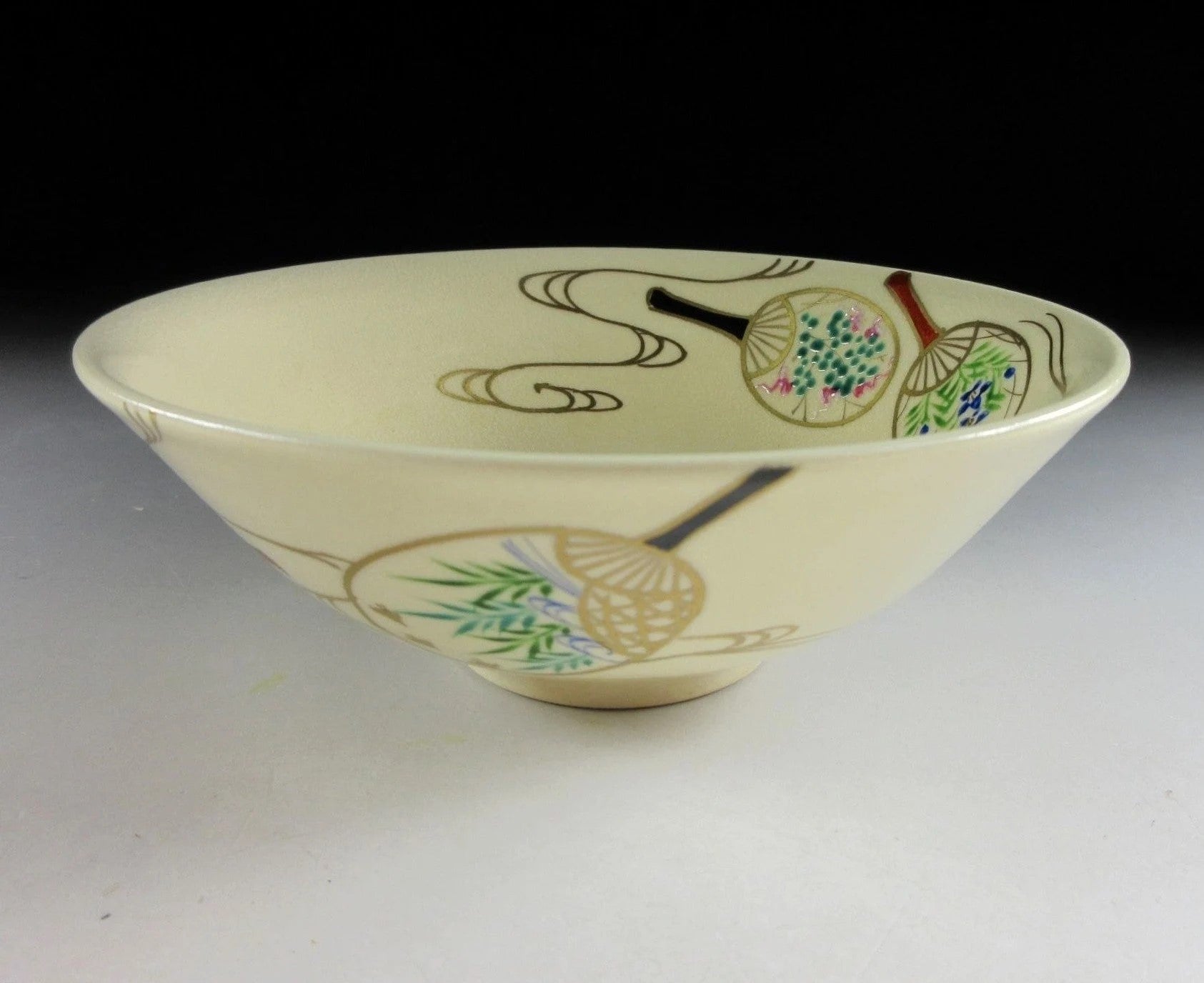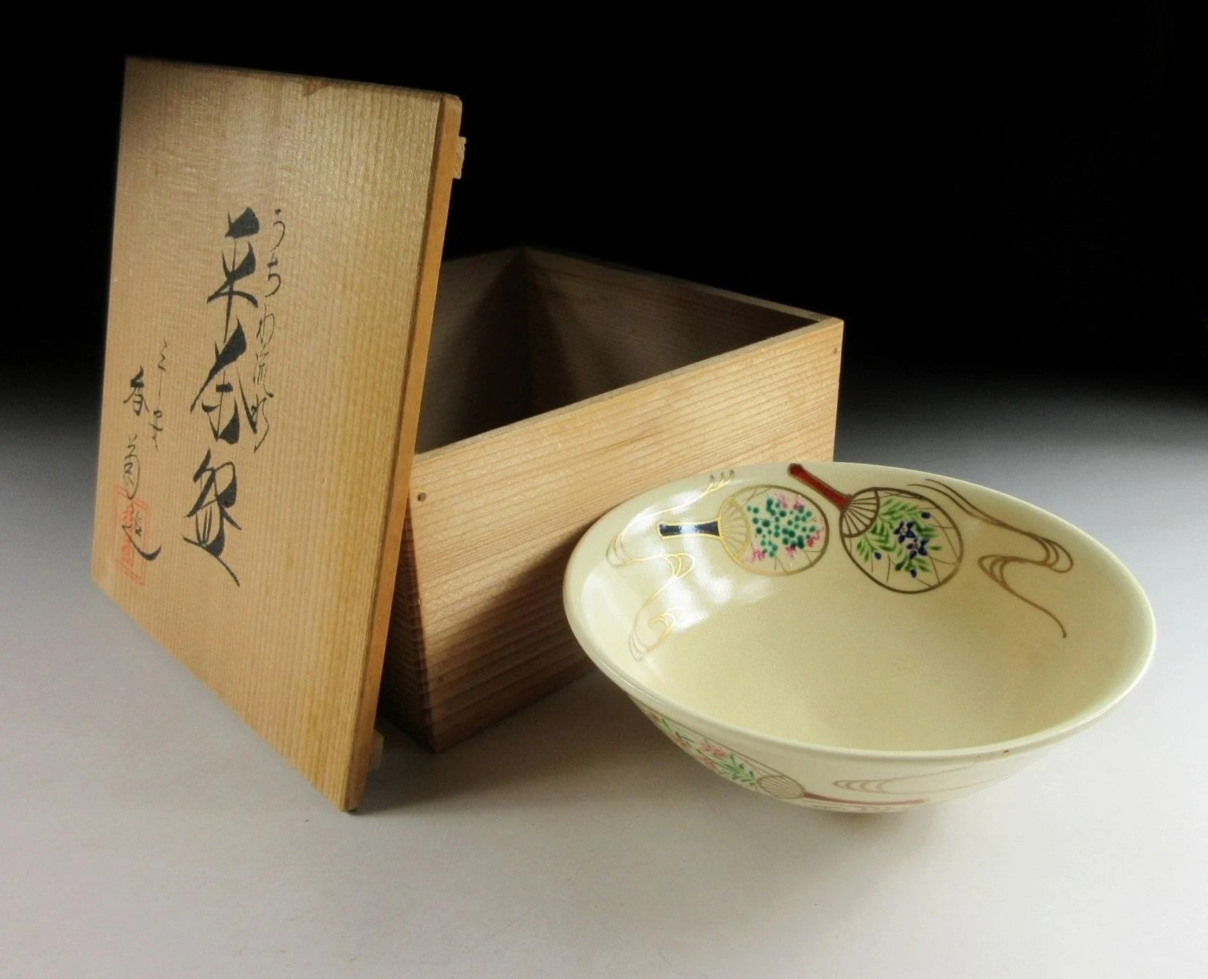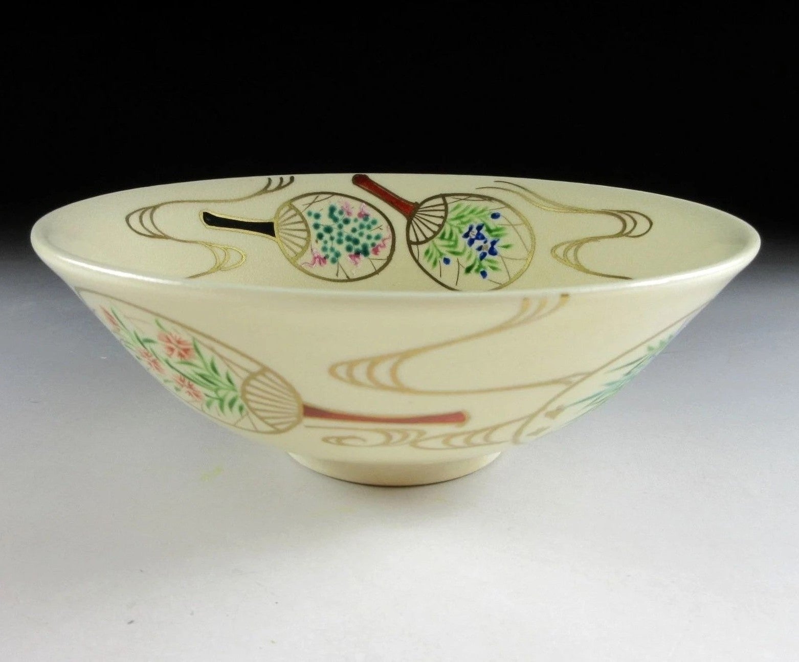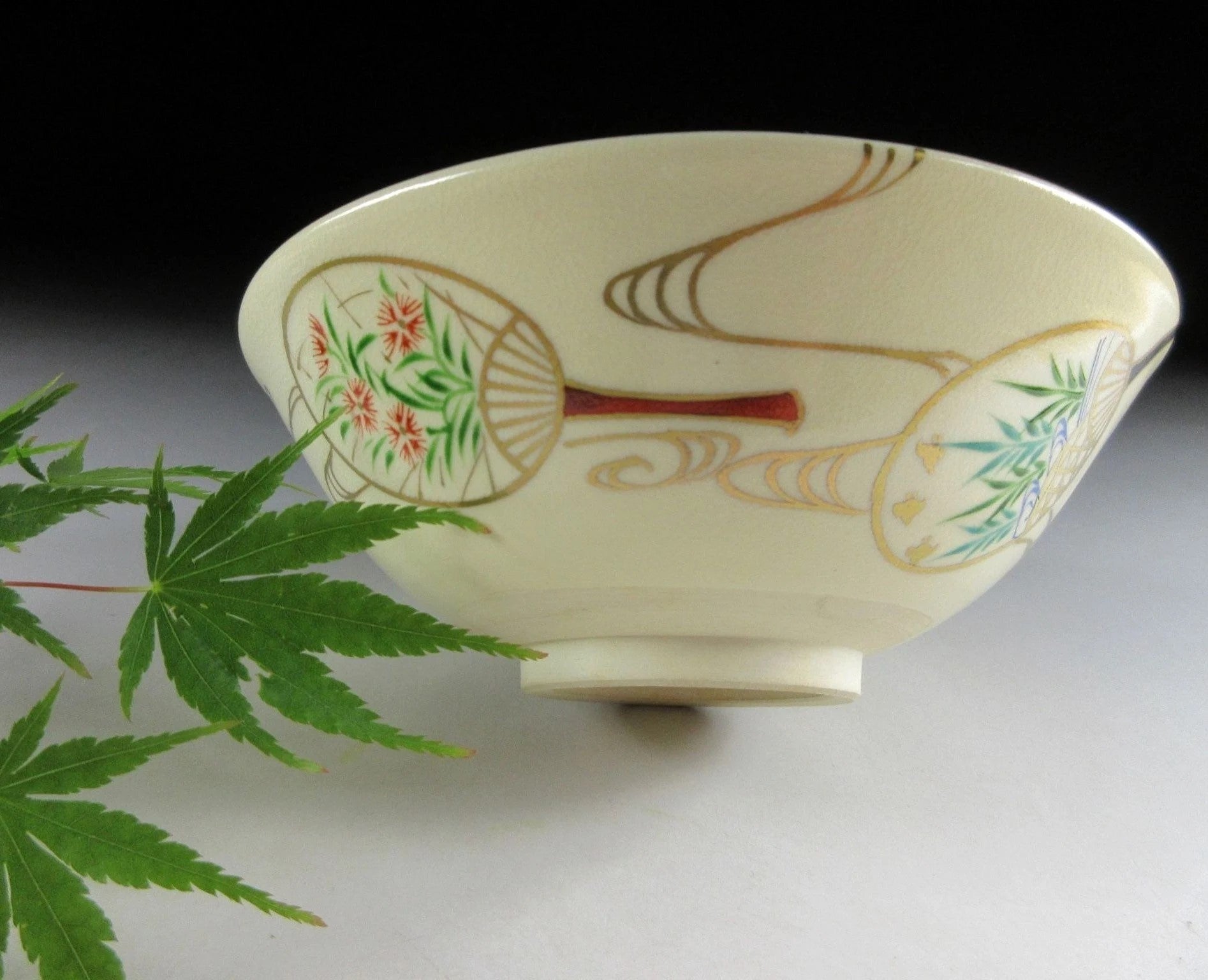 This listing is for a Kyo-ware hira chawan made around 20-30 years ago by Nakamura Kogiku. It is wheel-thrown and the flat hira type used during the summer season. Hira chawan are shallow bowls with low sides designed to cool tea down faster. Also Kyo-ware potters tend to put more focus on decorating the interior, as this part is readily seen by the tea drinker. The bowl in this listing is decorated with hand-painted uchiwa fans, a very apt design for summer. The stamp of the potter can be found on the bottom, and comes with its original wooden storage box.