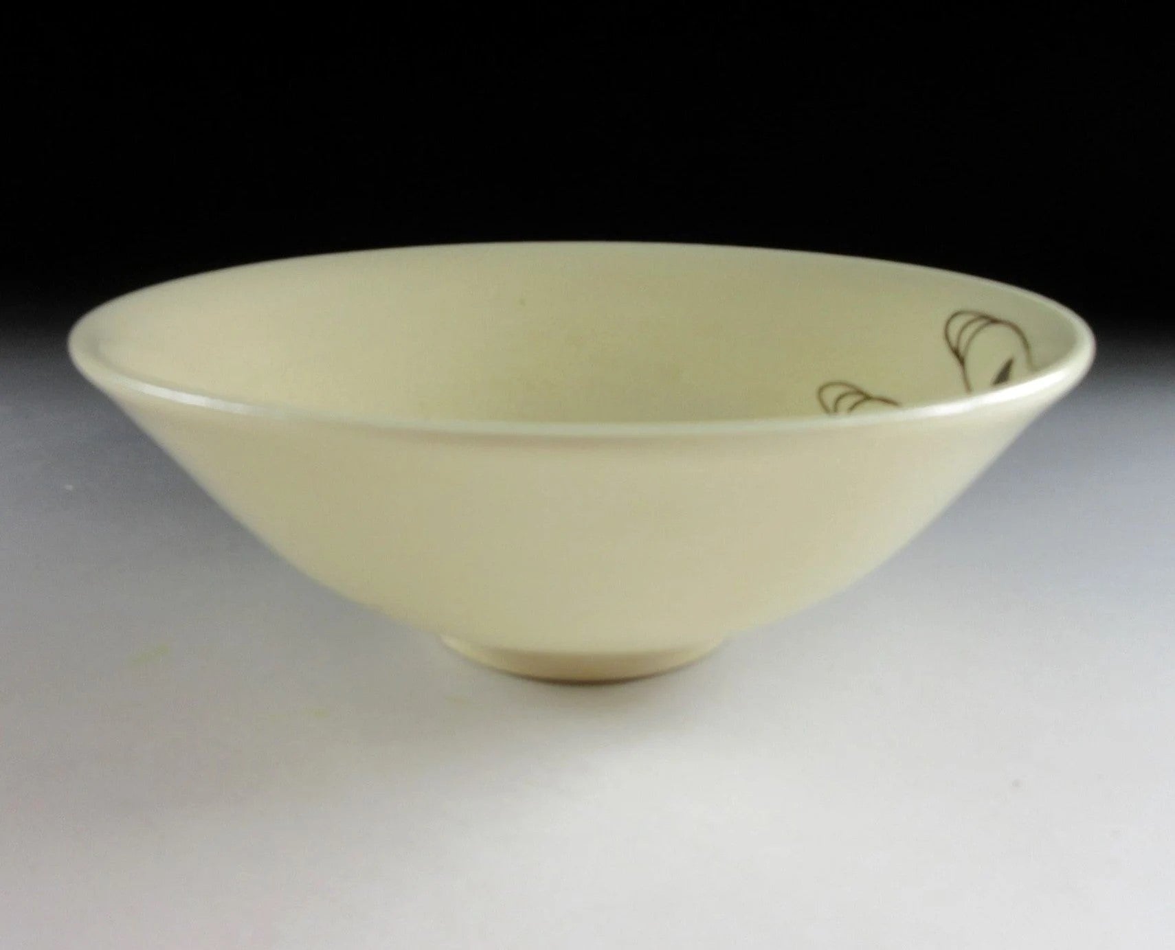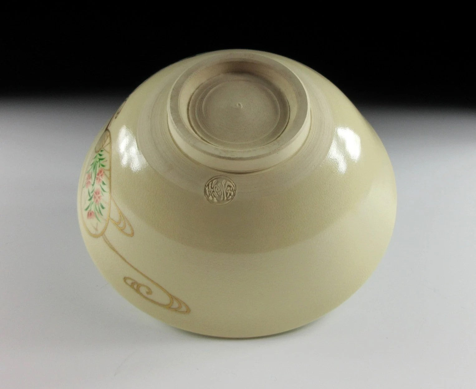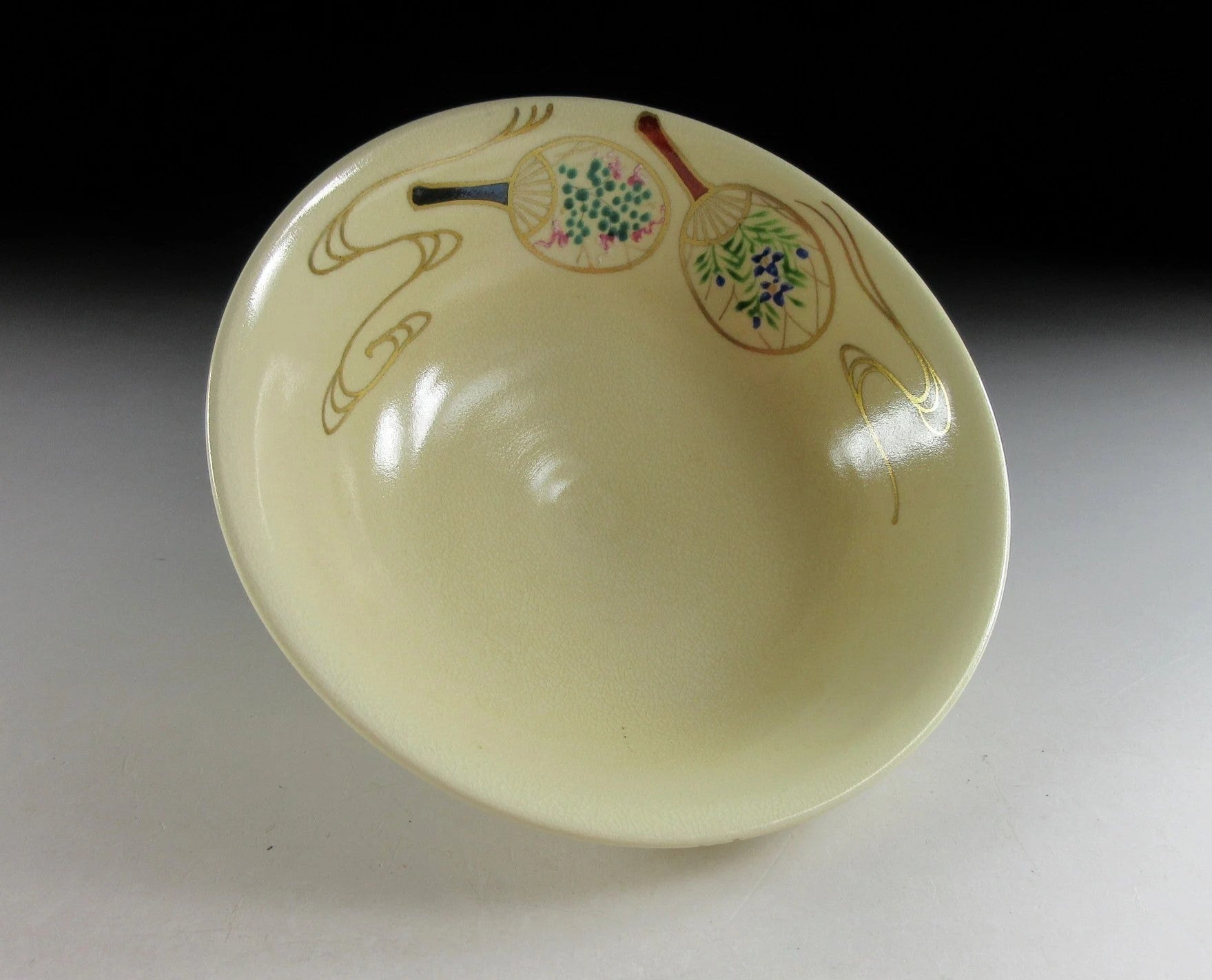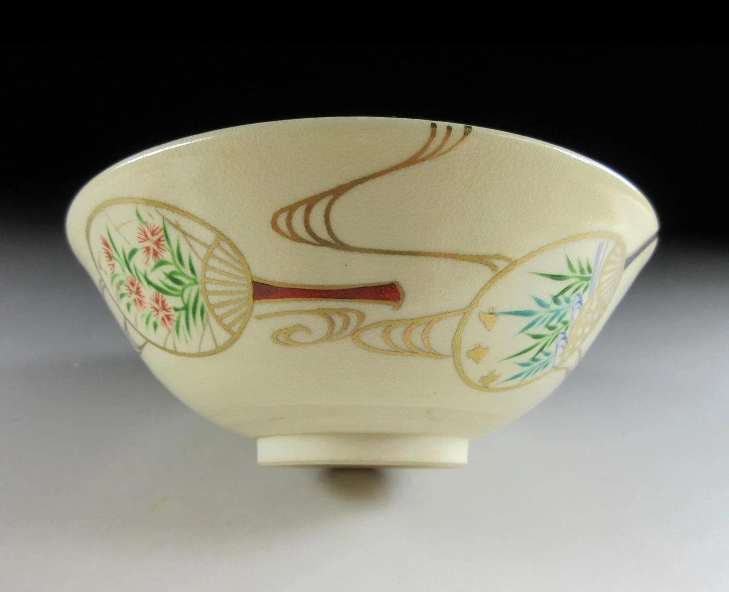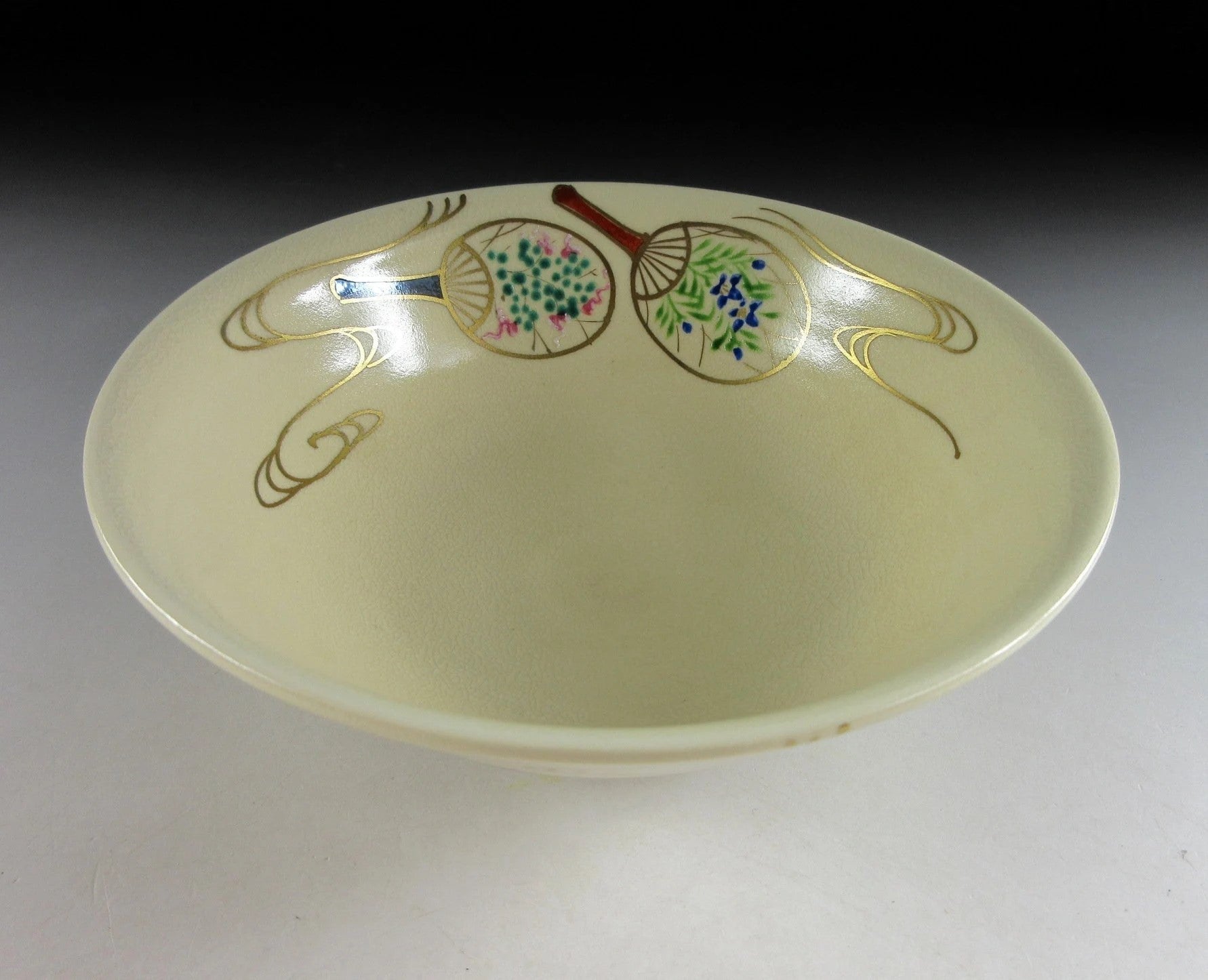 This listing is for a Kyo-ware hira chawan made around 20-30 years ago by Nakamura Kogiku. It is wheel-thrown and the flat hira type used during the summer season. Hira chawan are shallow bowls with low sides designed to cool tea down faster. Also Kyo-ware potters tend to put more focus on decorating the interior, as this part is readily seen by the tea drinker. The bowl in this listing is decorated with hand-painted uchiwa fans, a very apt design for summer. The stamp of the potter can be found on the bottom, and comes with its original wooden storage box.