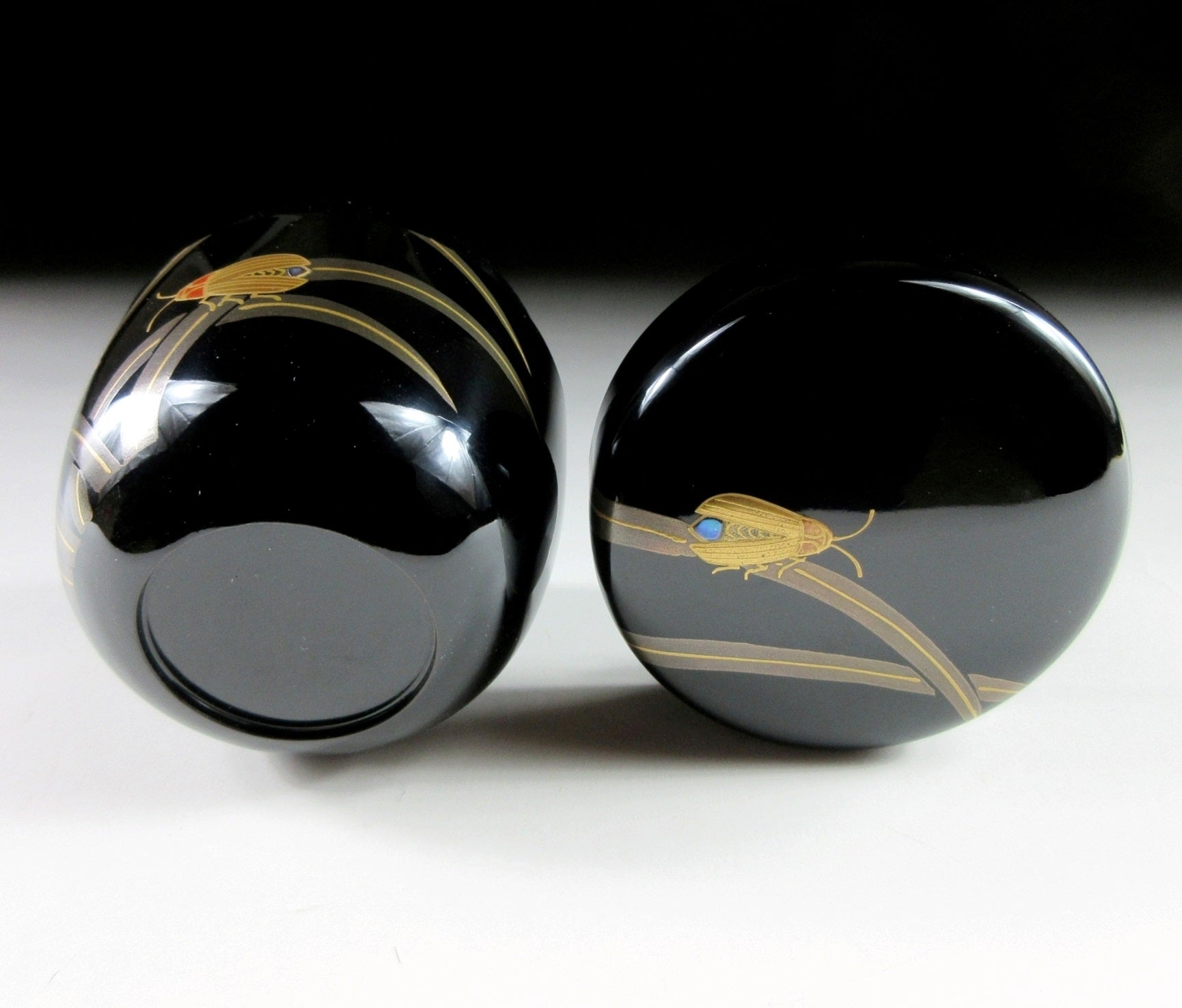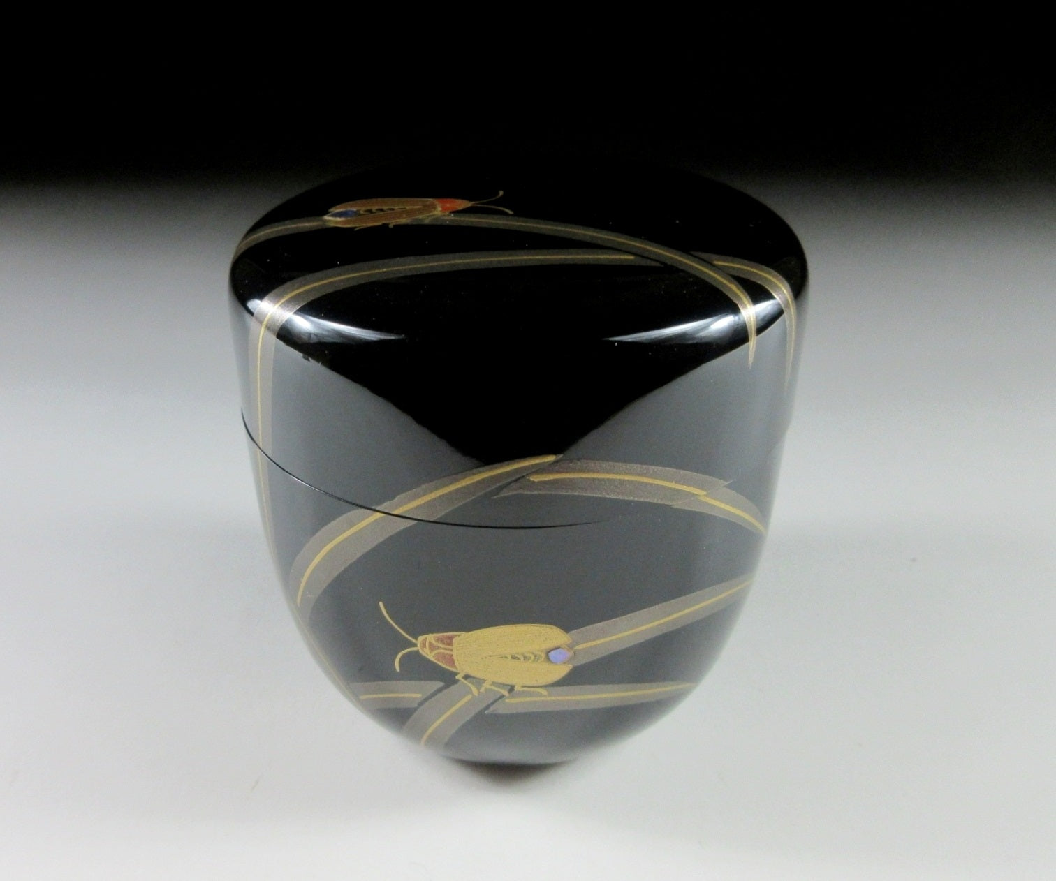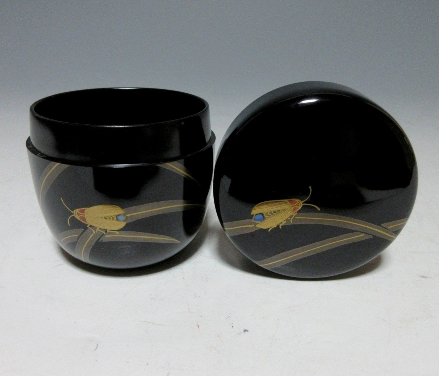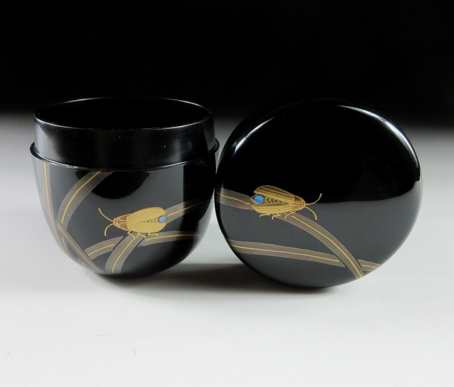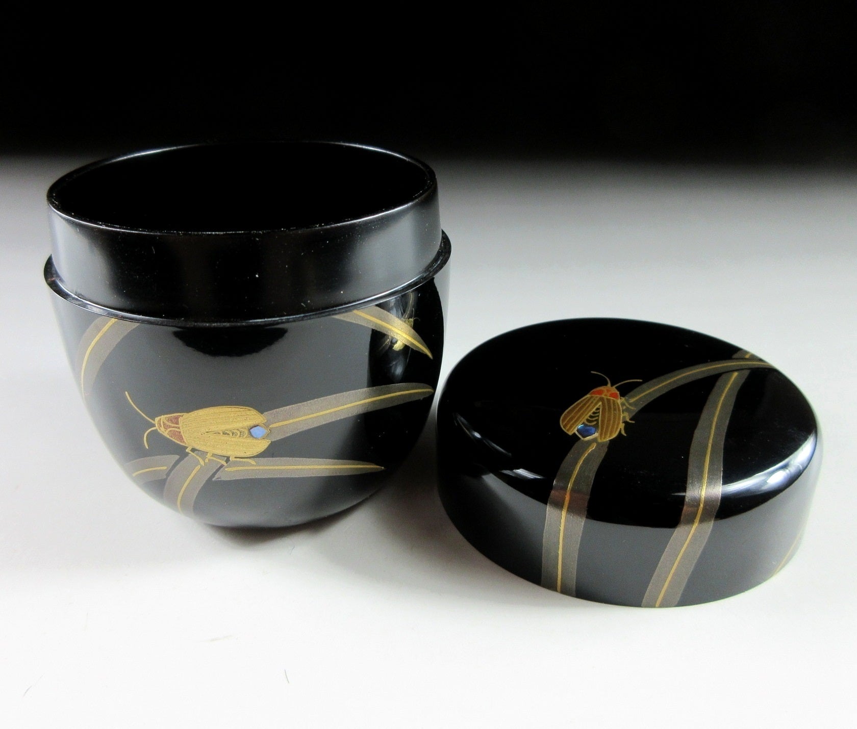 This listing is for a well crafted natsume made around 20 years ago by highly respected lacquerware artist Nakamura Kyozo. It is made of wood and features hand-painted makie fireflies over a black lacquered base. A popular pastime during the rainy season is to go ‘hotaru-gari’, which means hunting for fireflies. Fireflies inhabit small streams and rice fields, and they have appeared in Japanese literature dating back to the 8th century. This is a lovely piece for the summer season. It comes with its original signed wooden storage box, as well as a turmeric coloured wrapping cloth for when the item is not in use.