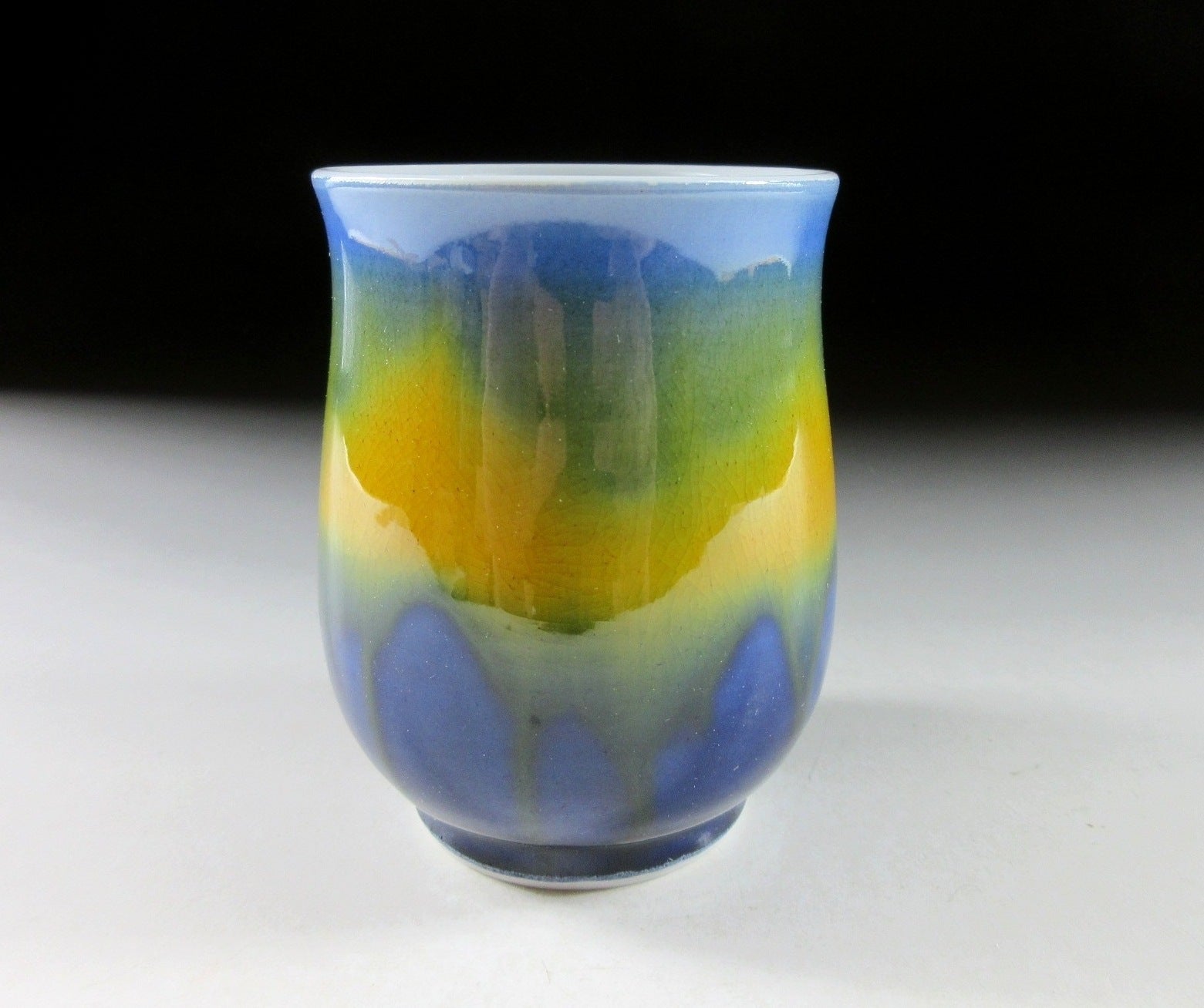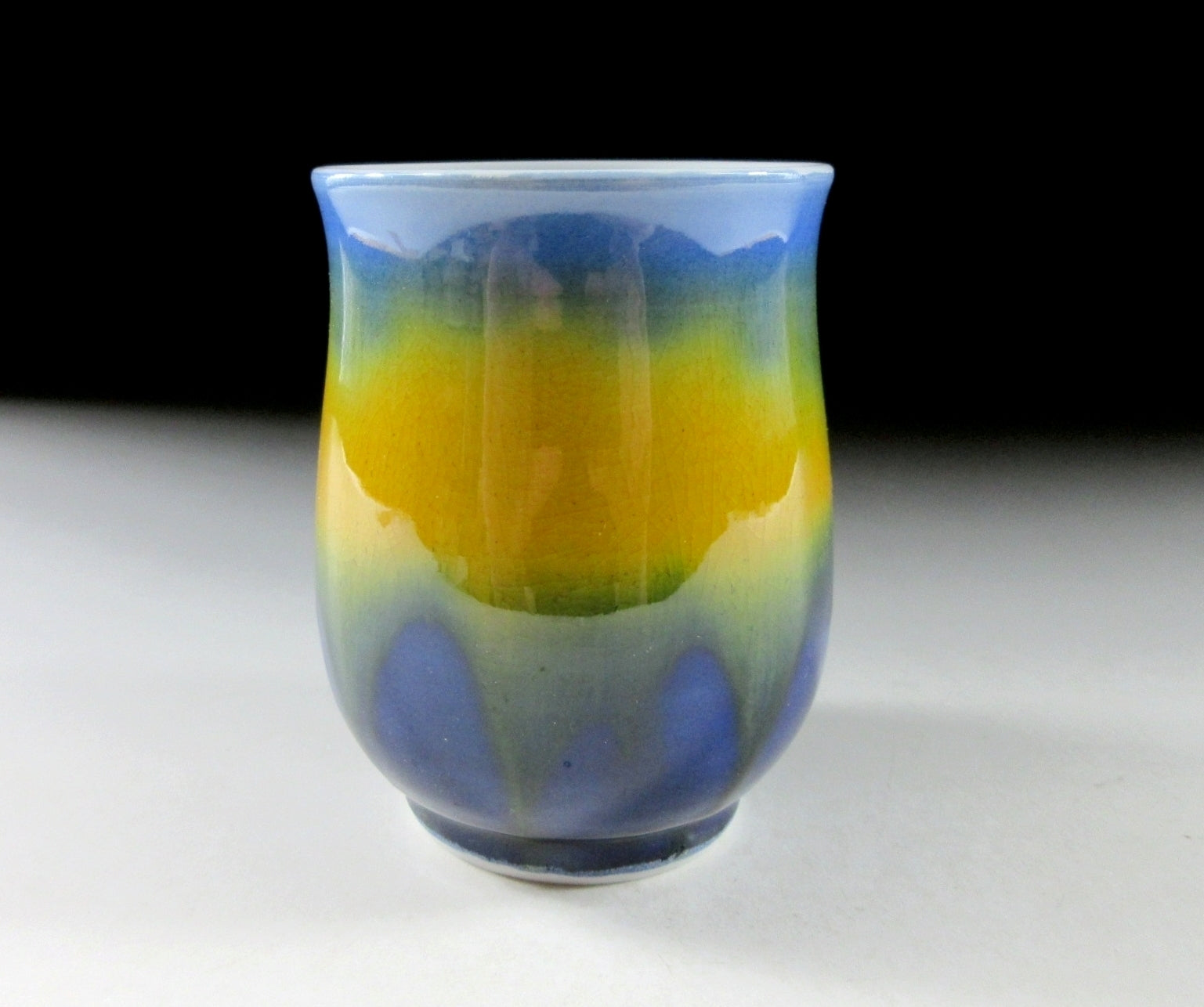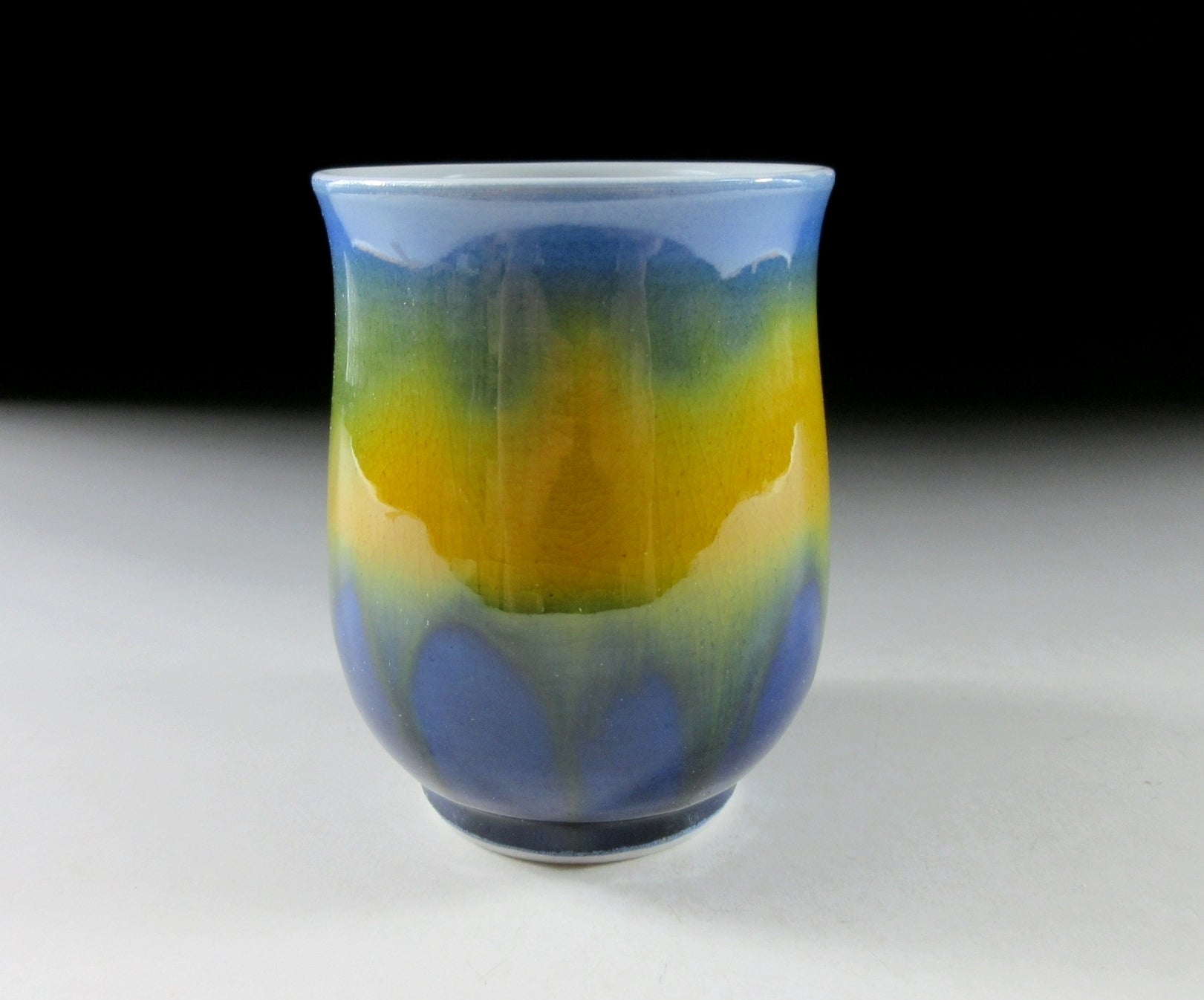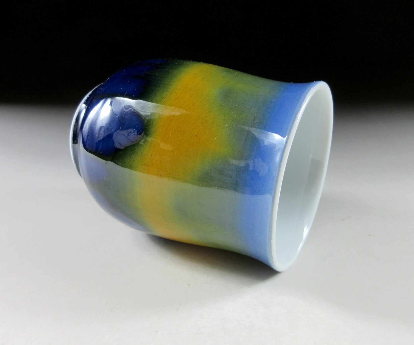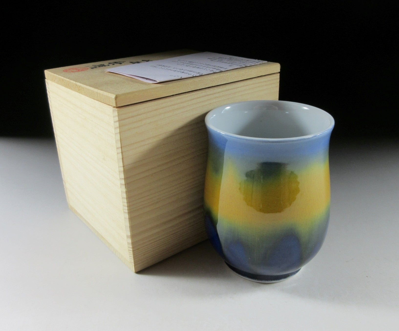 This listing is for a splendid Kutani-ware yunomi tea cup made around 10 years ago by noted potter Nakamura Shutoh V. It is wheel-thrown and features beautiful blue and yellow saiyu glaze. This particular style of glaze is more commonly associated with Living National Treasure Tokuda Yasokichi, it has the same vibrancy and just as much appeal. The interior of the cup is white, and the signature of the potter can be found on the bottom. It comes with its original signed wooden storage box and a Japanese language profile paper about the potter.