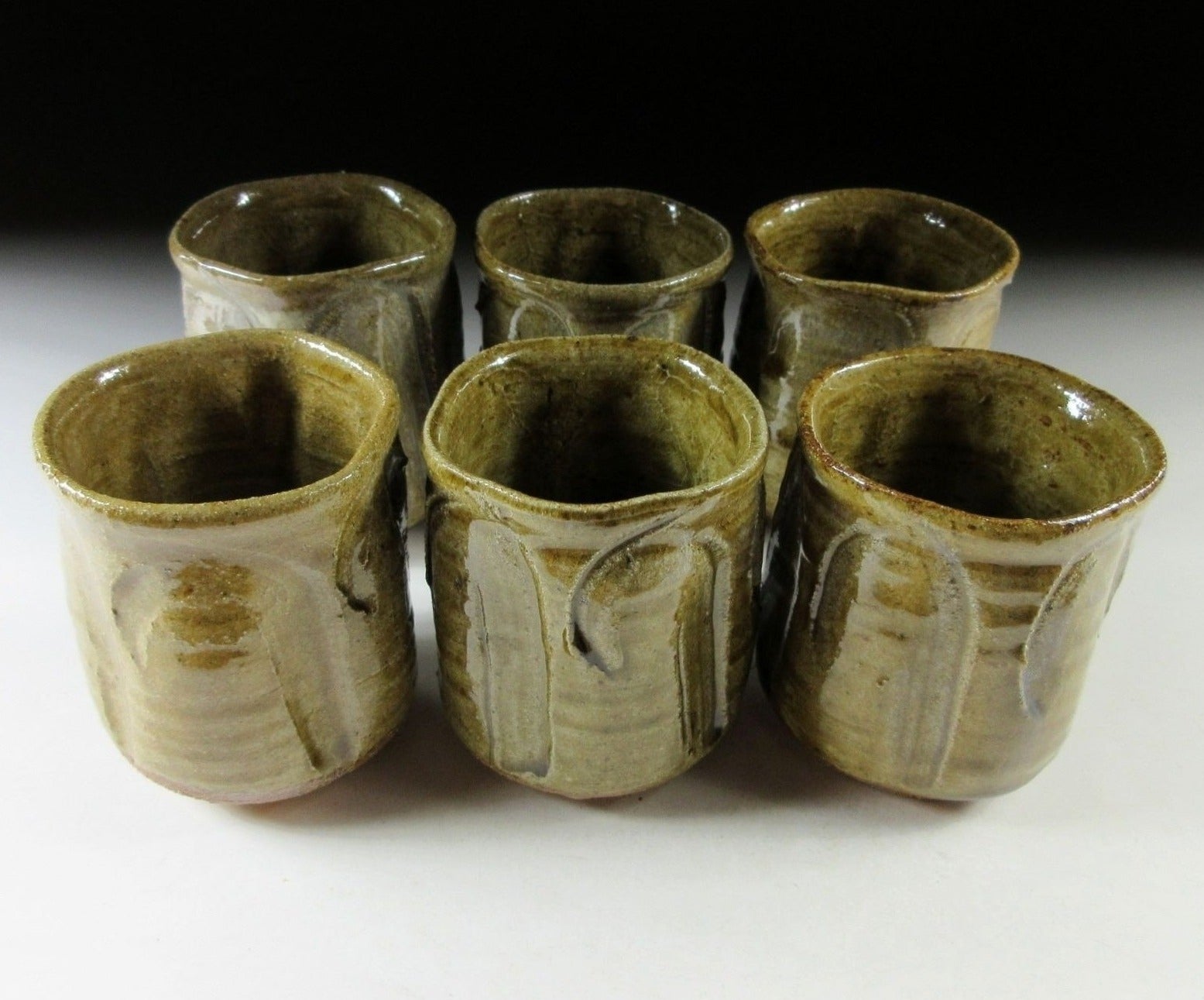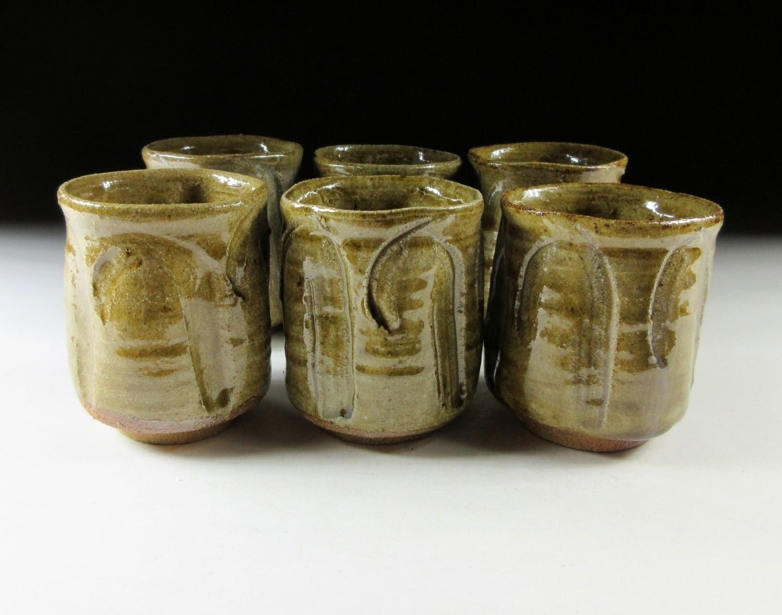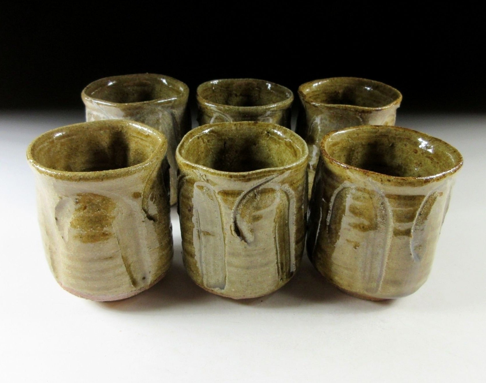 This listing is for a set of six Karatsu-ware yunomi tea cups made around 40-50 years ago by Living National Treasure, Nakazato Taroemon XII. They are wheel-thrown and coated in natural ash glaze. The sides are decorated with incised line patterns, and each cup has a squarish shape. The three dot stamp of the potter can be found on the bottom of each cup, and they come with their original signed wooden storage box. They also come with a Japanese language profile.