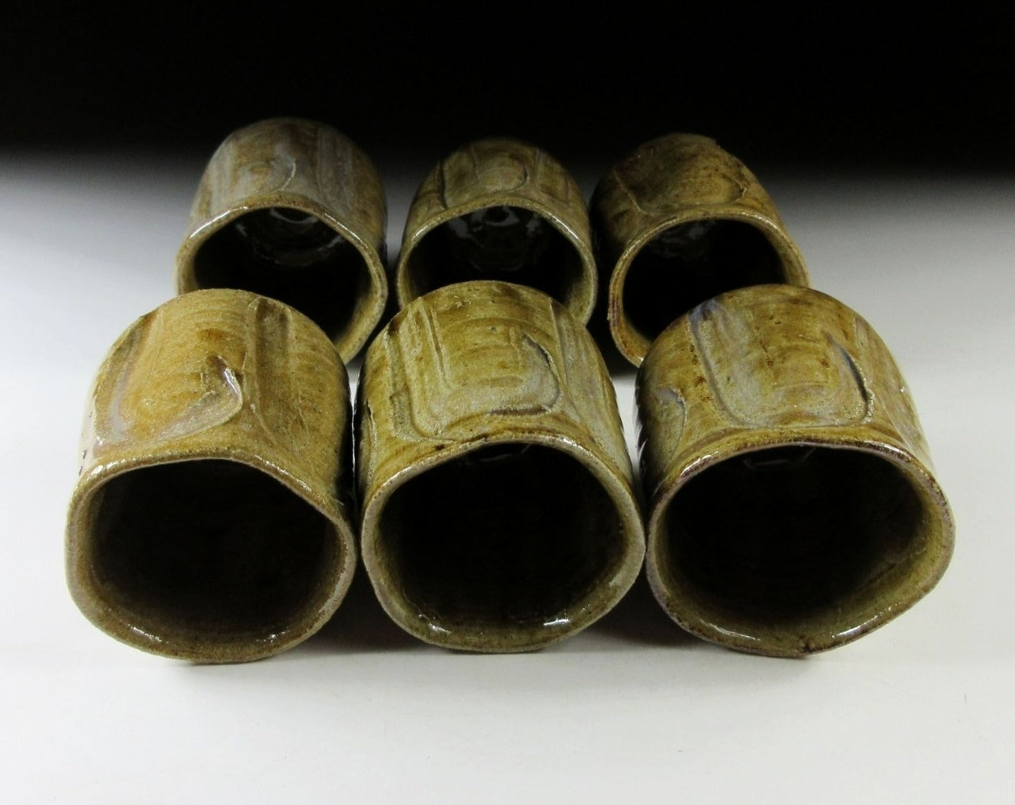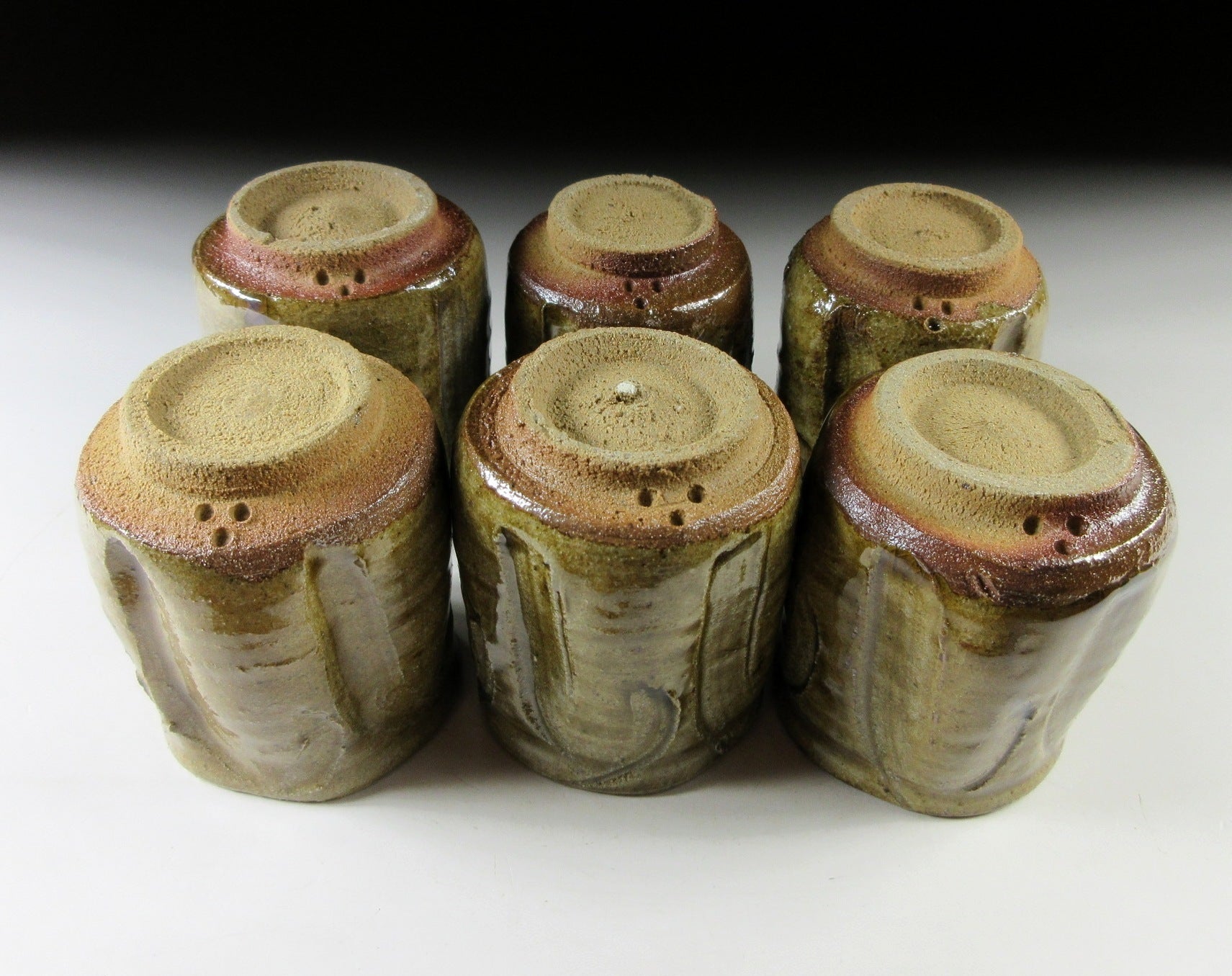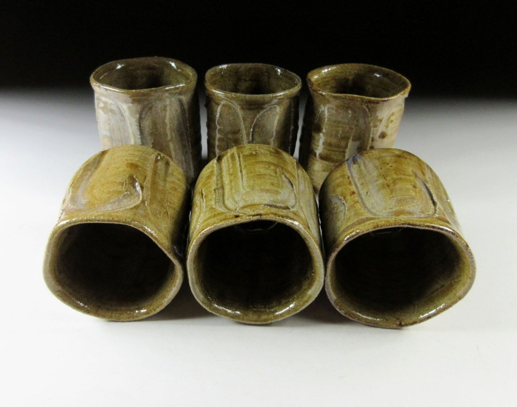 This listing is for a set of six Karatsu-ware yunomi tea cups made around 40-50 years ago by Living National Treasure, Nakazato Taroemon XII. They are wheel-thrown and coated in natural ash glaze. The sides are decorated with incised line patterns, and each cup has a squarish shape. The three dot stamp of the potter can be found on the bottom of each cup, and they come with their original signed wooden storage box. They also come with a Japanese language profile.