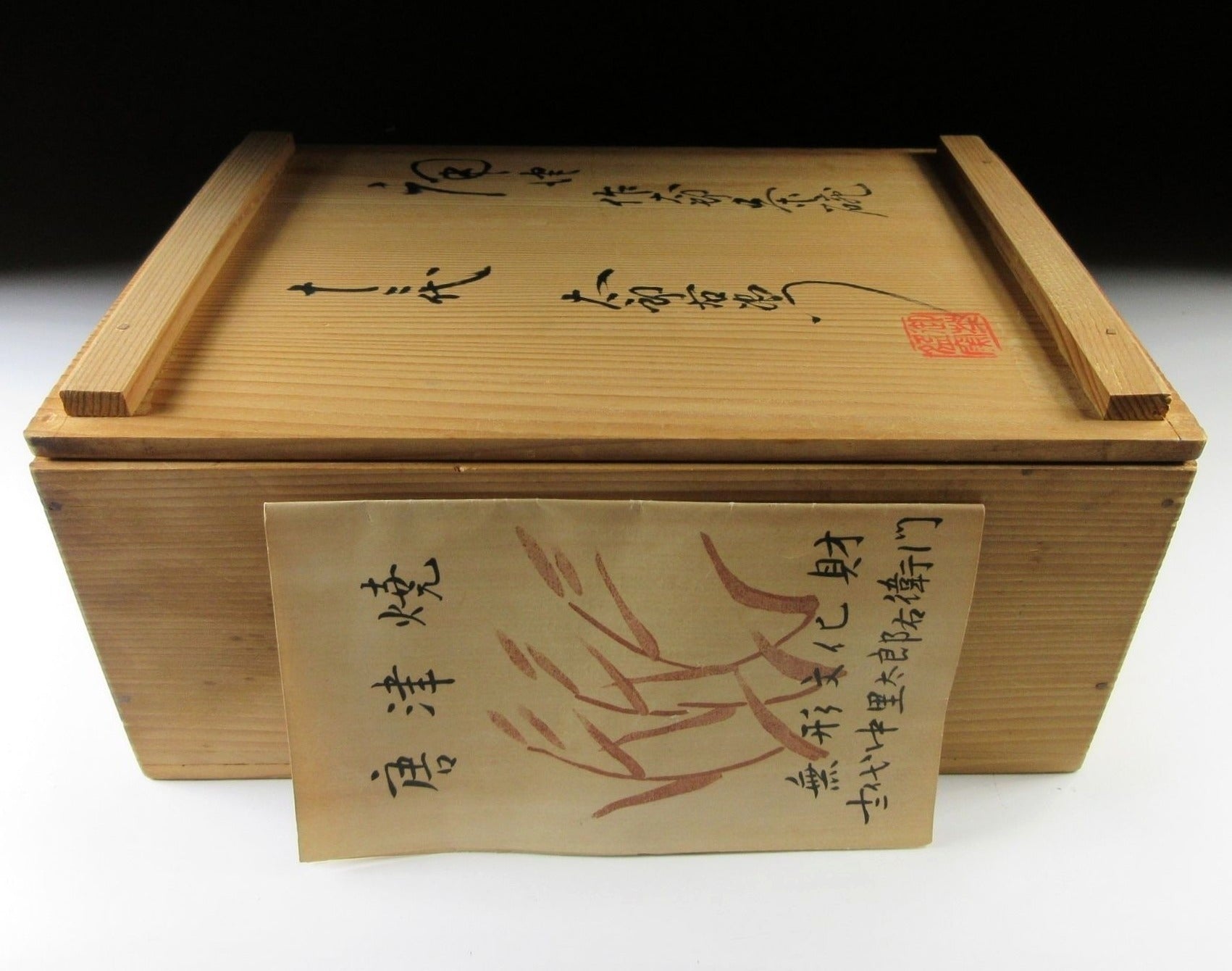 Nakazato Taroemon XII (Muan) was a Karatsu-ware potter and twelfth generation master of the Nakazato family kiln. He became head of the family kiln in 1927 and poured his life’s work into reviving the lost art of Karatsu-ware. Karatsu’s popularity waned after the population’s focus shifted to the colourful porcelain pieces produced in neighbouring Imari. Taroemon XII sought to revive lost techniques and bring Karatsu-ware to the attention of tea enthusiasts. In 1955 he was designated as an Important Intangible Cultural Asset, and in 1976 designated as a Living National Treasure. He had an illustrious career and was awarded the much coveted Purple Ribbon Medal, as well as the Order of the Sacred Treasure. His title changed to ‘Muan’ after his son took over the family kiln and assumed the title of Nakazato the 13th in 1969. **Fellow sellers, this information was researched by Kominka Zakka and CANNOT be used in your own listings.