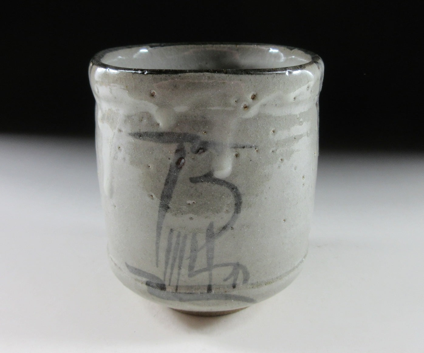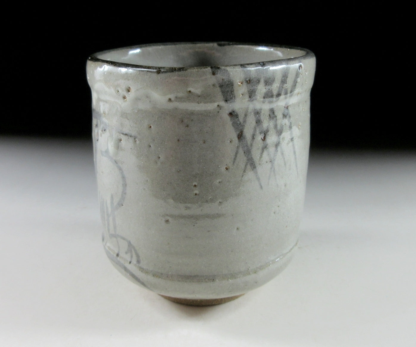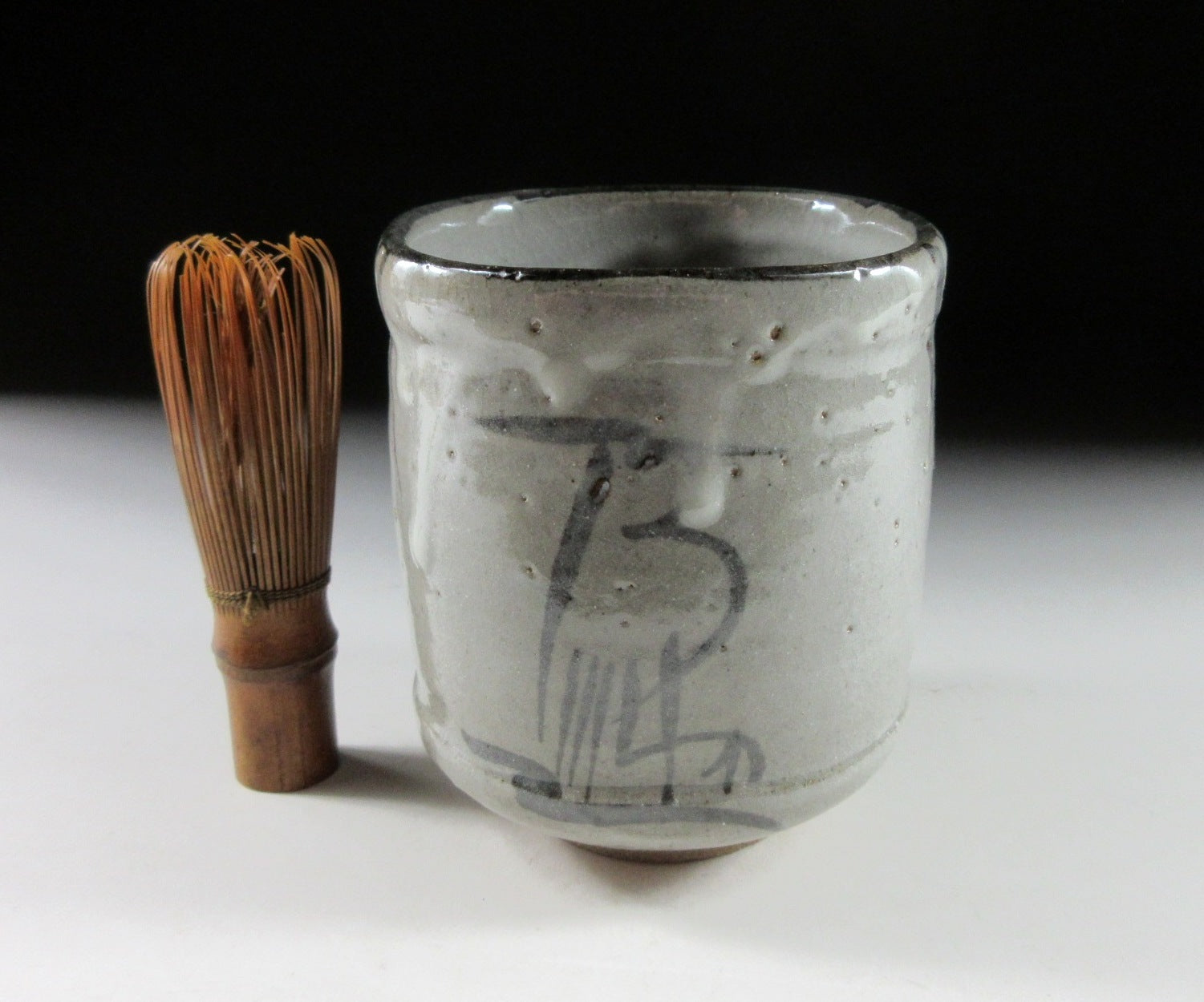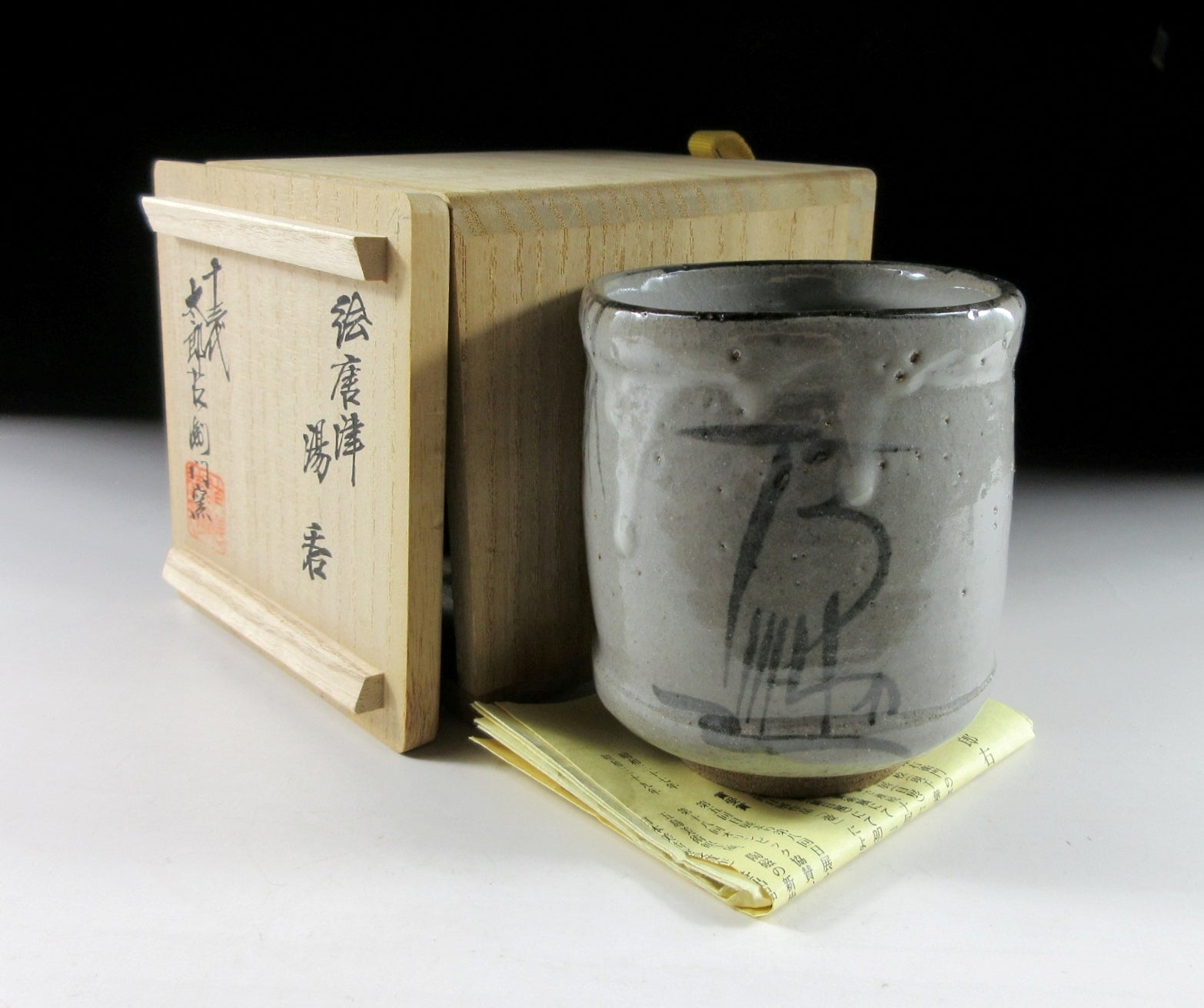 This listing is for a Karatsu-ware yunomi made around 10 years ago by distinguished potter, Nakazato Taroemon XIII. It is wheel-thrown and the front is decorated with an iron oxide depiction of an egret. The back of the cup is decorated with autumn grass, and the sides are decorated with a pattern of vertical lines. Nakazato’s three dotted stamp can be found on the bottom, and it comes with its original signed wooden storage box. It also comes with three Japanese language profile papers about the potter and the Nakazato family. *PLEASE NOTE THAT THE CHASEN TEA WHISK IS NOT INCLUDED.