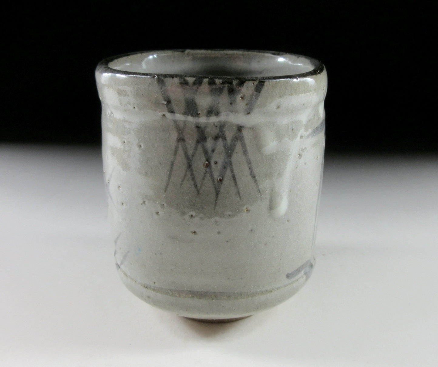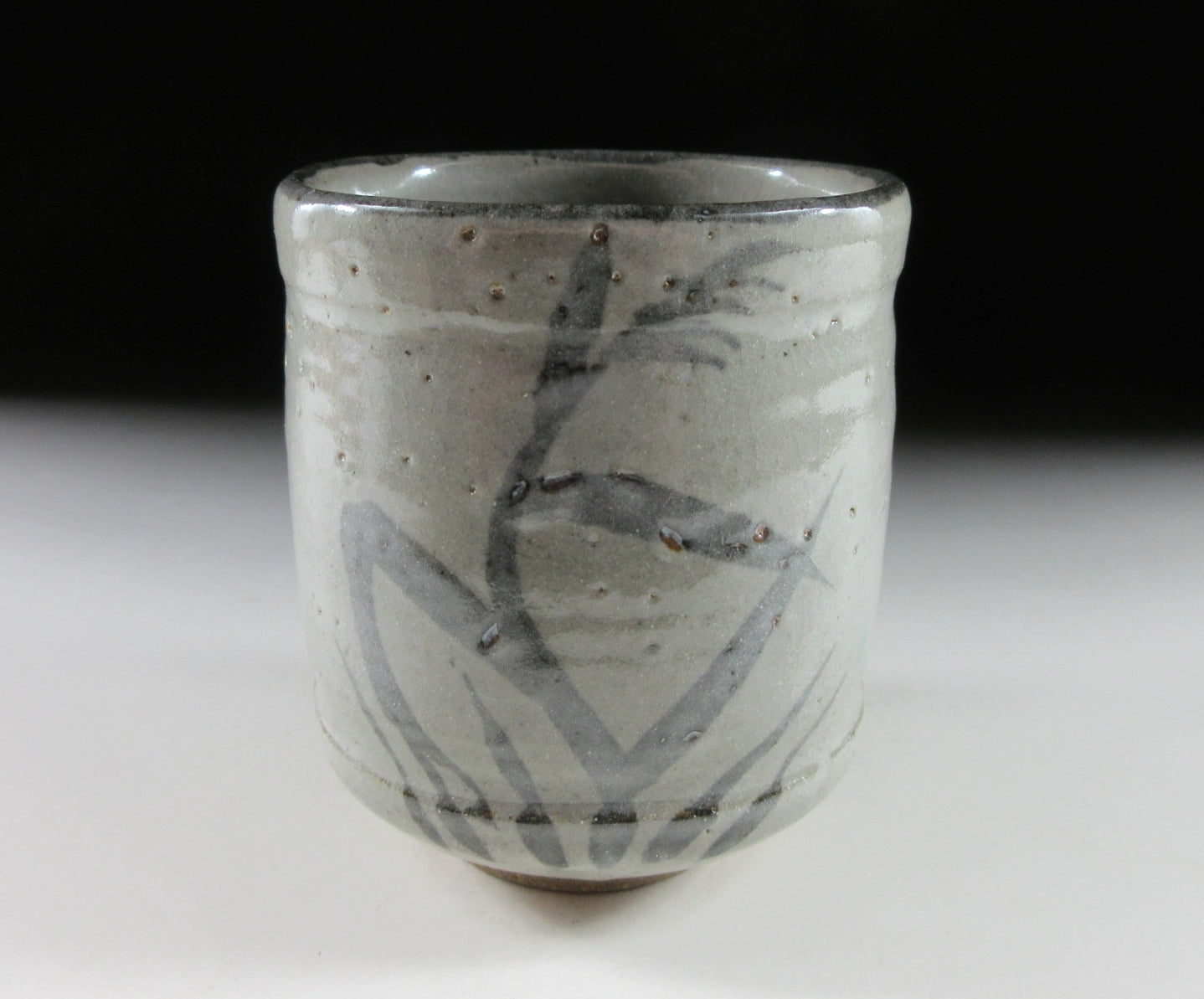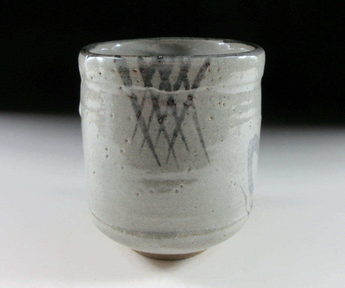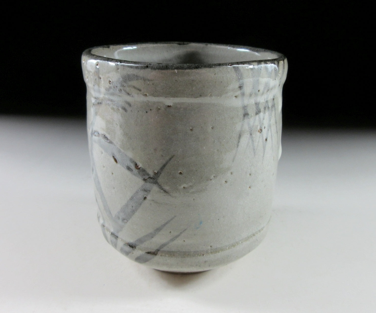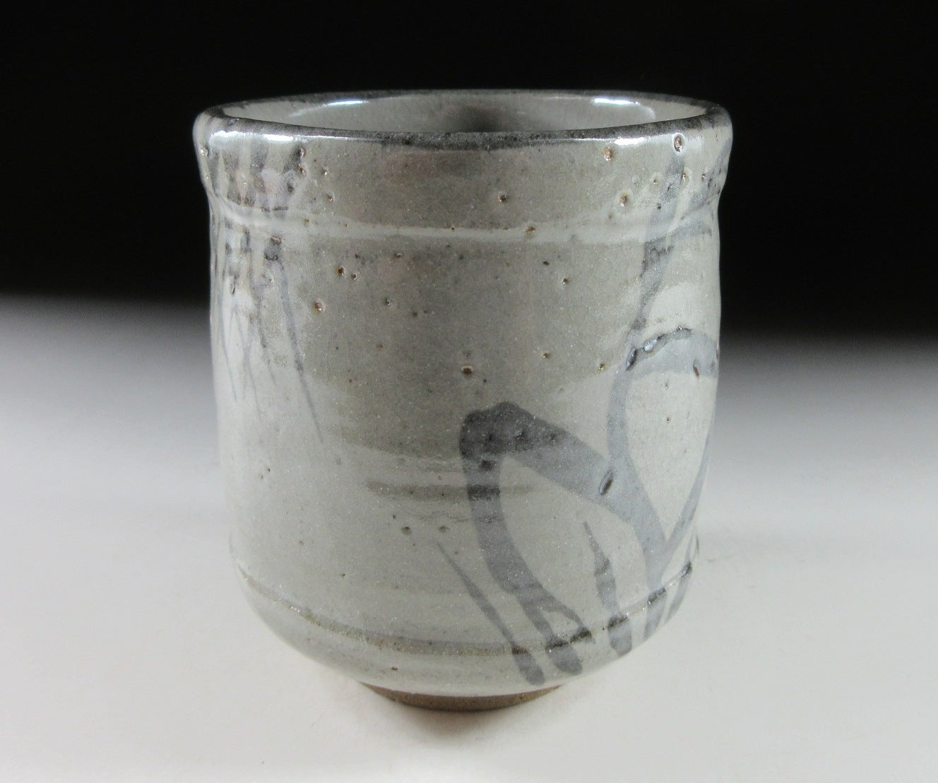 This listing is for a Karatsu-ware yunomi made around 10 years ago by distinguished potter, Nakazato Taroemon XIII. It is wheel-thrown and the front is decorated with an iron oxide depiction of an egret. The back of the cup is decorated with autumn grass, and the sides are decorated with a pattern of vertical lines. Nakazato’s three dotted stamp can be found on the bottom, and it comes with its original signed wooden storage box. It also comes with three Japanese language profile papers about the potter and the Nakazato family. *PLEASE NOTE THAT THE CHASEN TEA WHISK IS NOT INCLUDED.