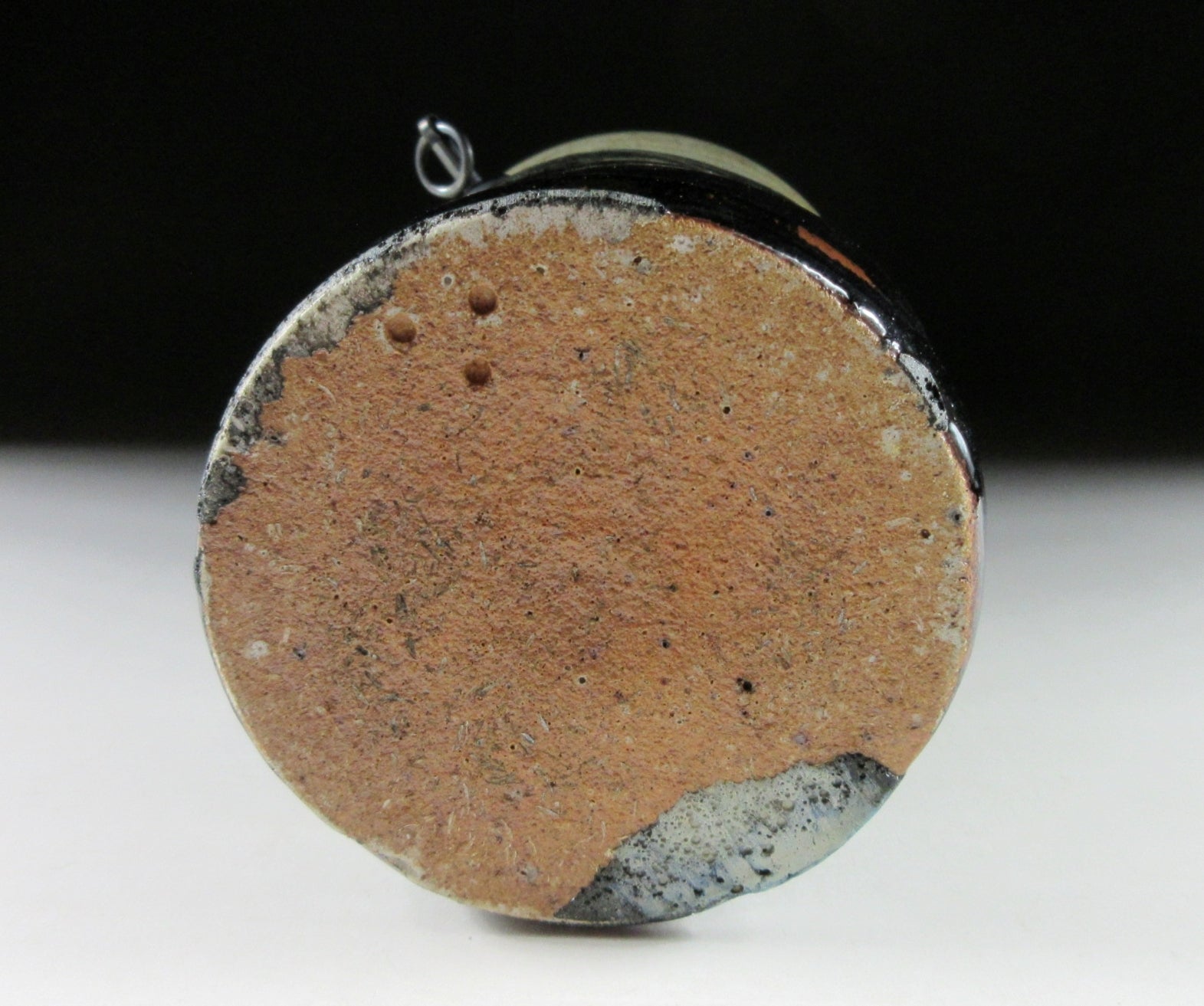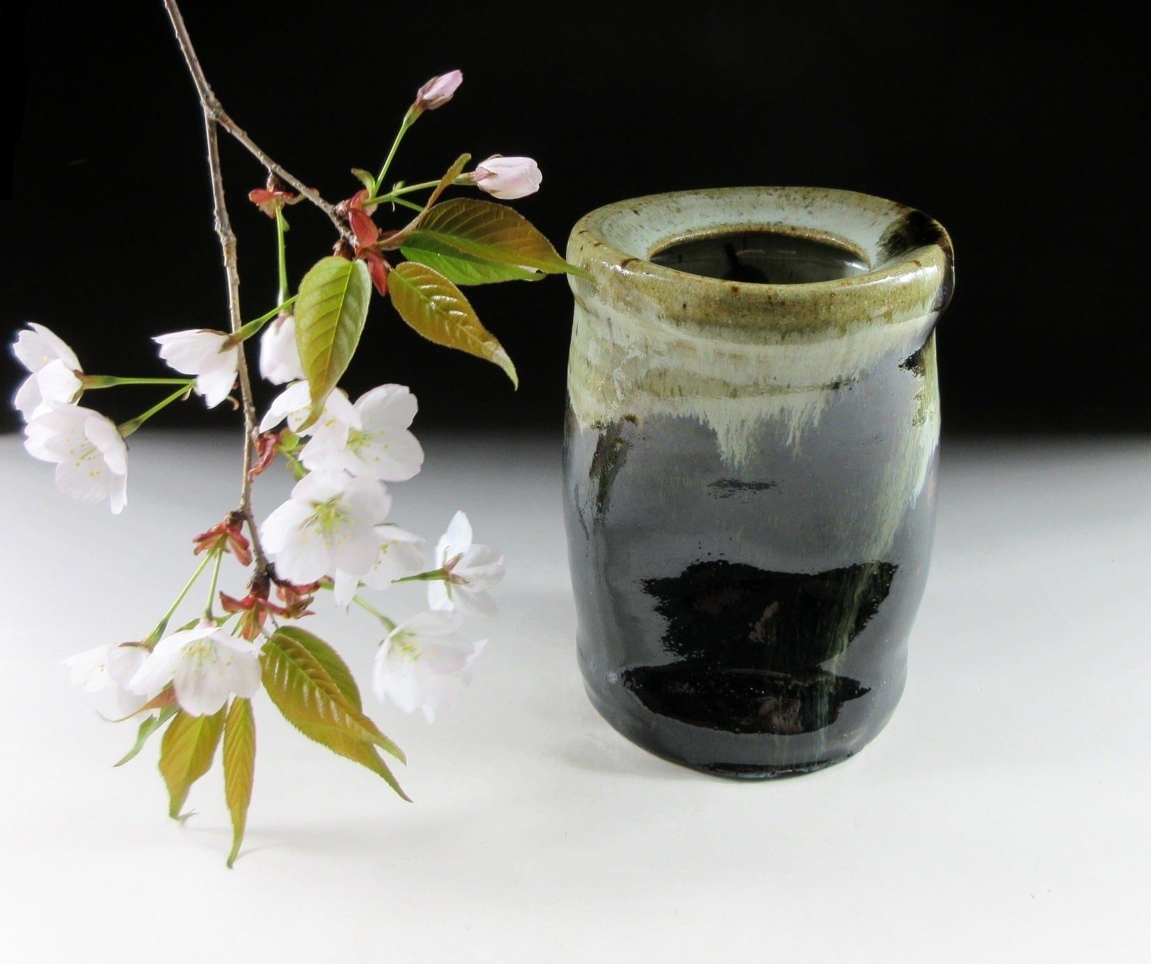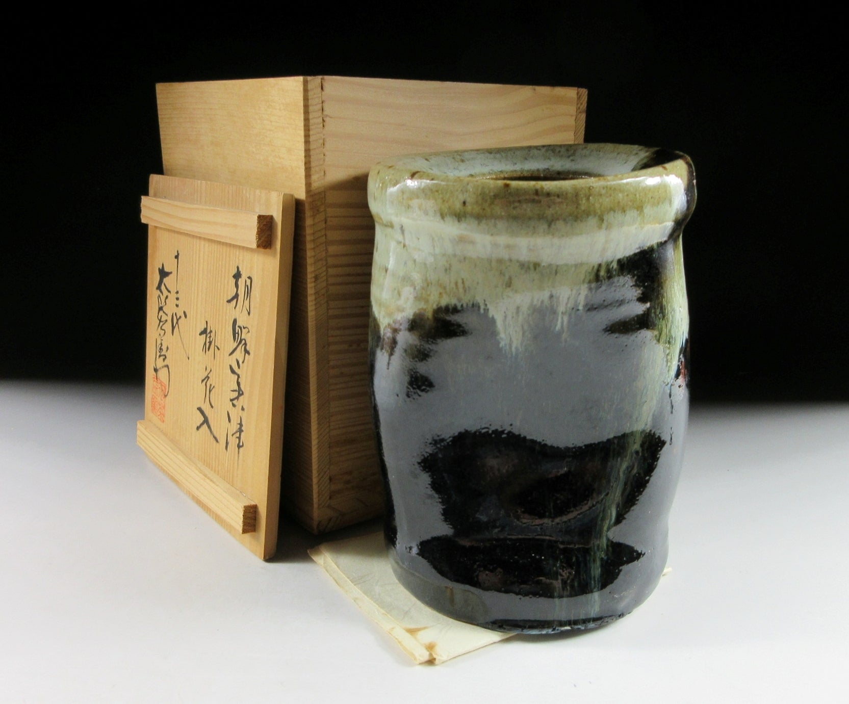 This listing is for a Karatsu-ware hanging vase made by distinguished potter, Taroemon Nakazato XIII. It features a combination of rice straw ash and dark coloured chosen karatsu glaze, and has a ring on the back enabling it to be hung on the wall. This particular vase has an ‘uzukumaru’ shape, which means dented or hunched over. The opening is wide enough to accommodate a decent sized bunch of flowers, and Nakazato’s three dot stamp can be found on the bottom. It comes with its original signed wooden storage box.