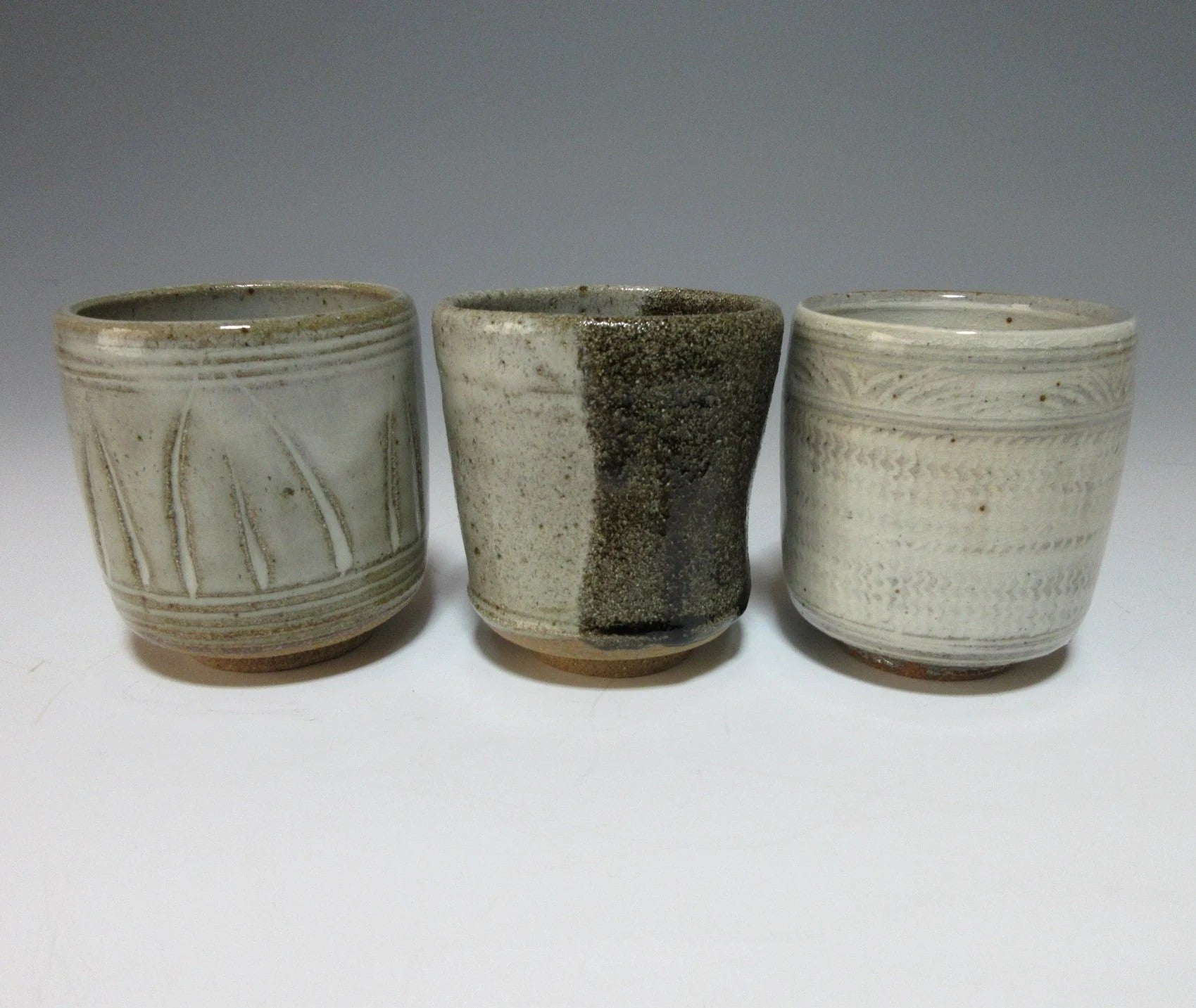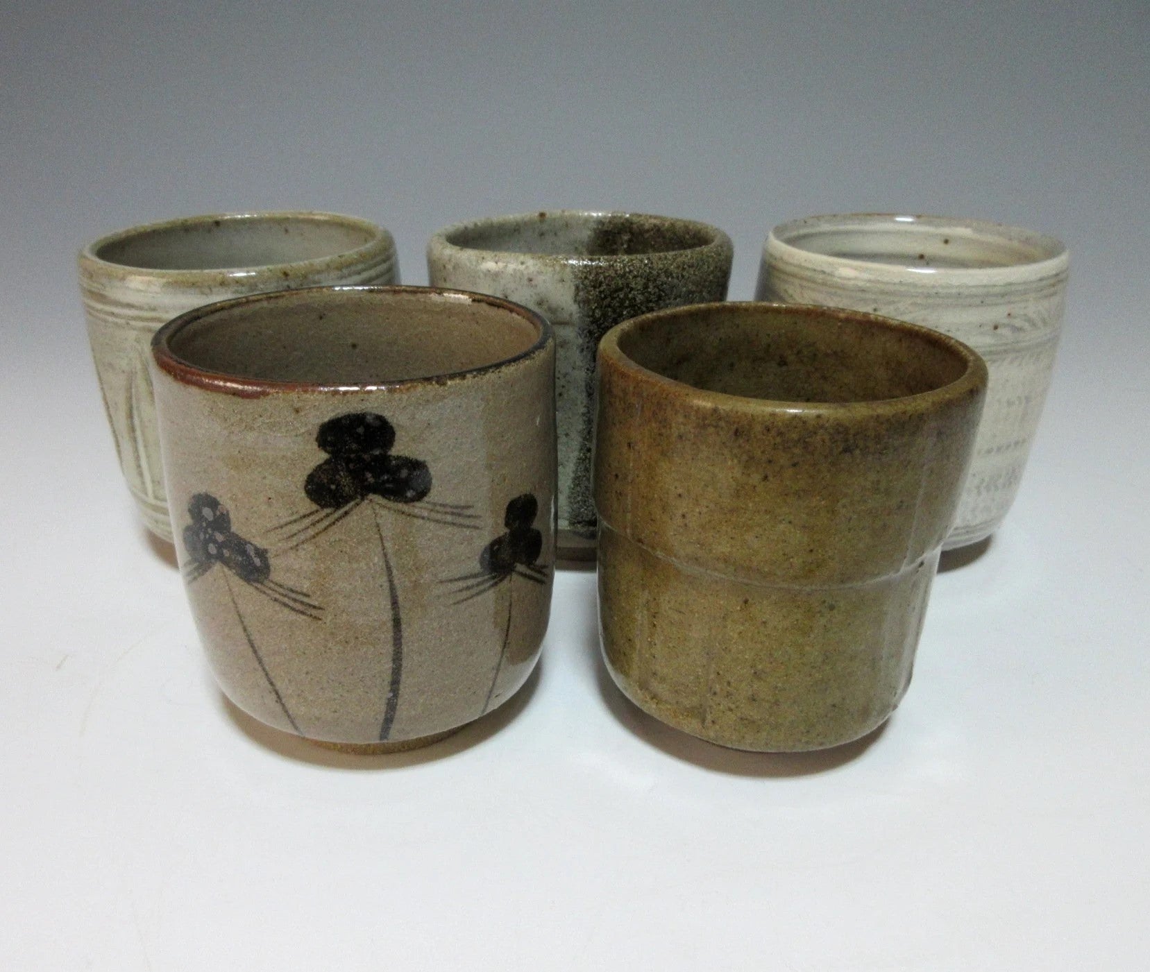 This listing is for a set of five Karatsu-ware yunomi made by distinguished potter, Nakazato Taroemon XIII. The set consists of five different types of Karatsu-ware: Madara Karatsu (Mottled Karatsu), Chosen Karatsu (Korean Karatsu, Ki Karatsu (Yellow Karatsu), E Karatsu (Brush Decorated Karatsu), and Mishima Karatsu (Stamp Inlay Karatsu). Each cup is wheel-thrown, and the stamp of the potter can be found on the bottom of each cup. They come with their original signed wooden storage box, as well as three different Japanese language profile papers about the potter, the Nakazato family kiln and Karatsu-ware. This set works out to be 4800 yen per cup.