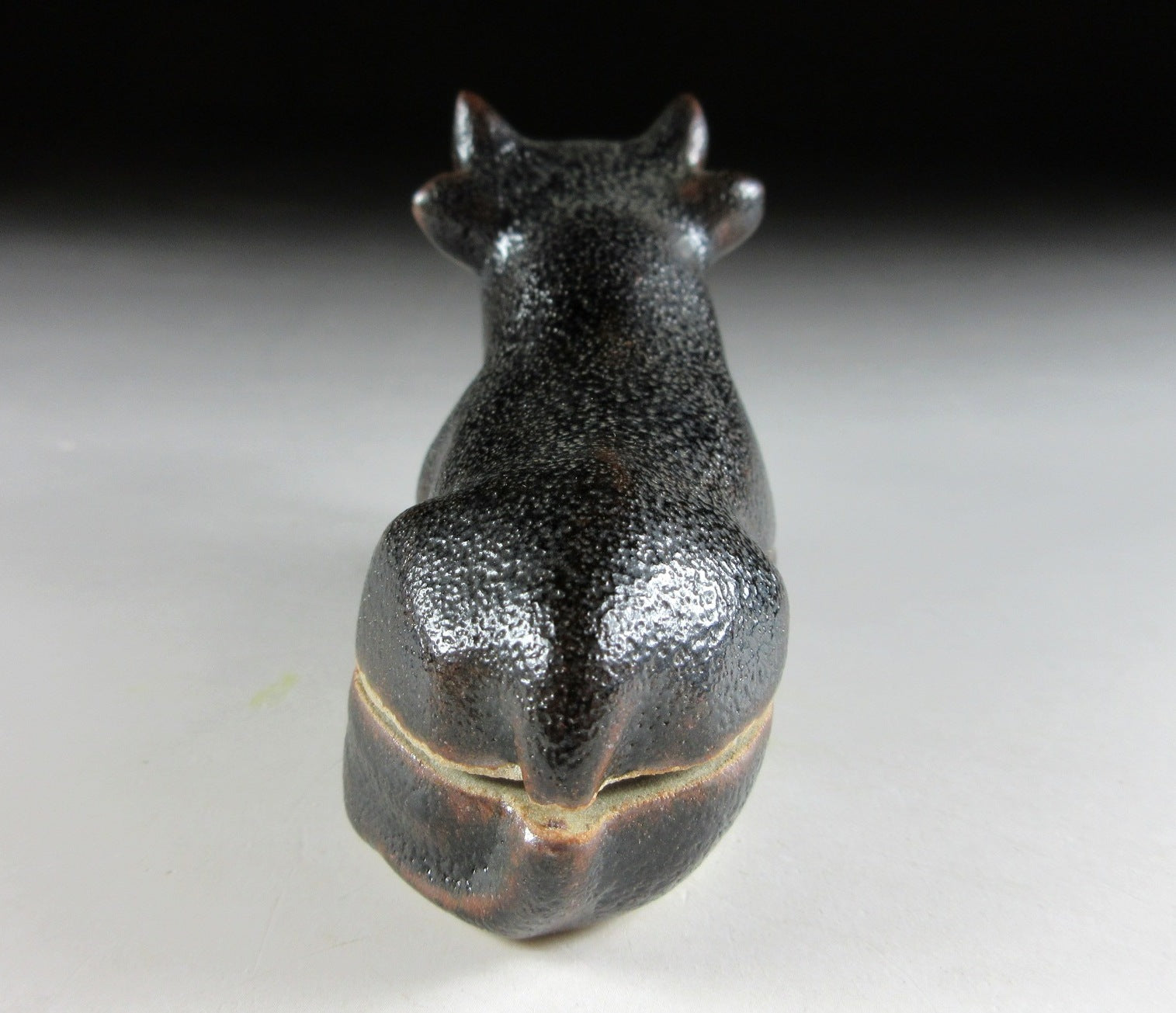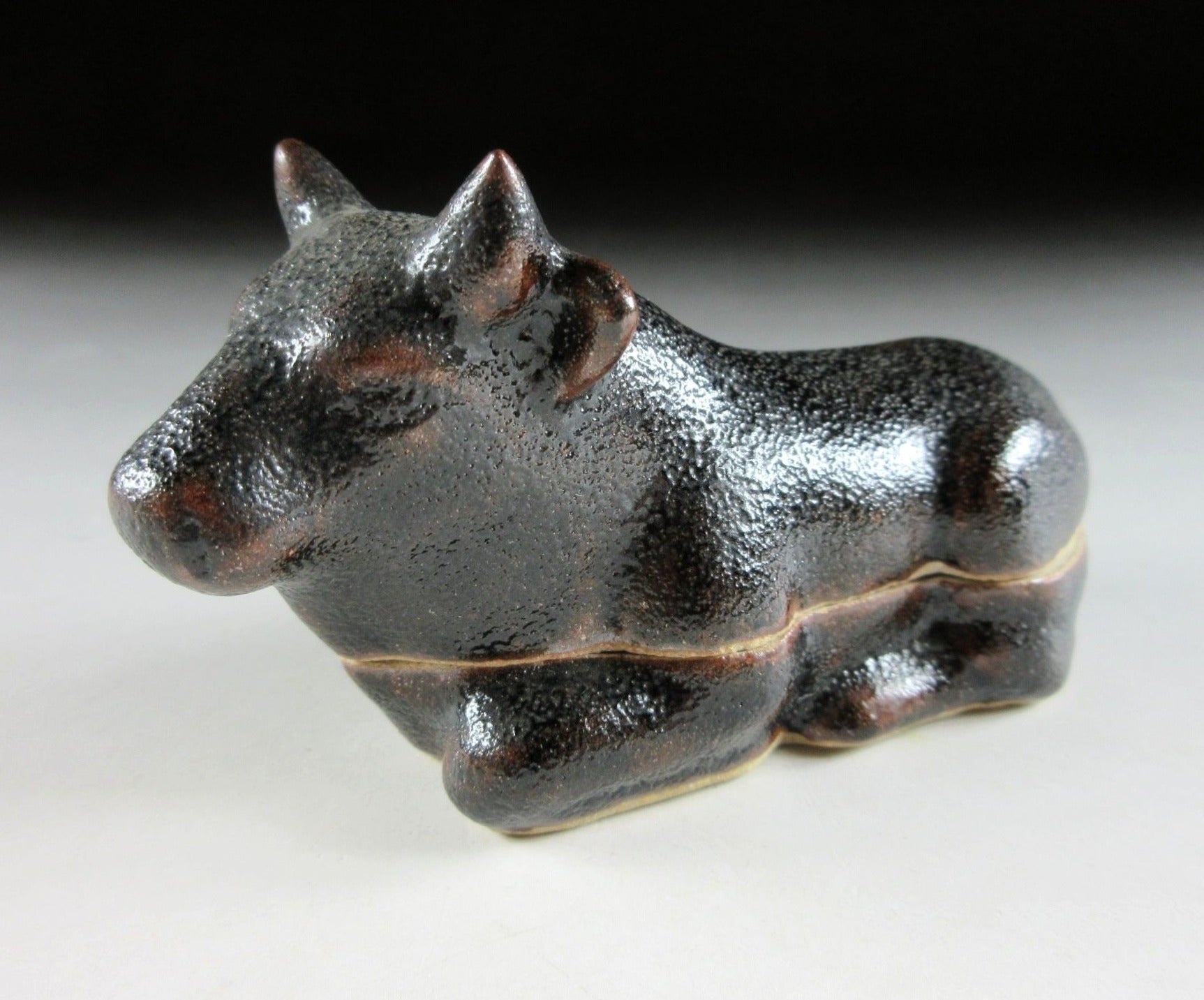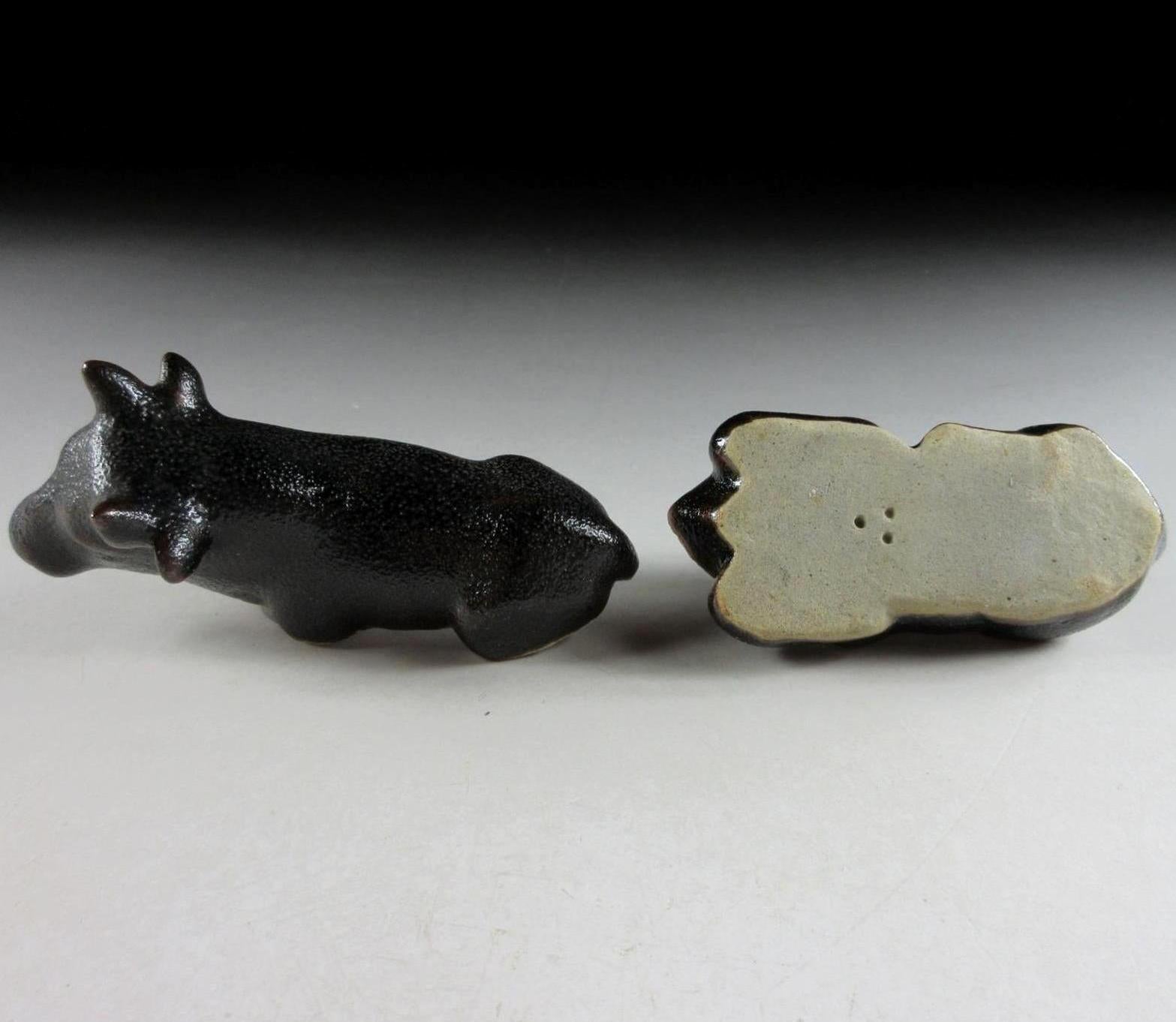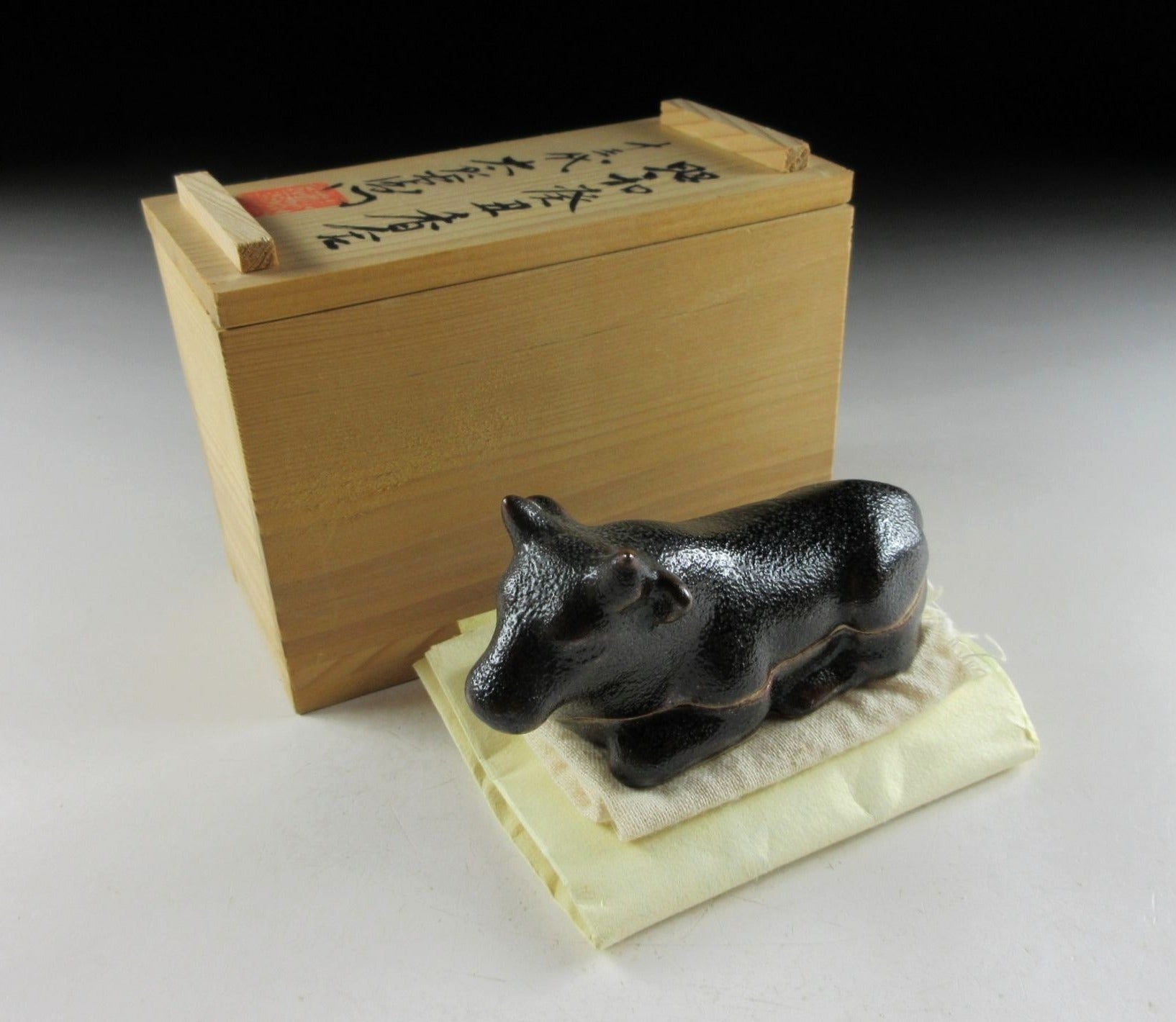 This listing is for a Karatsu-ware kogo made around 20 years ago by distinguished potter, Nakazato Taroemon XIII. It is made of high-fired stoneware and moulded to resemble an ox. The exterior features black kuro Karatsu glaze over an iron based glaze, this is what gives it its brown markings. Its size and shape is suitable for both woodchip and kneaded incense, although pottery kogo are typically used for kneaded incense during the cooler months. This piece was most likely made to commemorate the Year of the Ox back in 1997. The three dot stamp of the potter can be found on the bottom, and it comes with its original signed storage box. It also comes with two wrapping cloths for when the item is not in use.
