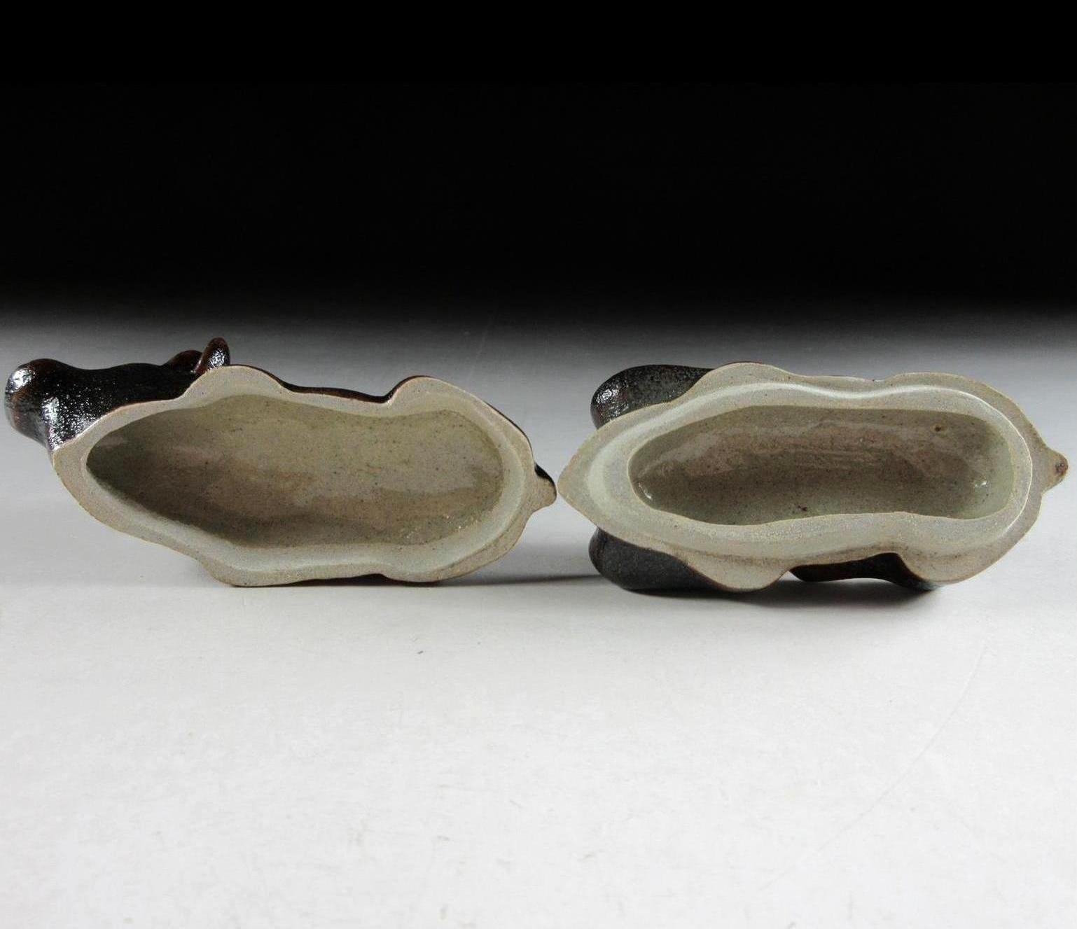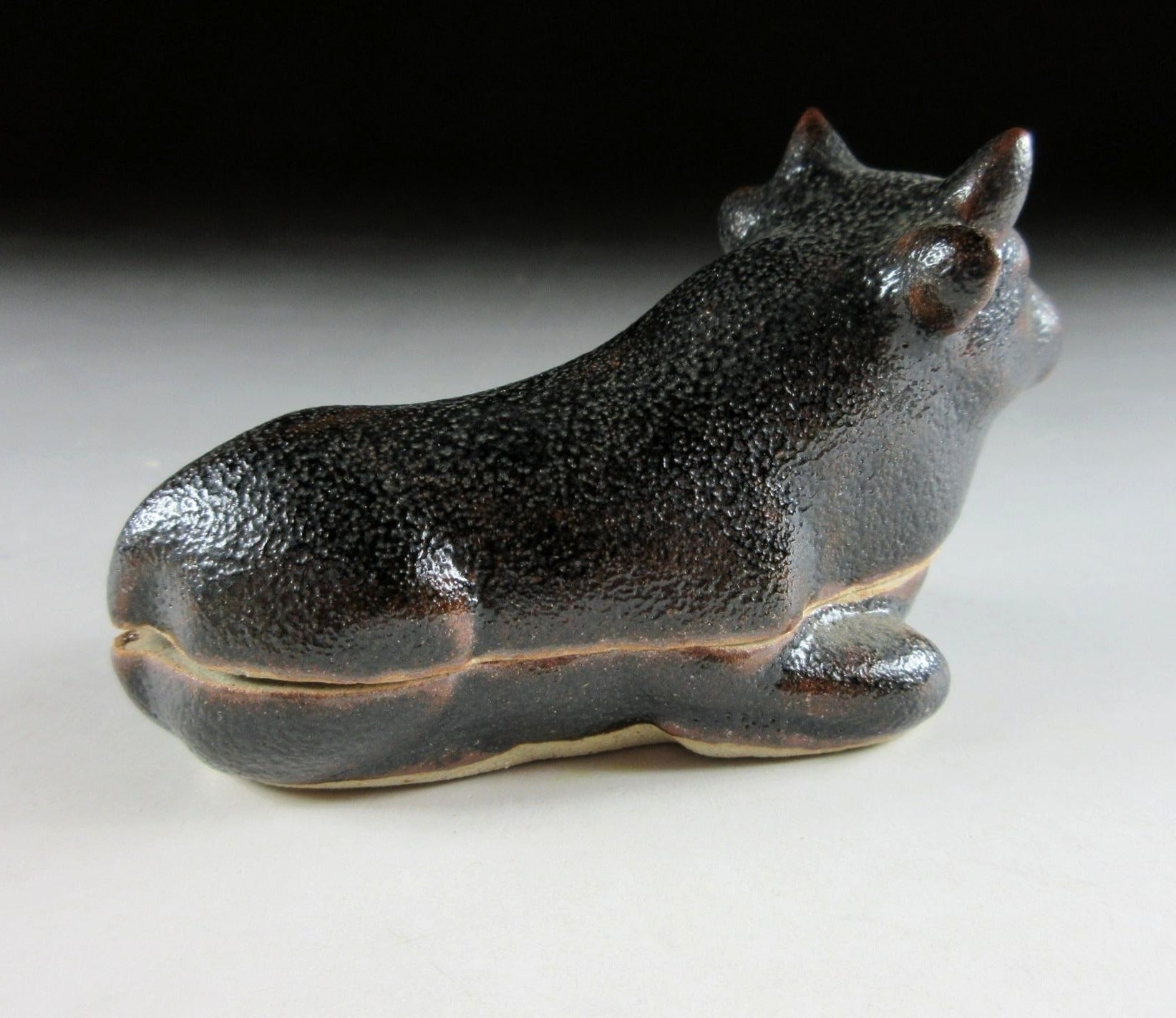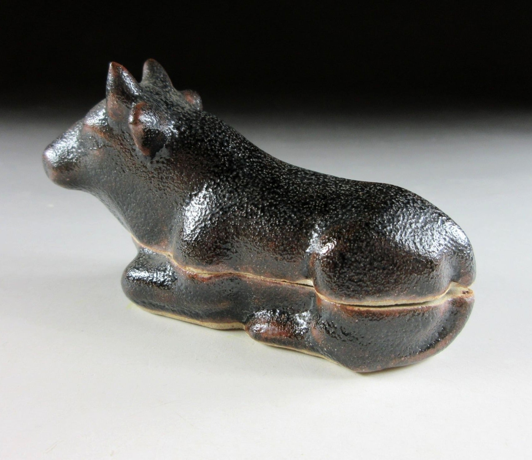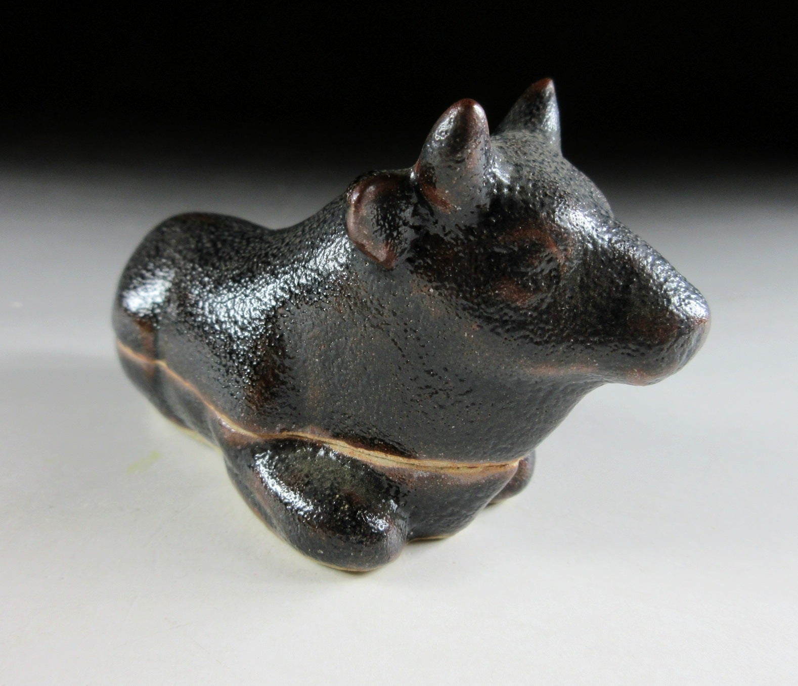 This listing is for a Karatsu-ware kogo made around 20 years ago by distinguished potter, Nakazato Taroemon XIII. It is made of high-fired stoneware and moulded to resemble an ox. The exterior features black kuro Karatsu glaze over an iron based glaze, this is what gives it its brown markings. Its size and shape is suitable for both woodchip and kneaded incense, although pottery kogo are typically used for kneaded incense during the cooler months. This piece was most likely made to commemorate the Year of the Ox back in 1997. The three dot stamp of the potter can be found on the bottom, and it comes with its original signed storage box. It also comes with two wrapping cloths for when the item is not in use.