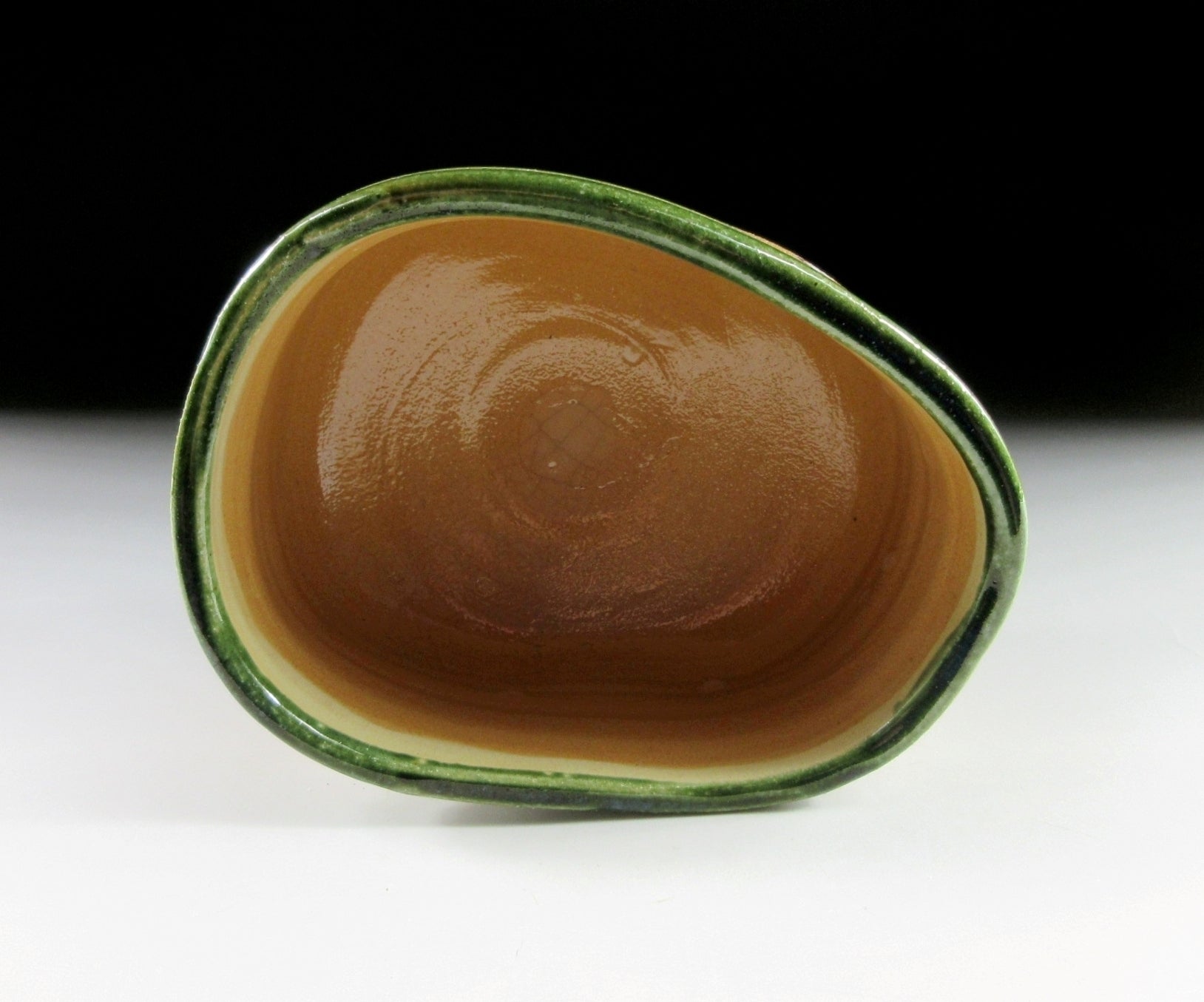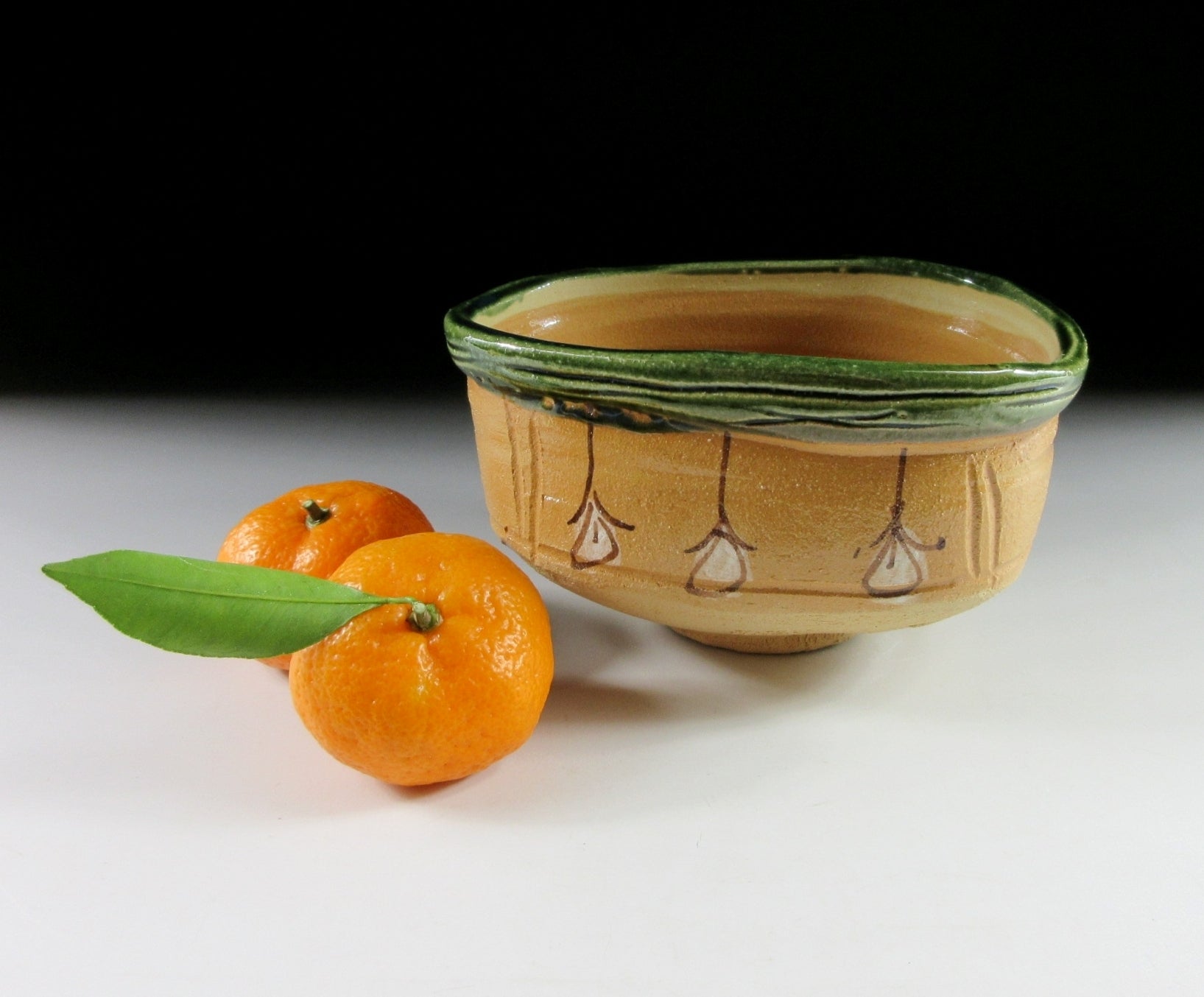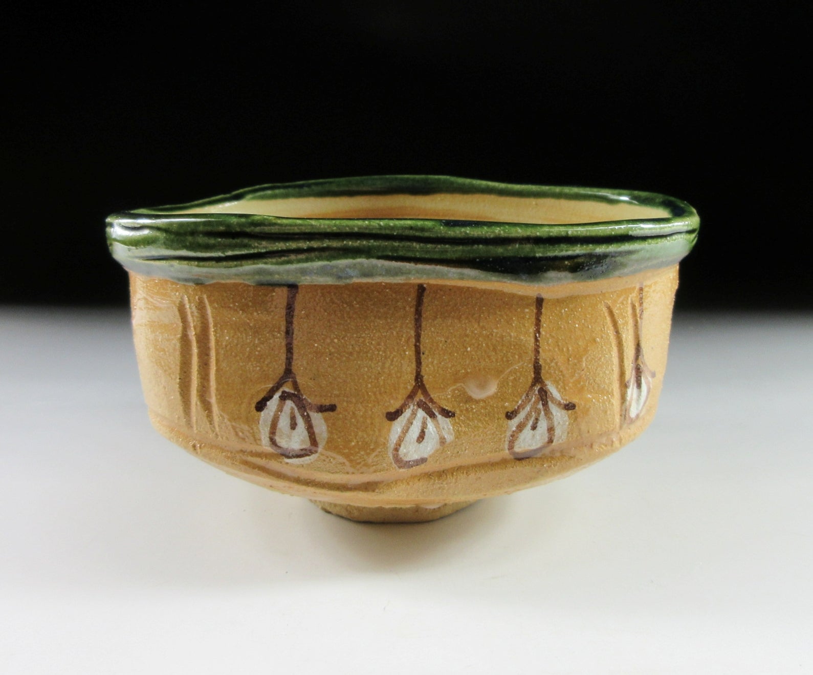 This listing is for a Seto-ware kutsu-gata clog shaped chawan made around 20 years ago by Narumi Choyu. It is made of stoneware and its distorted shape mimics tea bowls dating back to the Azuchi-Momoyama Period. It features copper green glaze around the rim and the body of the bowl is coated in transparent white glaze. Both the front and back of the bowl is decorated with hand-painted depictions of ‘hoshigaki’ hanging persimmons. The mark of the potter can be found on the bottom and it comes with its original signed wooden storage box. It also comes with a yellow wrapping cloth for when the item is not in use.