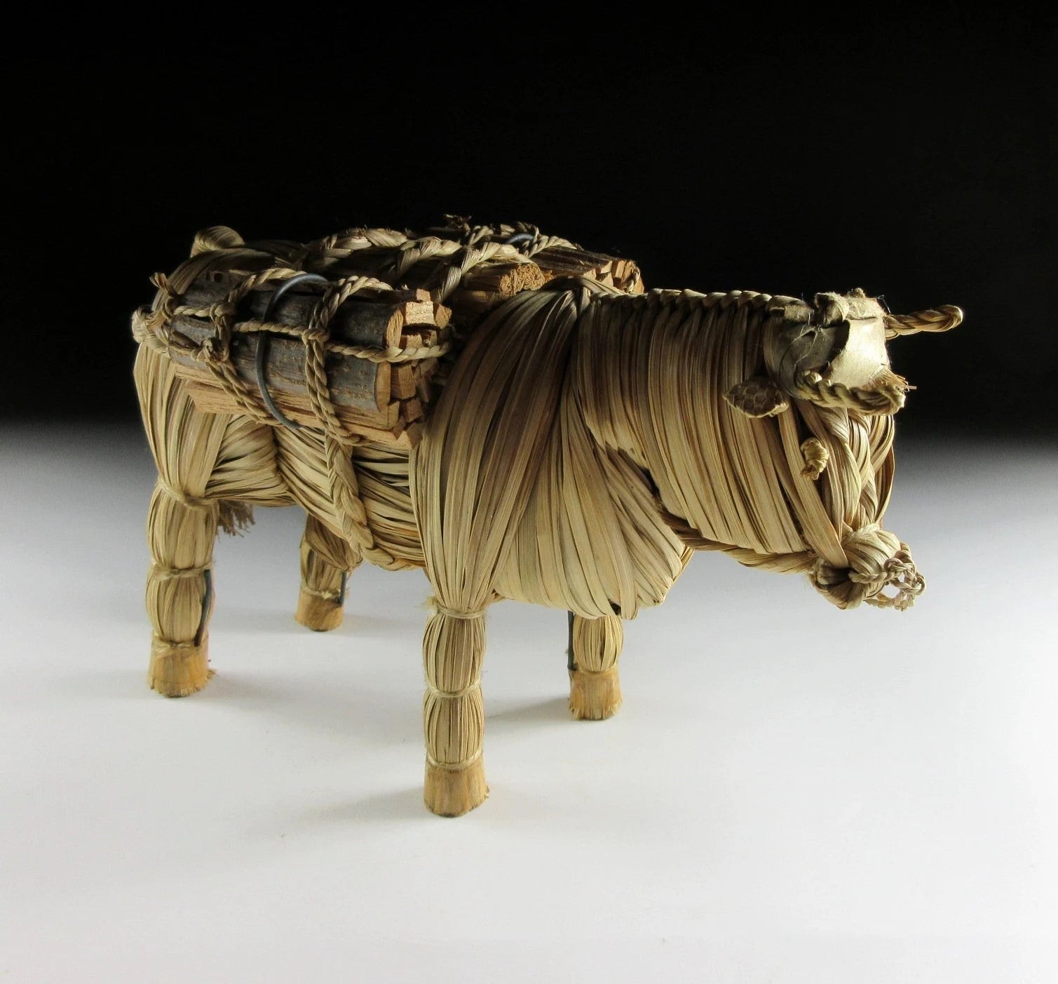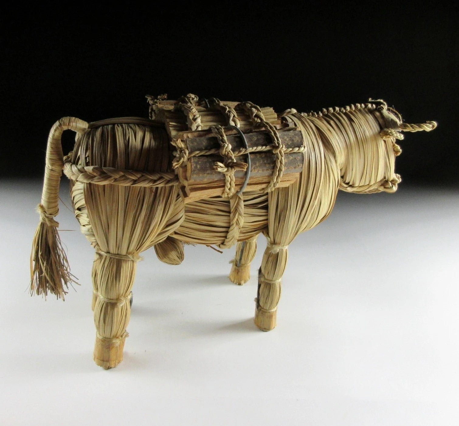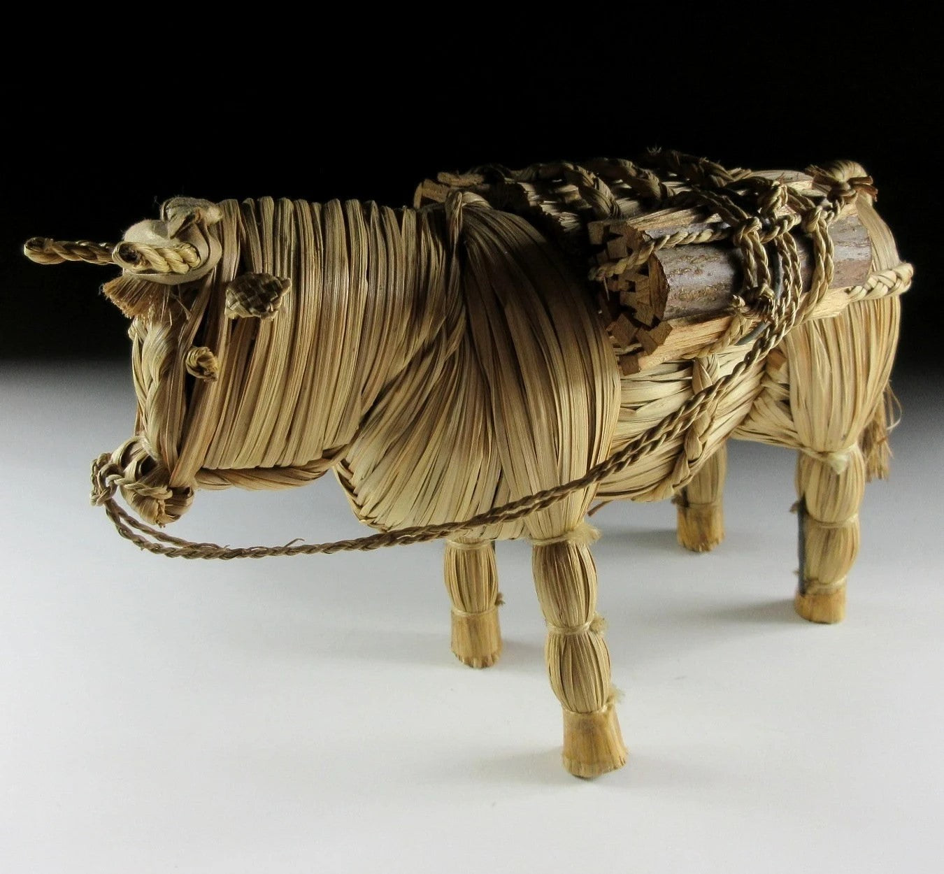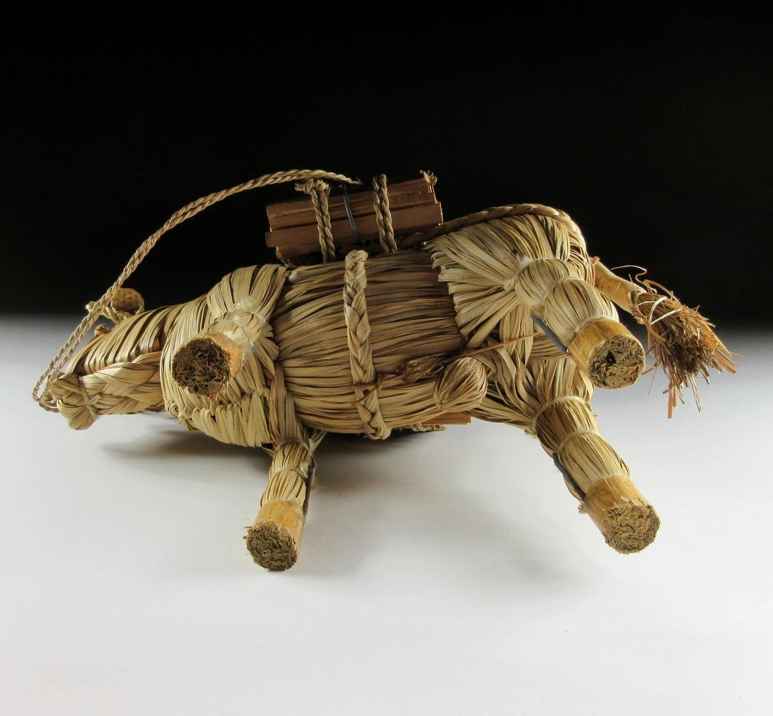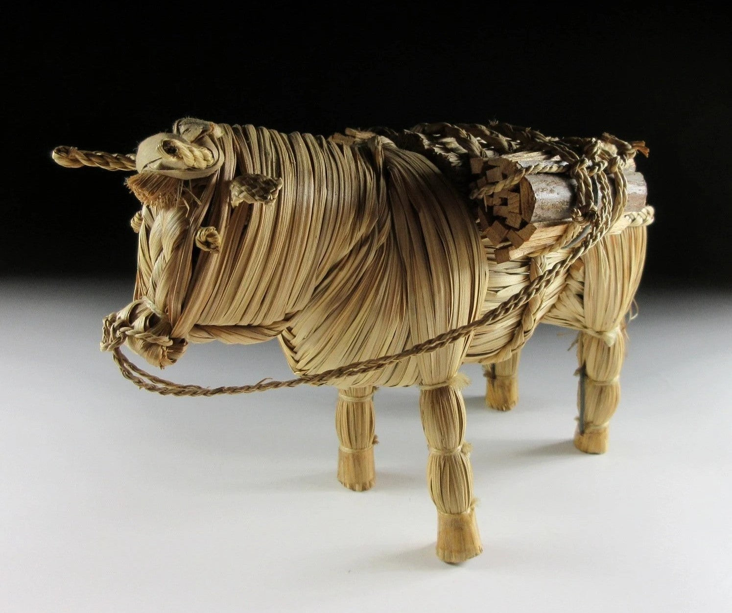 This listing is for a sedge grass ox made around 30-40 years ago. Niigata sedge grass crafts began in the 30's during the Showa era in order for farmers to earn additional income during the off-season. At one time, about 200 people were involved, but now just five people from the Hiramaru Sedge Craft Preservation Society produce woven zodiac animals every year. Only about 100 animals are produced each year so they are becoming scarce. The ox in this listing features braided reins and there’s some wire in the framework to make the animal sturdy. The produce on the ox’s back is made of wood and the legs are secured by small amounts of tape and string.