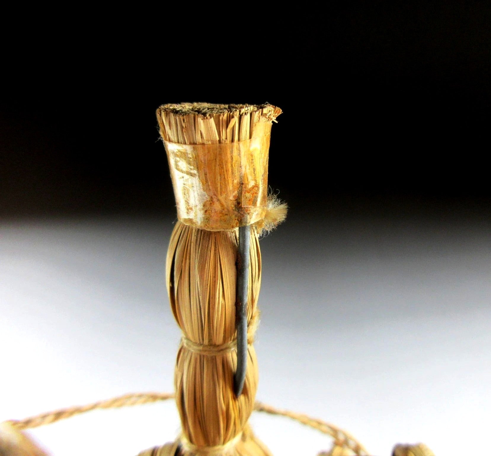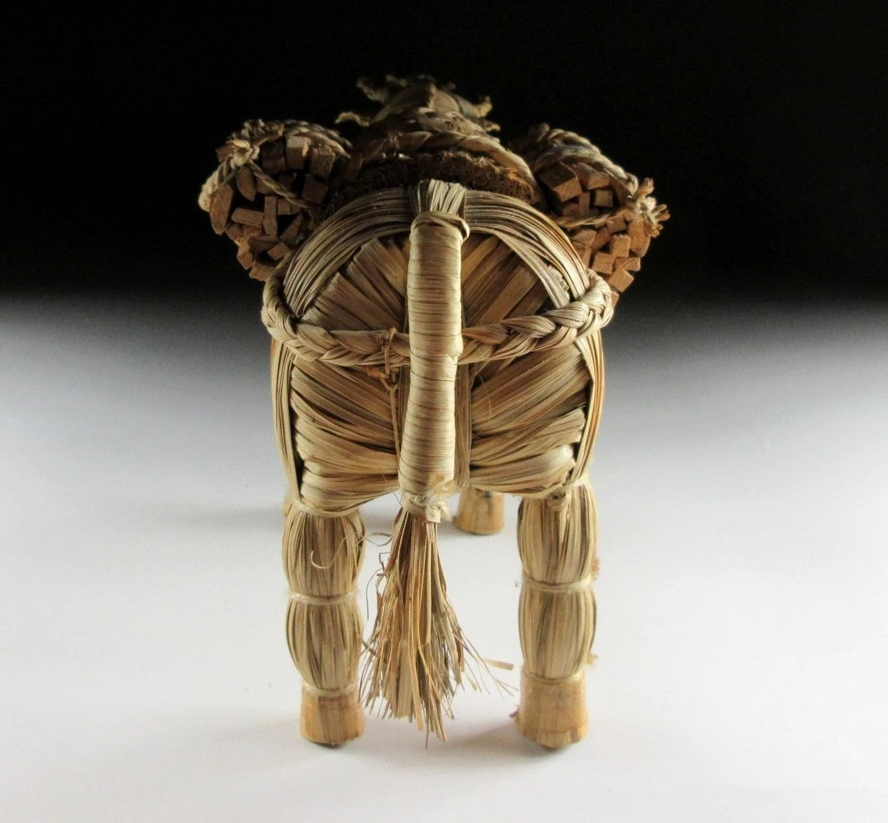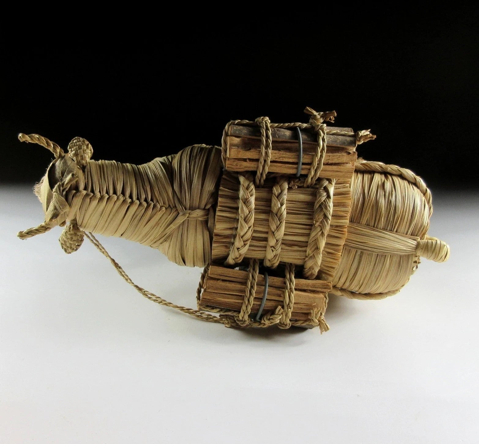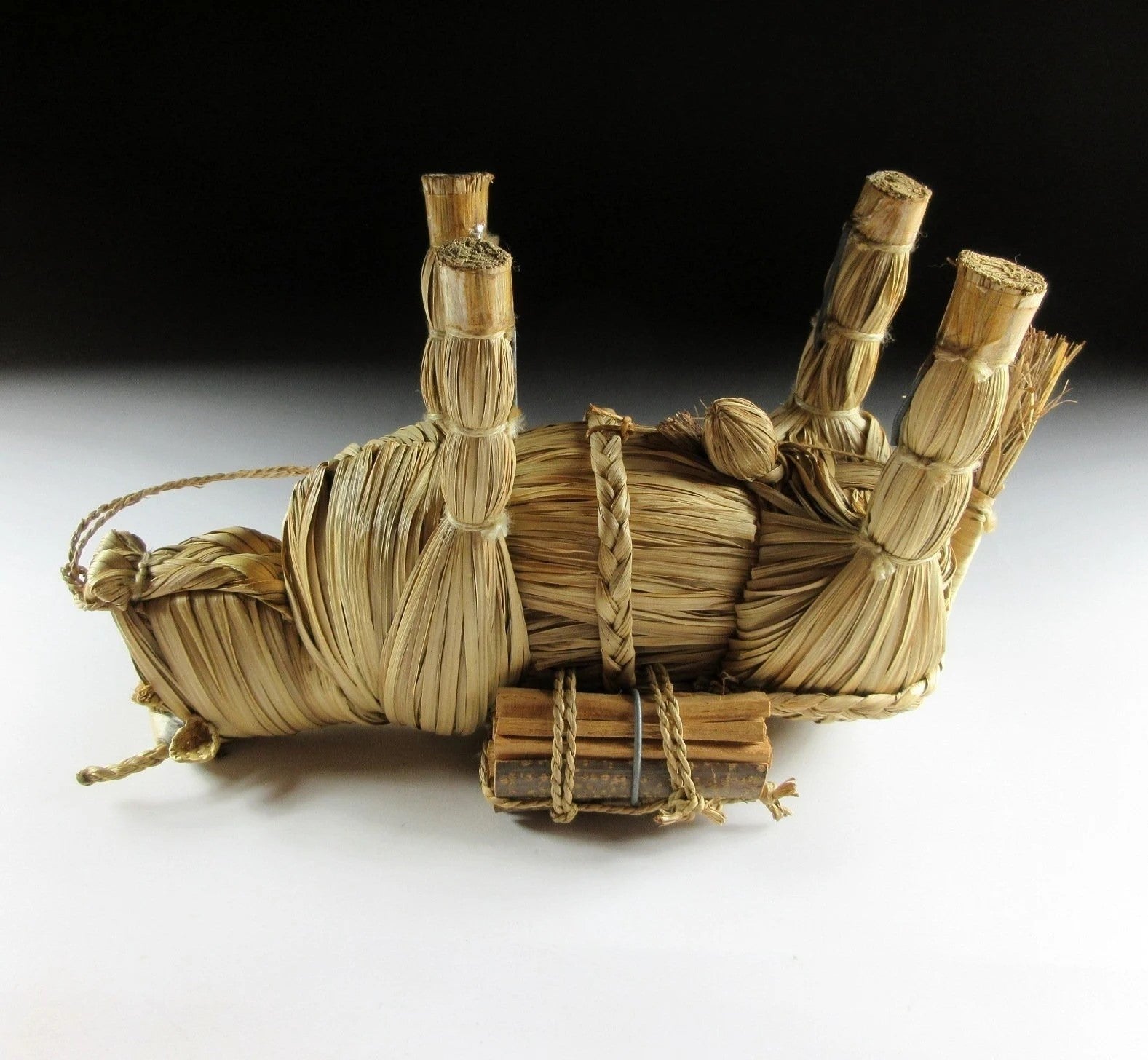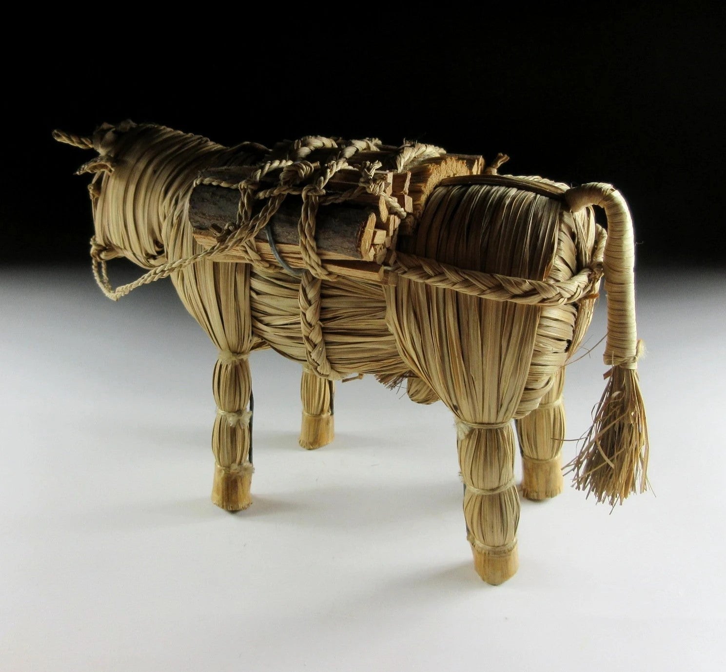 This listing is for a sedge grass ox made around 30-40 years ago. Niigata sedge grass crafts began in the 30's during the Showa era in order for farmers to earn additional income during the off-season. At one time, about 200 people were involved, but now just five people from the Hiramaru Sedge Craft Preservation Society produce woven zodiac animals every year. Only about 100 animals are produced each year so they are becoming scarce. The ox in this listing features braided reins and there’s some wire in the framework to make the animal sturdy. The produce on the ox’s back is made of wood and the legs are secured by small amounts of tape and string.