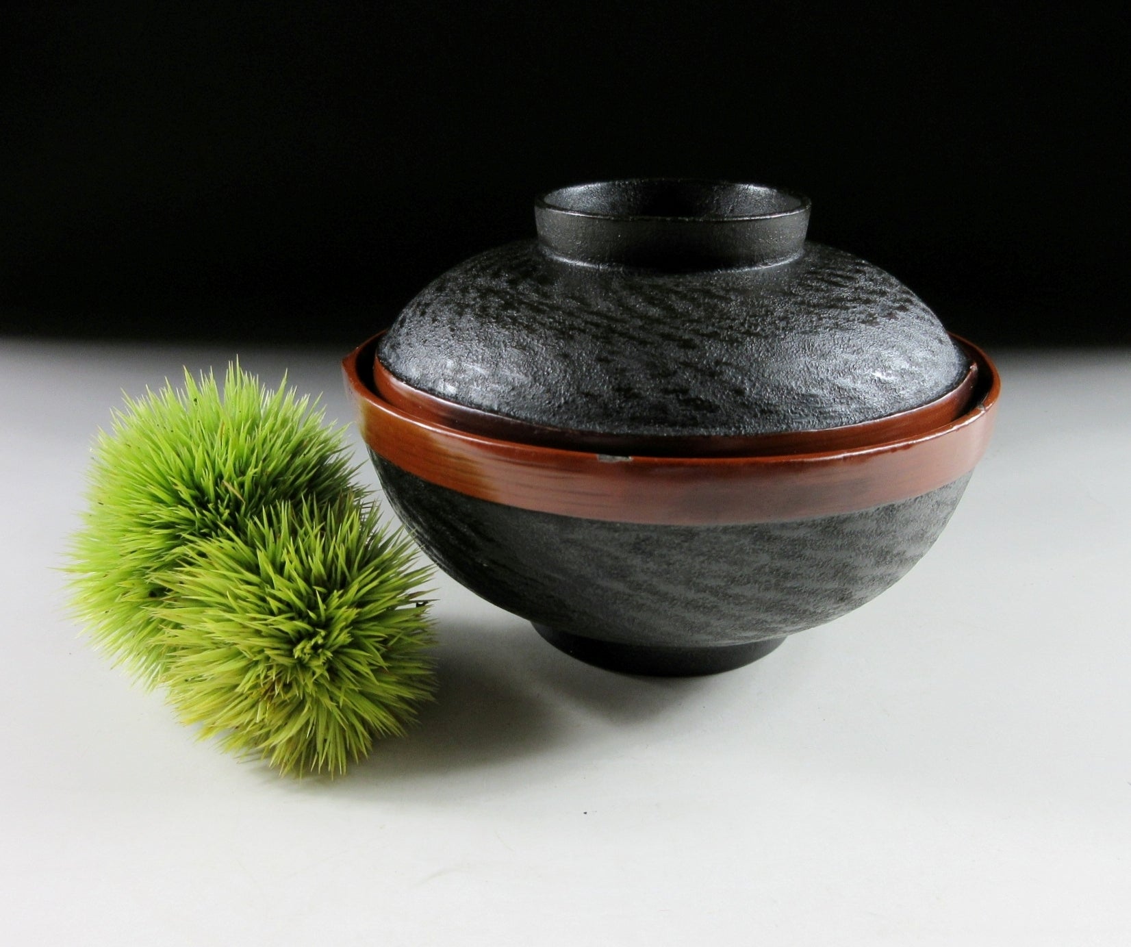 This listing is for a Niigata Take and Ishime-nuri lacquerware bowl made around 60-70 years ago. Take-nuri is lacquerware that simulates the appearance of bamboo. Skilled artisans use layers of lacquer to create the distinctive nodes found on bamboo, and they also create the texture of bamboo stalks. The surface is then polished and painted numerous times before the final product is complete. The bowl in this listing is ample in size and features textured black lacquer called Ishime-nuri. Please read below regarding the size and condition of the bowl.