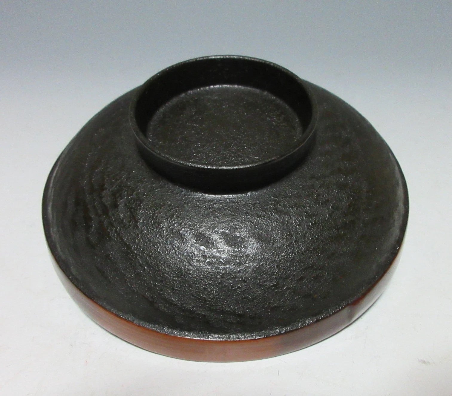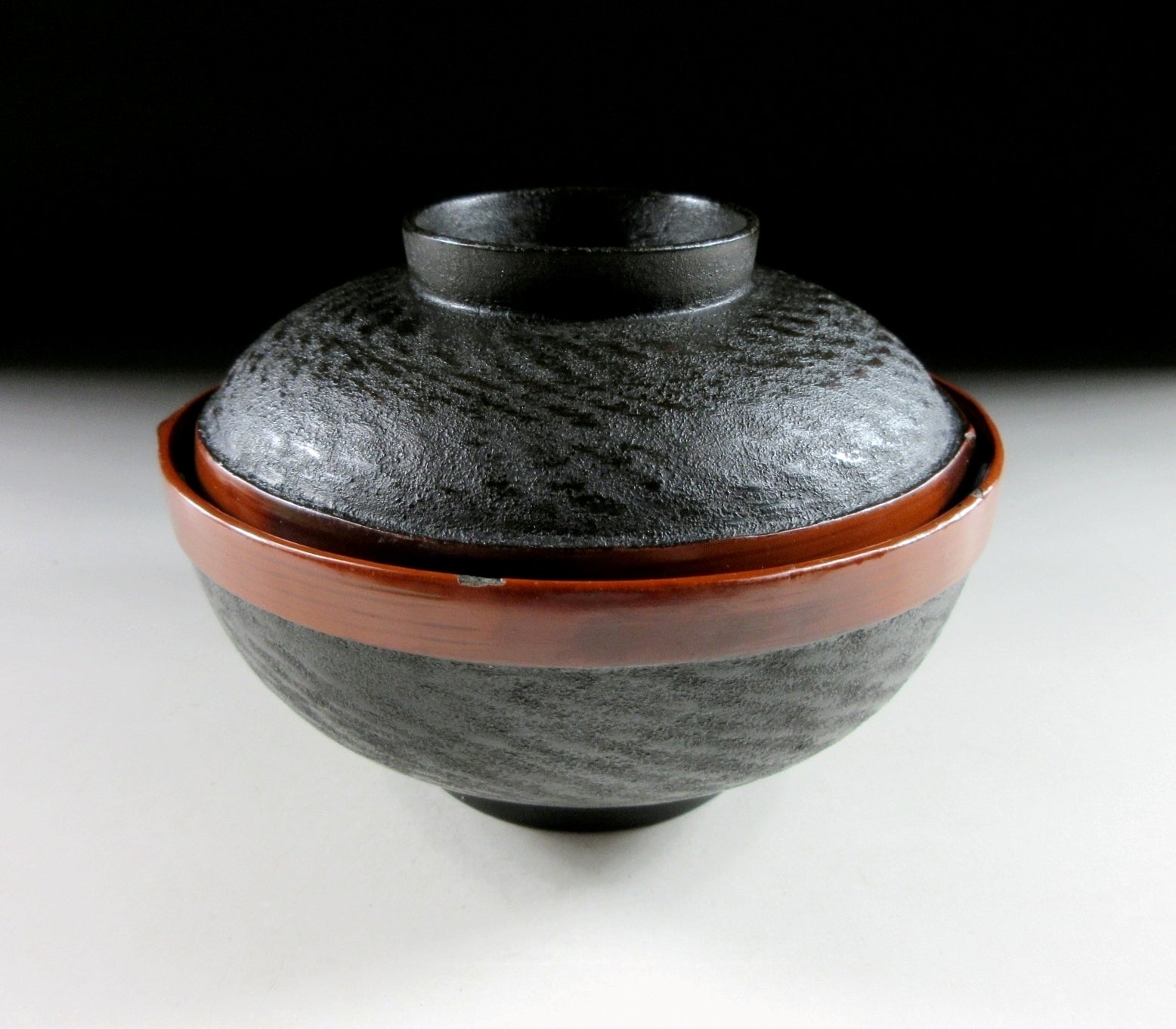 There’s faded lacquer on the interior as well as scratches. There are four spots of peeled lacquer on the rim, and three spots of peeled lacquer on the foot ring. There are scratches under the lid and some scuffing.