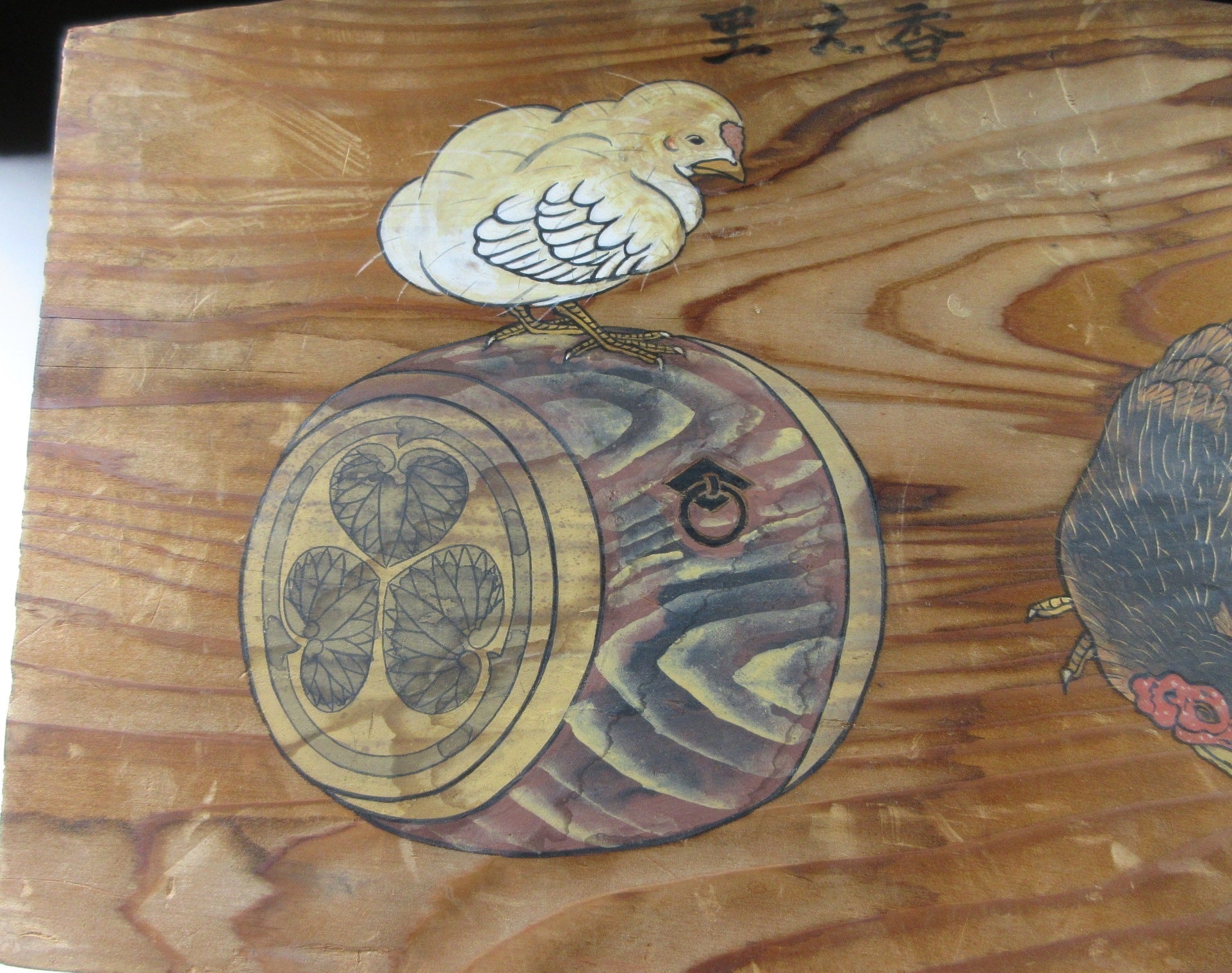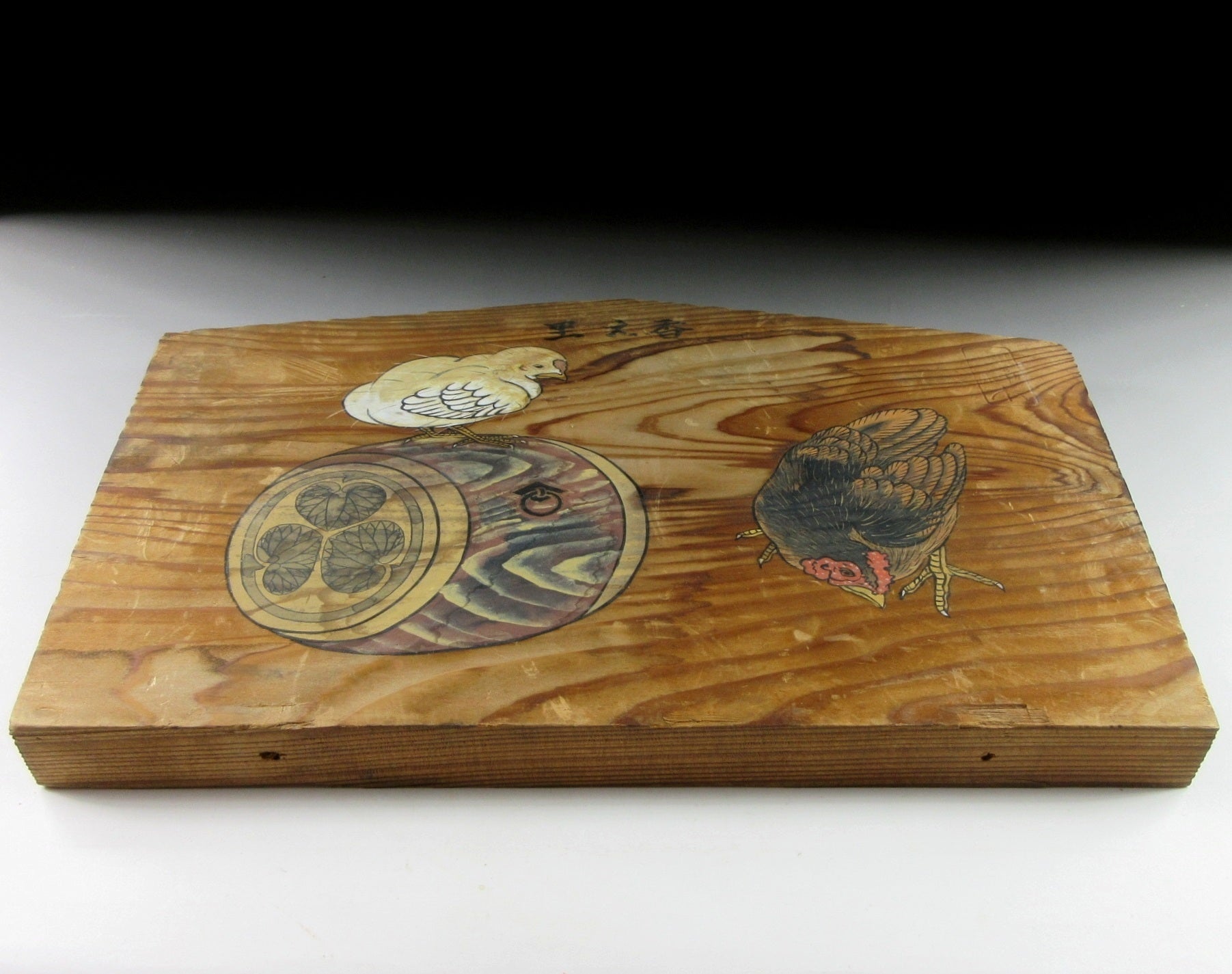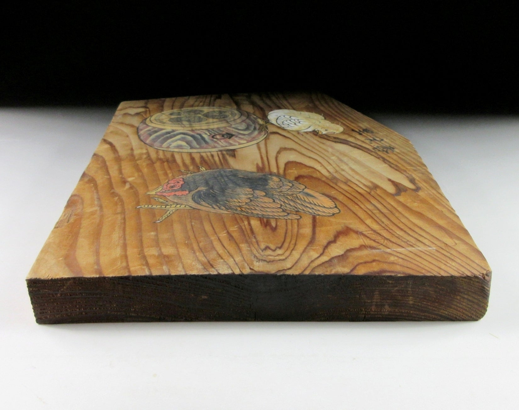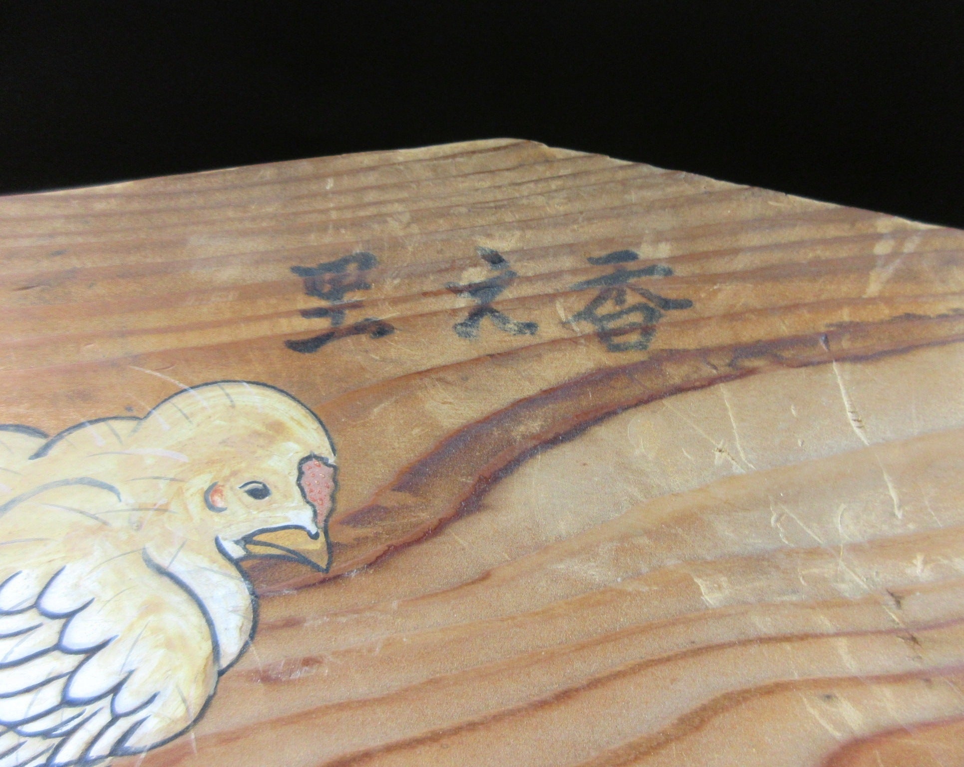This listing is for a large mid-Showa Period ema from Toshogu Shrine in Nikko. It is hand-painted and made to commemorate the Year of the Chicken. The kanji on the back says Nikko Toshogu Shrine and the kanji on the front reads as ‘goshinboku’. Goshinboku translates as ‘honourable sacred tree’, and are essentially regarded as religious artefacts. Such trees are said to mark the spots where deities have ascended to earth and now dwell. At shrines, the trunks of goshinboku have plaited rice straw rope tied around them with white zigzag paper called ‘shide’. Ema such as the one in this listing are made from goshinboku that have perished due to age or things such as lightning strikes.