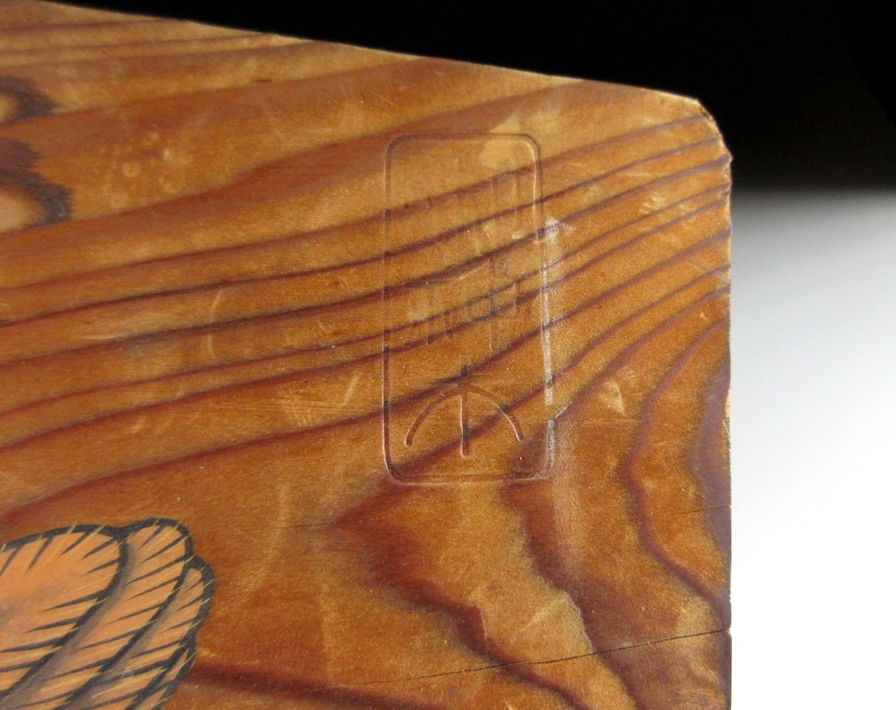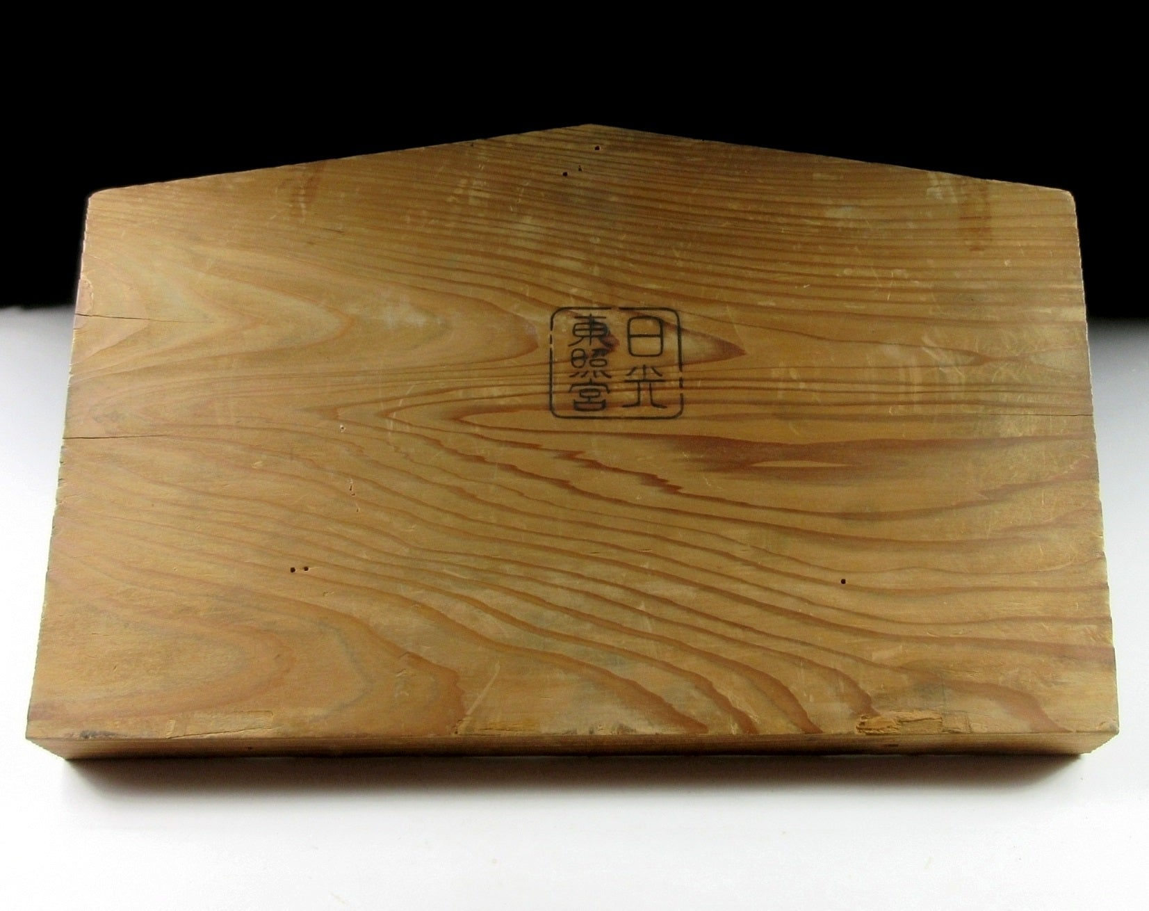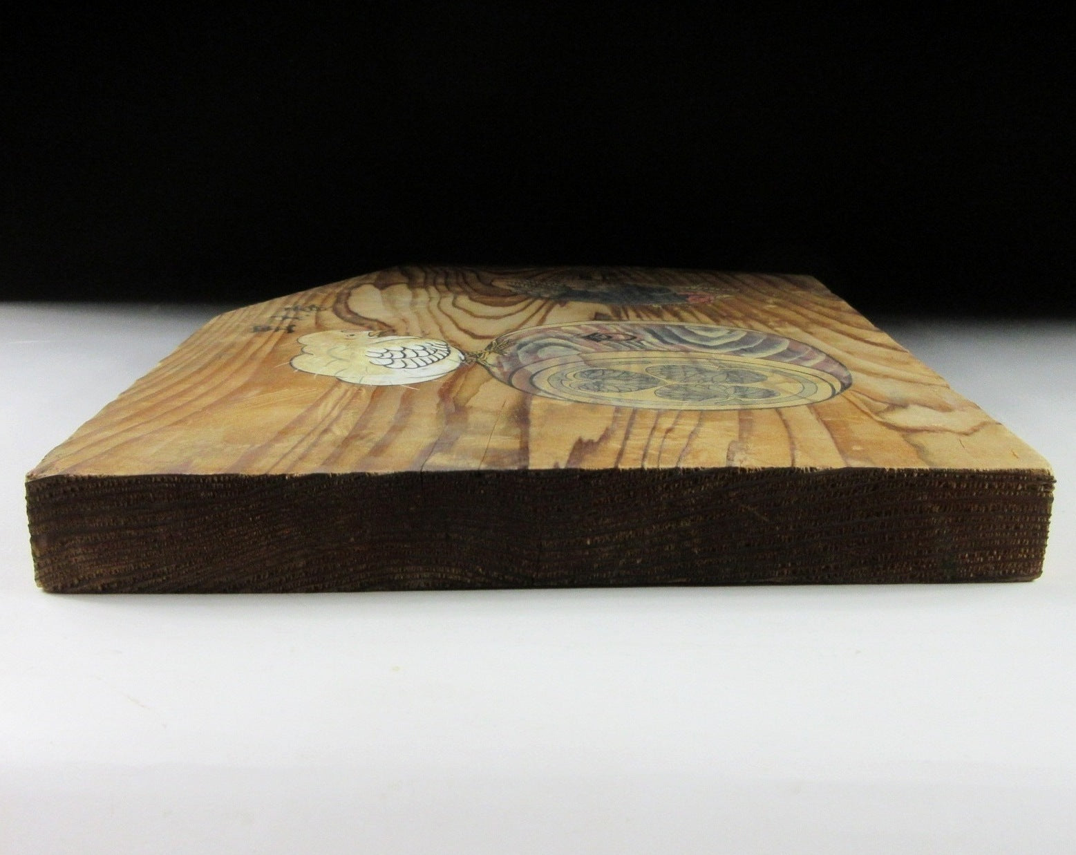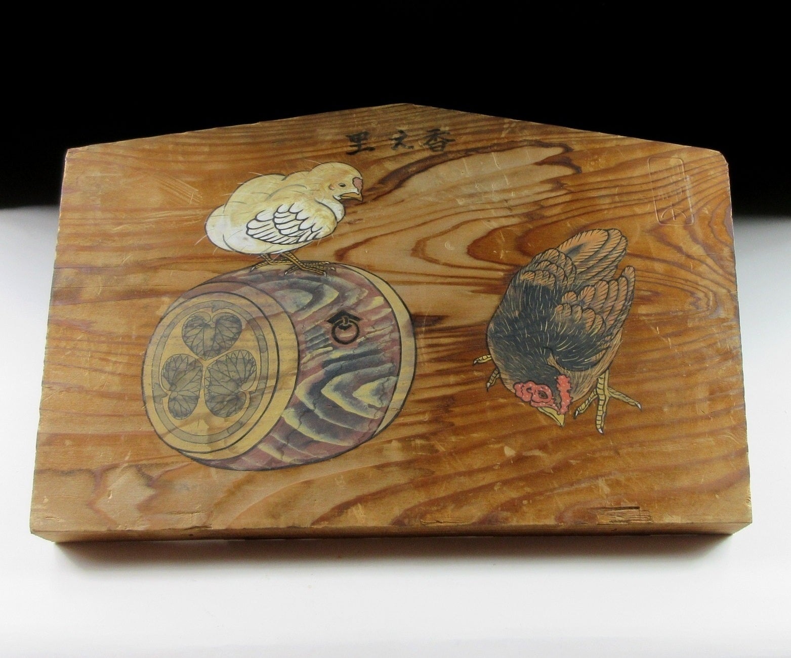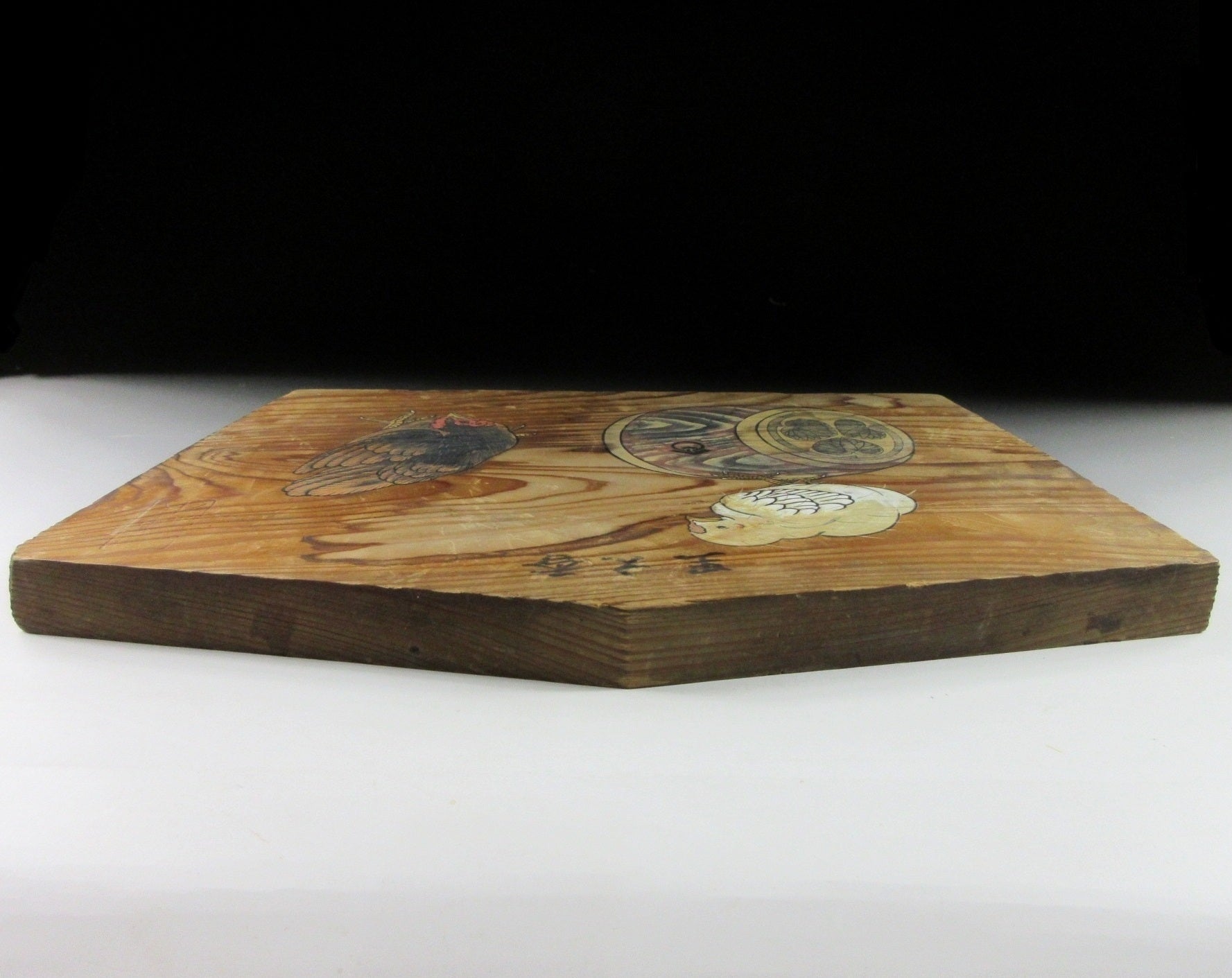 This listing is for a large mid-Showa Period ema from Toshogu Shrine in Nikko. It is hand-painted and made to commemorate the Year of the Chicken. The kanji on the back says Nikko Toshogu Shrine and the kanji on the front reads as ‘goshinboku’. Goshinboku translates as ‘honourable sacred tree’, and are essentially regarded as religious artefacts. Such trees are said to mark the spots where deities have ascended to earth and now dwell. At shrines, the trunks of goshinboku have plaited rice straw rope tied around them with white zigzag paper called ‘shide’. Ema such as the one in this listing are made from goshinboku that have perished due to age or things such as lightning strikes.