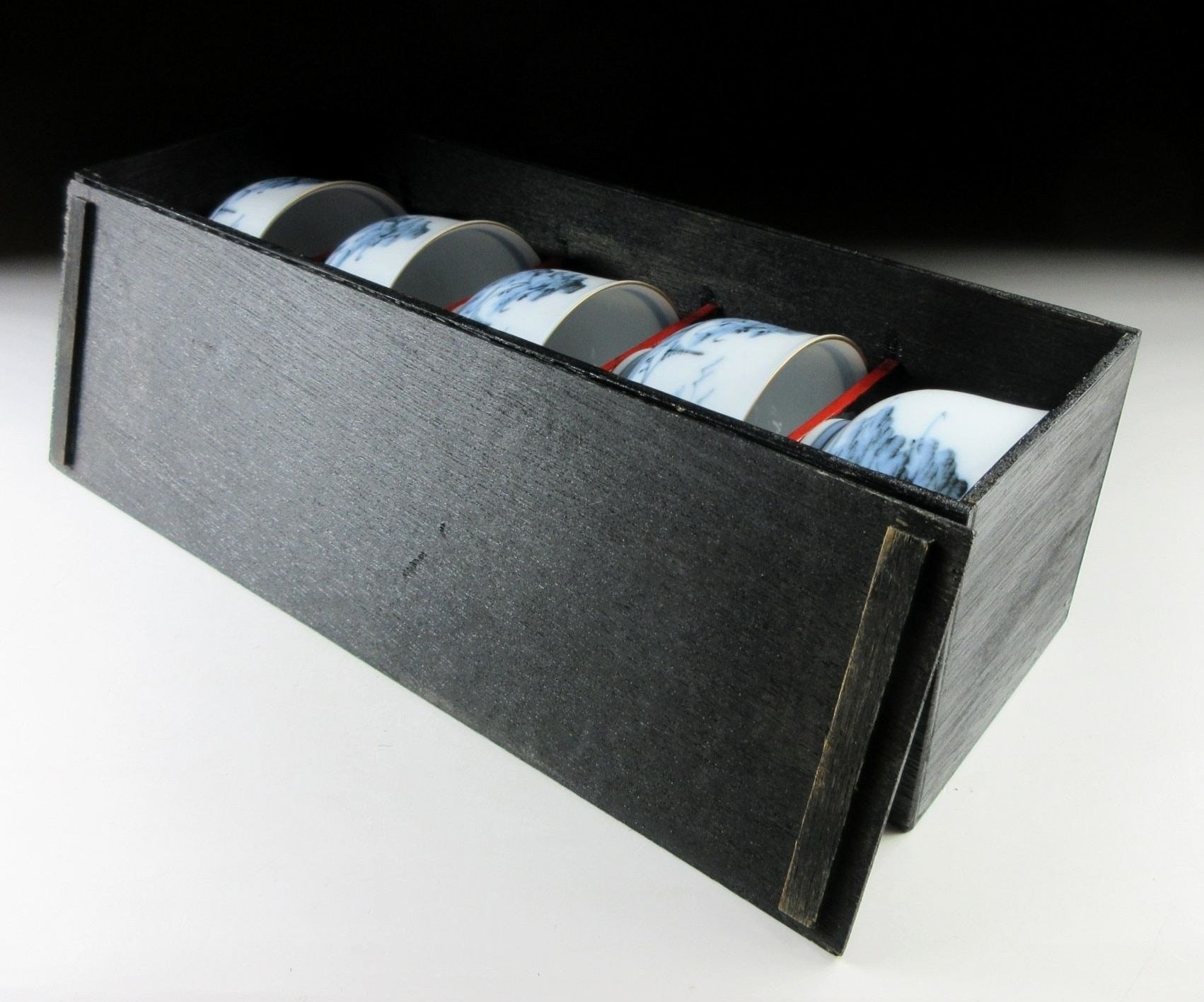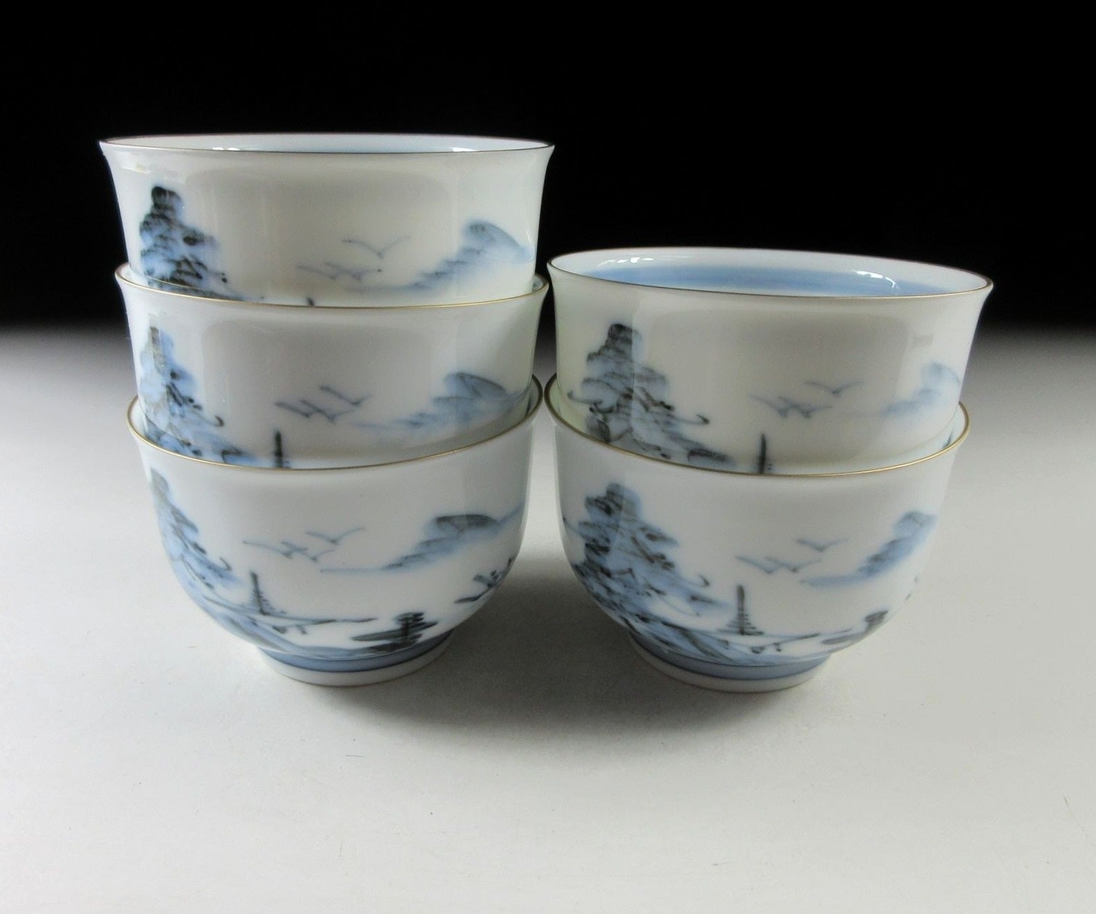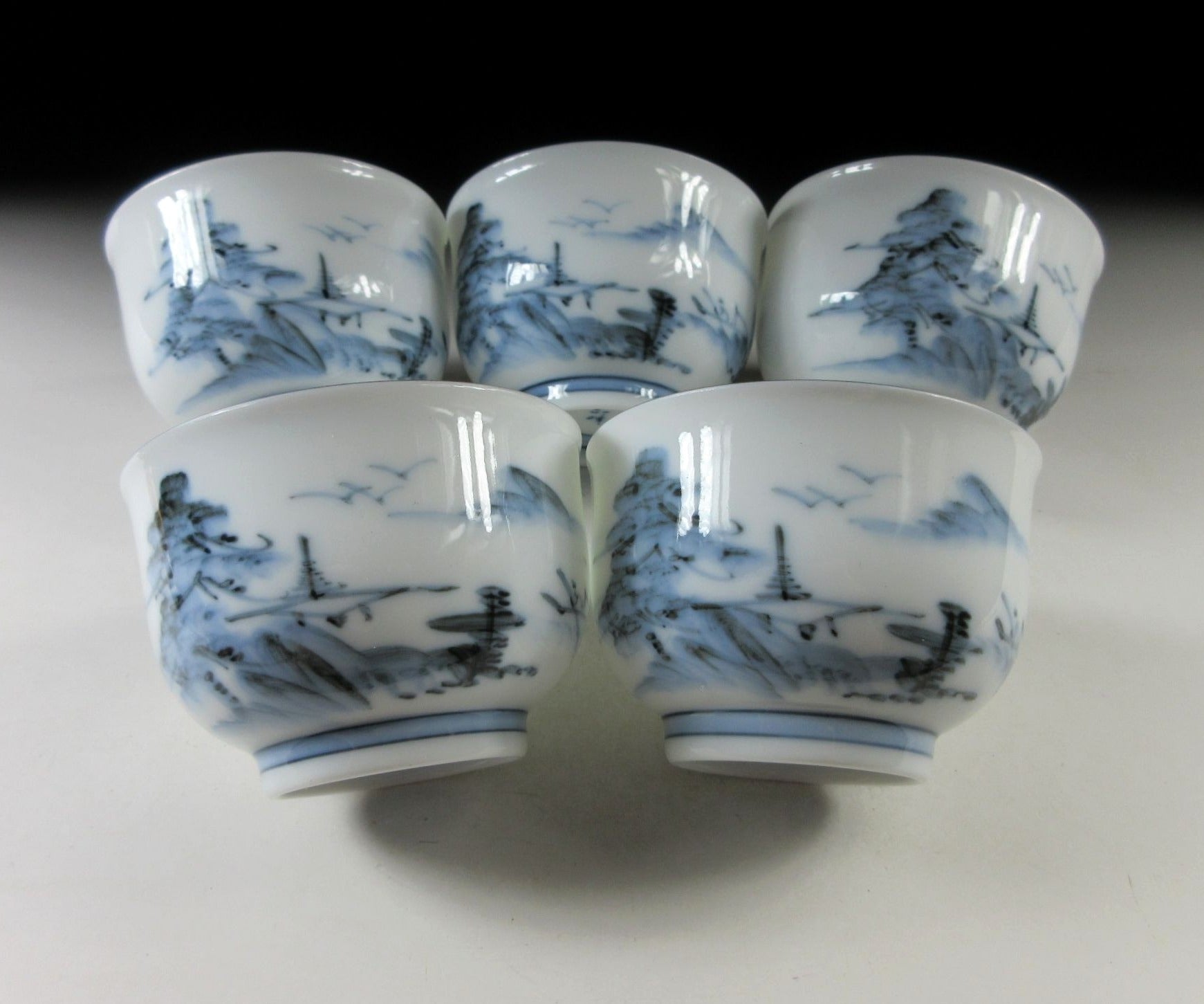 This listing is for a set of five Arita-ware tea cups made around 5-10 years ago by Nishimine Gama. They are wheel-thrown and decorated with Chinese inspired landscape scenery over a white porcelain base. This set is intended for serving sencha, and suitable for daily use. The signature of the kiln can be found on the bottom of each cup, and they come with their original lacquered storage box.