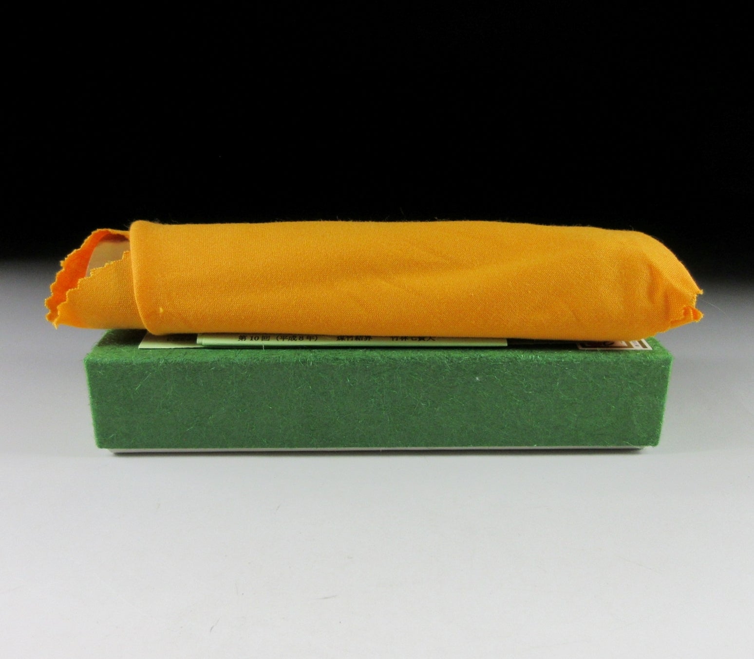 This listing is for an exquisite susutake bamboo chago made by sanuki take-ittobori master craftsman, Nishimura Akimine. A chago is a scoop for taking tea leaves from a chatsubo. They are generally made of bamboo and shaped like half a cylinder. The bamboo used for this particular chago gets its name from the colour of bamboo roofing in old thatched-roof minka. Over time, bamboo roofing beams become darkened due to constant exposure to the smoke from the central hearth. Susutake tea utensils undergo a long curing process, which makes them very tough and durable. The chago in this listing is intricately carved with a depiction of Hannya. Hannya is a female demon featured in Japanese Noh, an unusual choice for teaware. It comes with its original paper storage box as well as a stamped turmeric coloured wrapping cloth for when the item is not in use. It also comes with a Japanese language profile paper about the craftsman.