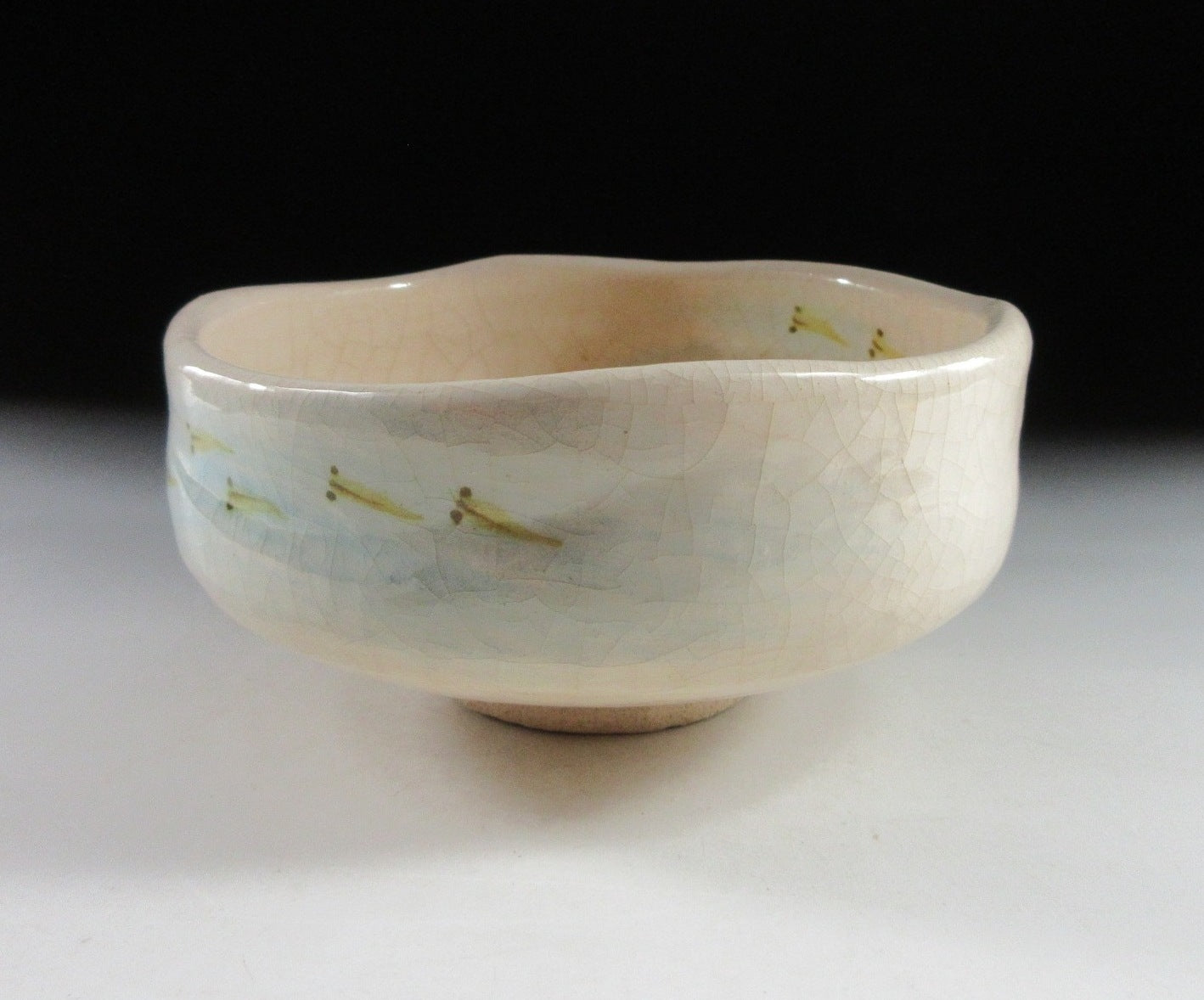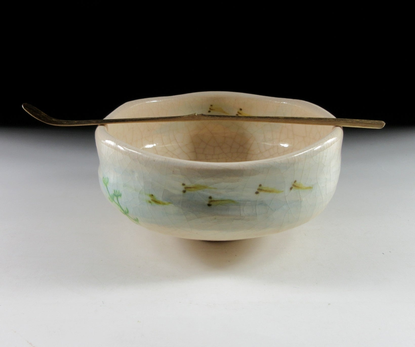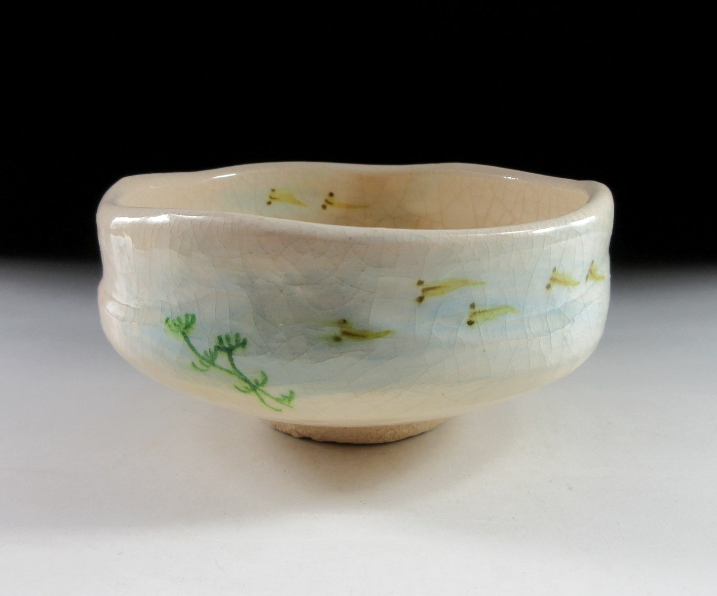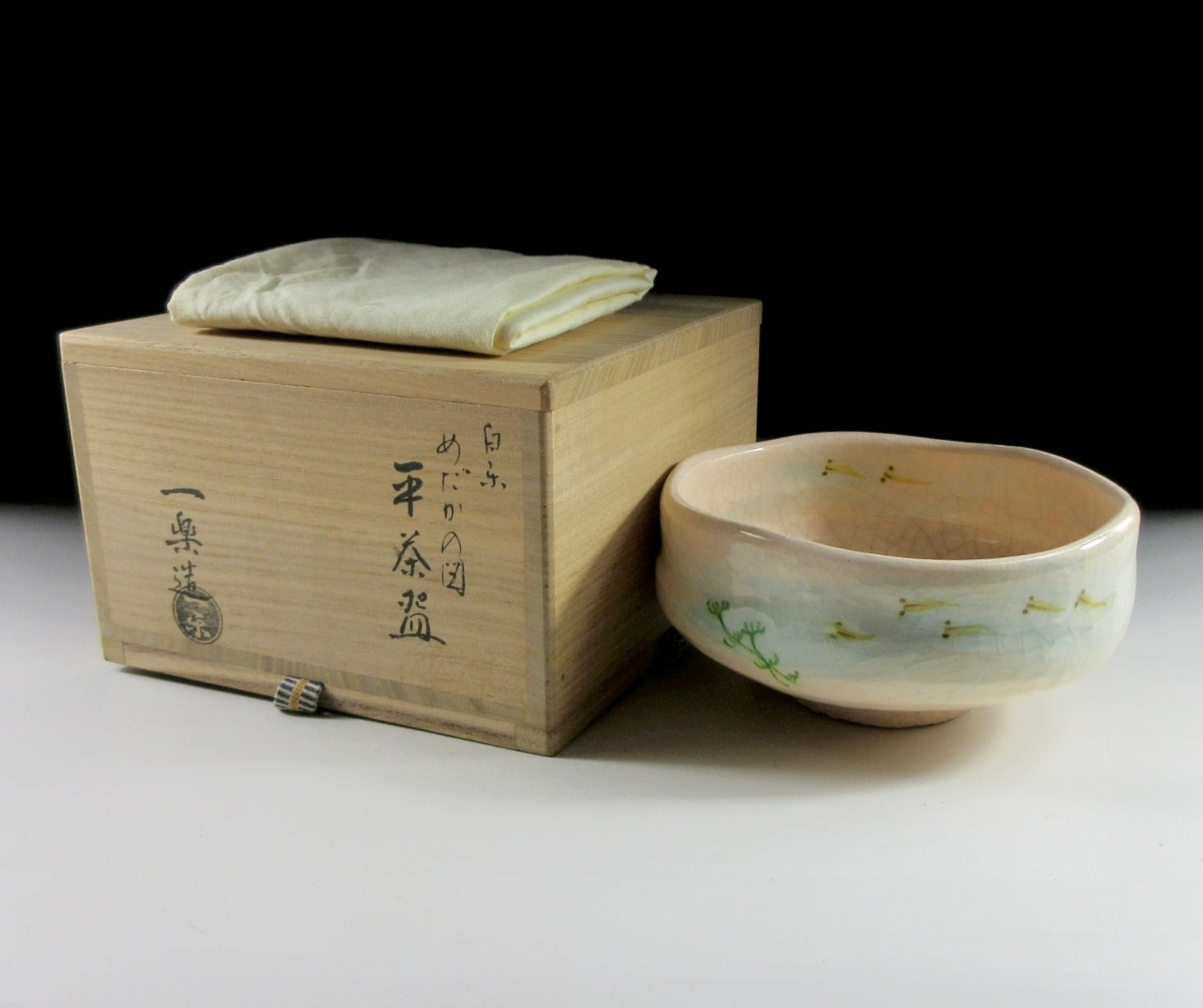 This listing is for a low fired raku chawan made around 10-20 years ago by noted potter, Nishimura Ichiraku. It is hand-turned and the flat hira type used during the summer season. Hira chawan are shallow bowls with low sides designed to cool tea down faster. The bowl in this listing is decorated with small medaka fish. Medaka are a small type of summer fish that inhabit rice paddies, lotus ponds, and slow moving streams. Depictions of them can be found on wind chimes, fans, and textiles, thus enabling people to feel a little cooler during the hot summer weather. The stamp of the potter can be found on the bottom, and it comes with its original signed wooden storage box. It also comes with a stamped yellow wrapping cloth for when the item is not in use. *PLEASE NOTE THAT THE CHASHAKU TEA SCOOP IS NOT INCLUDED.