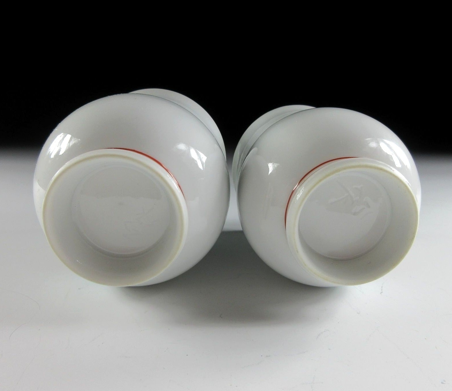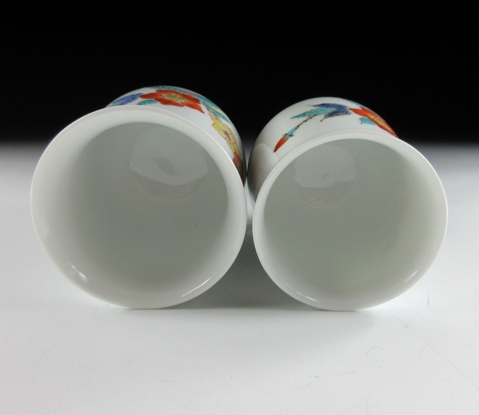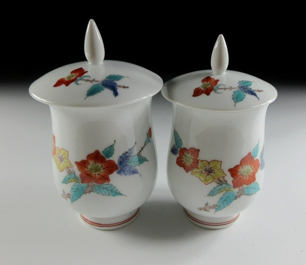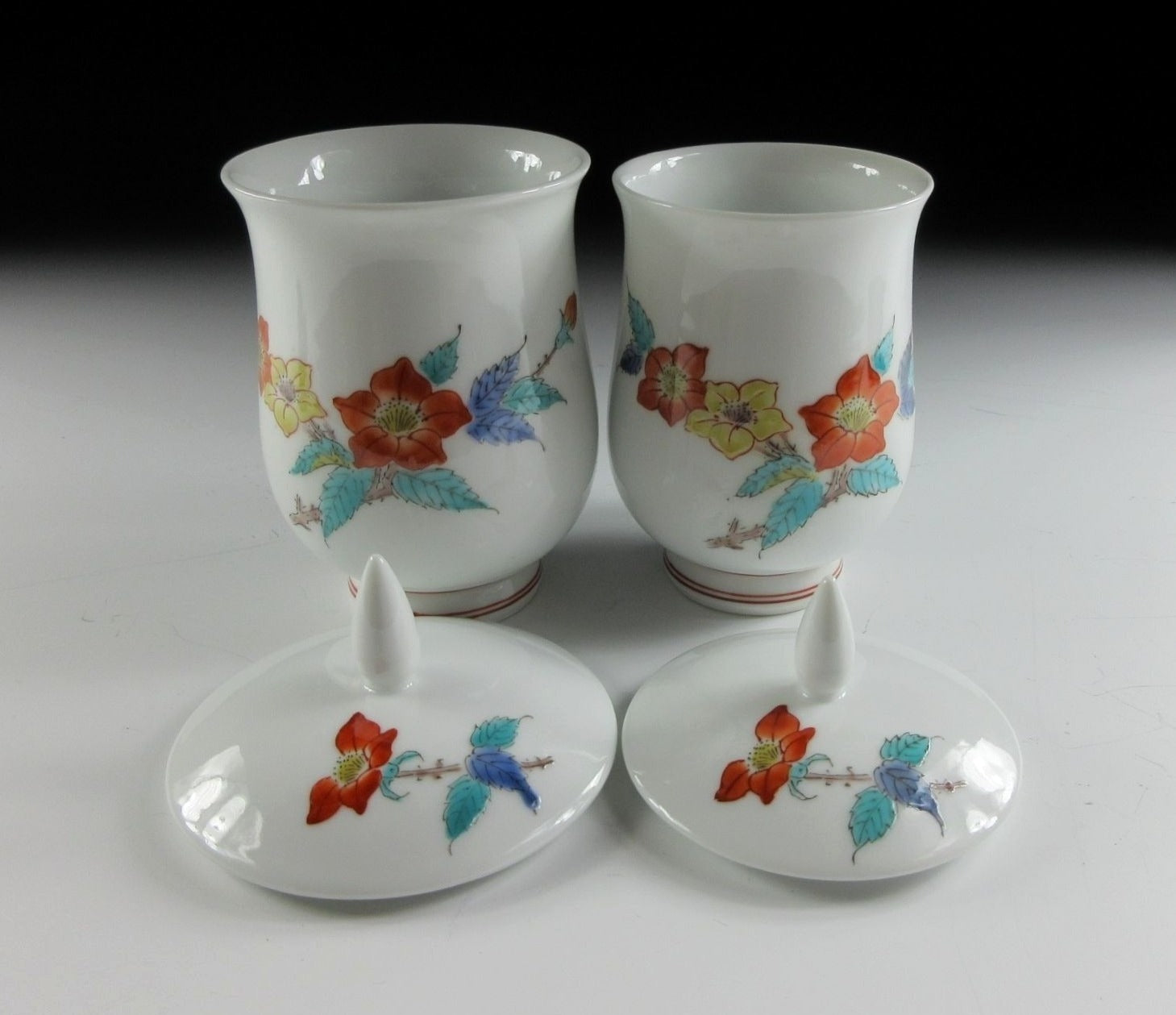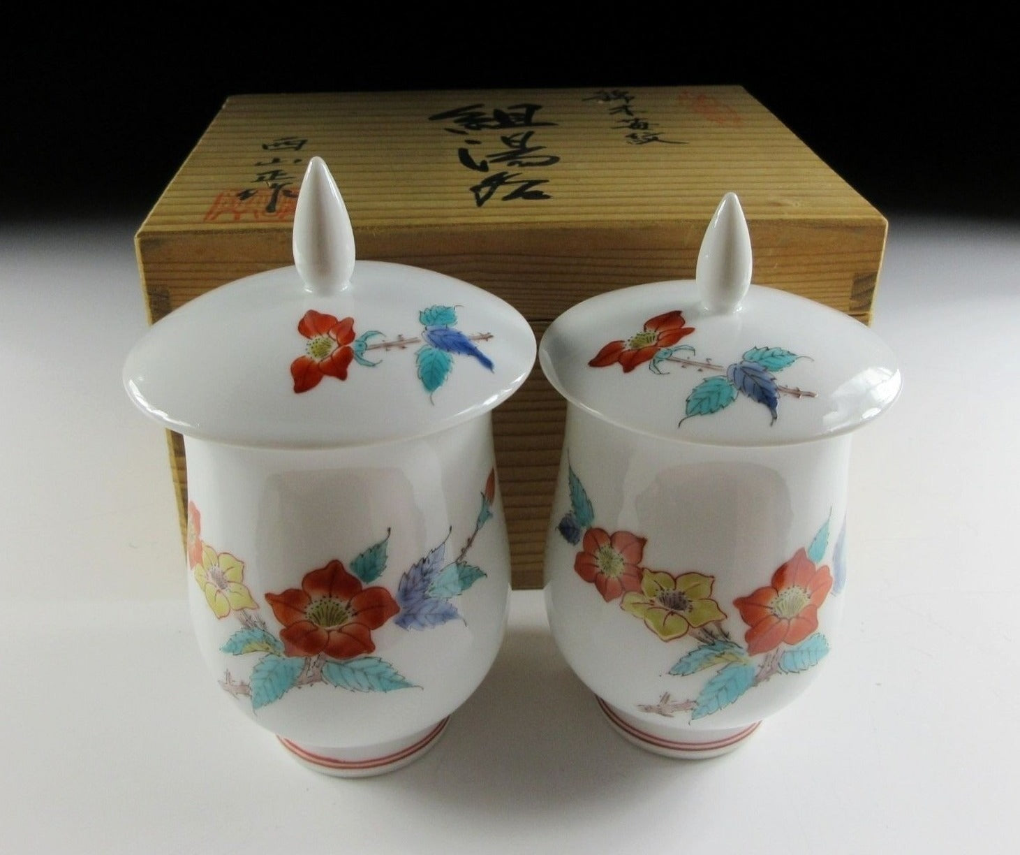 This listing is for a pair of Iro-Nabeshima lidded tea cups made by distinguished potter, Nishiyama Tadashi. They are wheel-thrown and decorated with wild raspberry blossoms. Each cup comes with a matching lid to keep your tea nice and warm during the cooler months. The signature of the potter can be found on the bottom of each cup, and they come with their original signed wooden storage box.