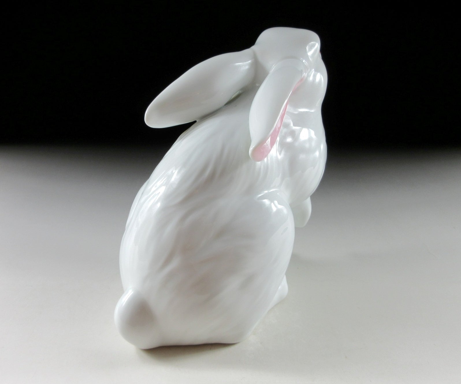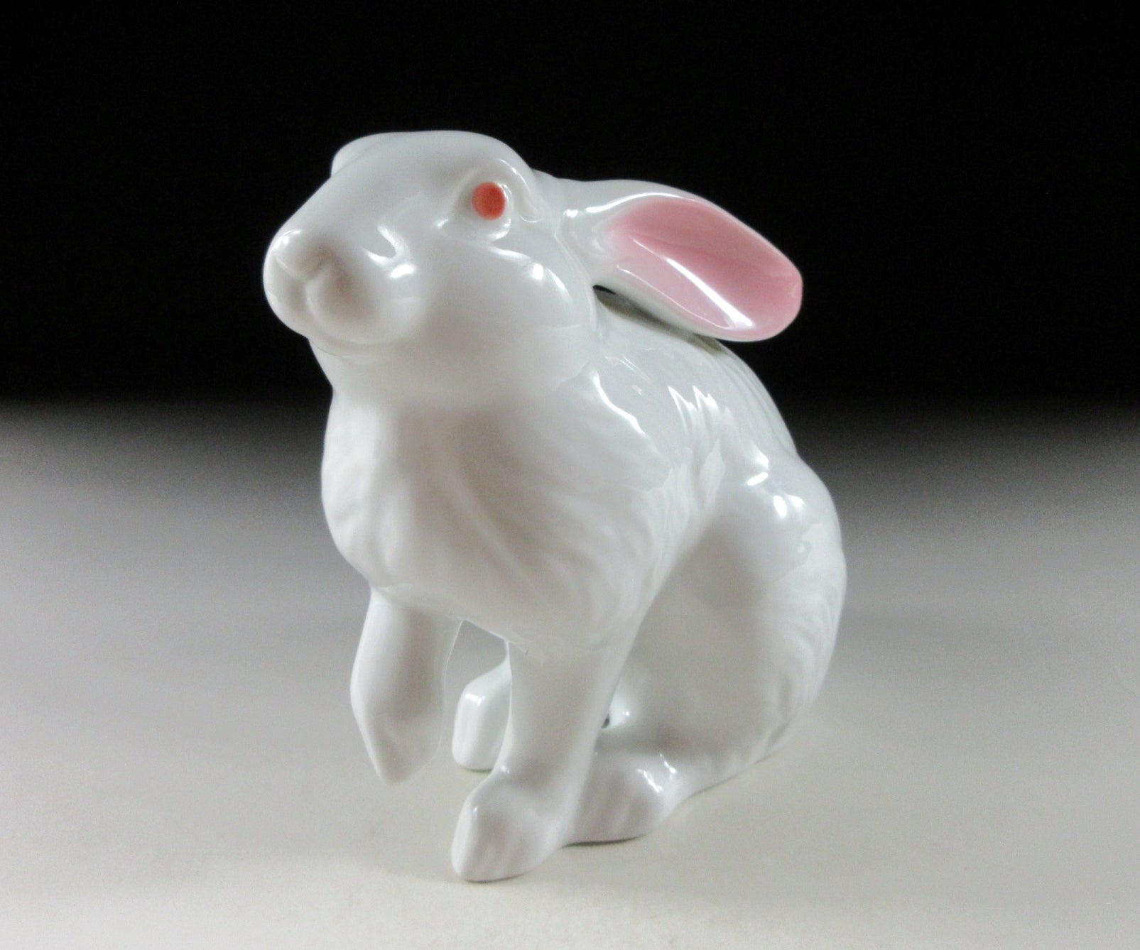 This listing is for an Arita-ware rabbit okimono made around 20-30 years ago by Noguchi Shozan. It is made from a slip mould and coated in glossy hakuji glaze, and it also features pink ears and red eyes. During autumn, Japan celebrates the harvest moon festival known as tsukimi. When the harvest moon appears, people gaze up at the sky hoping to catch a glimpse of the rabbit that lives on the moon. This piece was most likely made to commemorate the Year of the Rabbit back in either 1987 or 1999. The stamp of the potter can be found on the bottom.