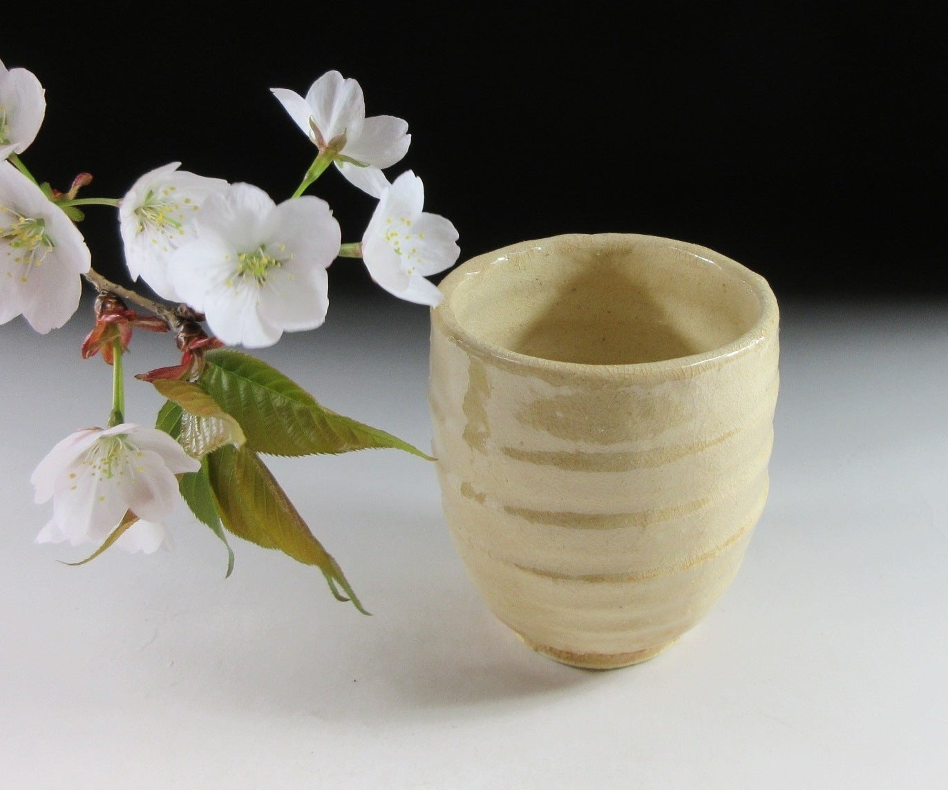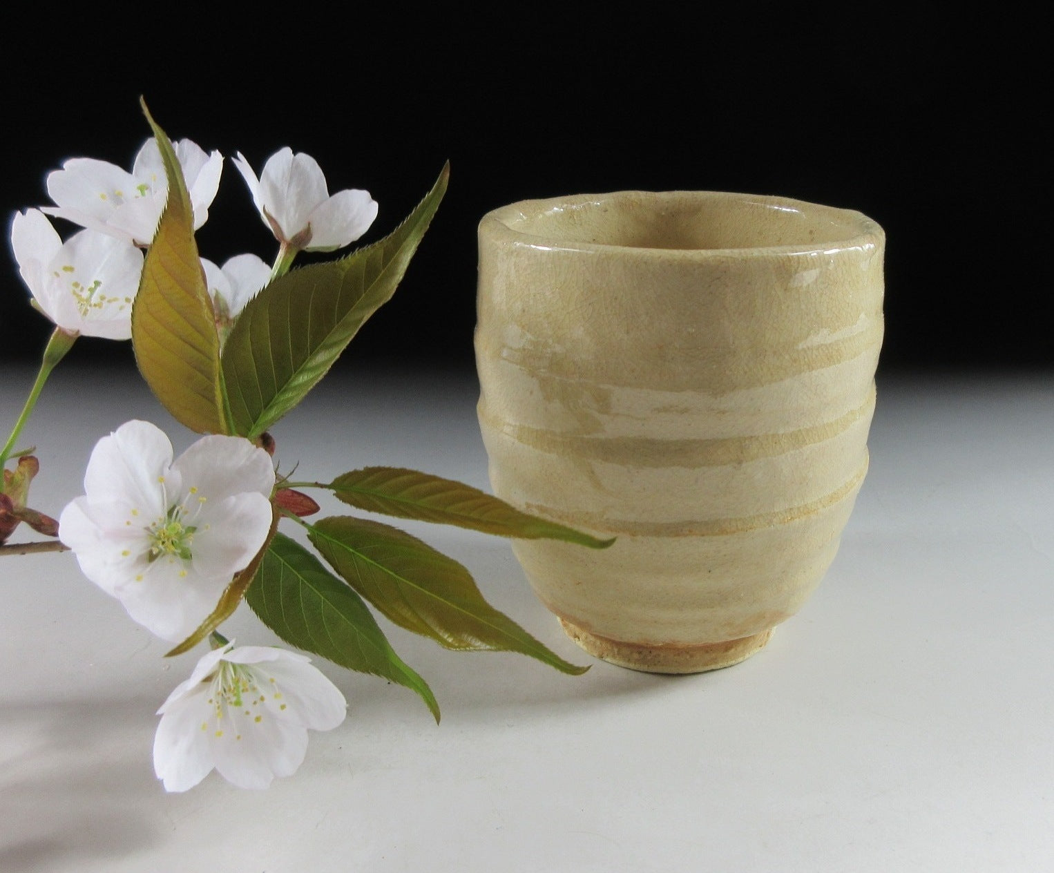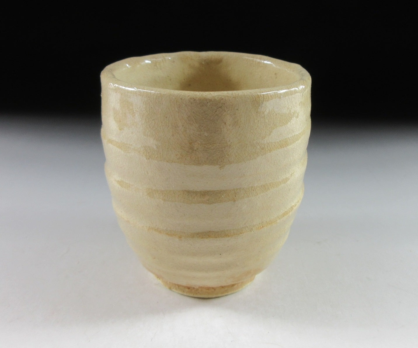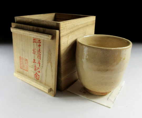 This listing is for a Hagi-ware yunomi style tea cup made around 30 years ago by distinguished potter, Nosaka Koki. It is wheel-thrown and coated transparent white glaze over a slightly gritty stoneware base. The surface consists of shallow rings and grooves made during the throwing process. This is a nice little cup for daily use, over time the colour will change and become darker. The stamp of the potter can be found on the bottom, and it comes with its original signed wooden storage box. It also comes with a Japanese language profile about the potter.