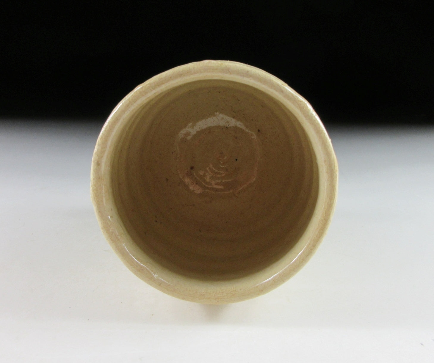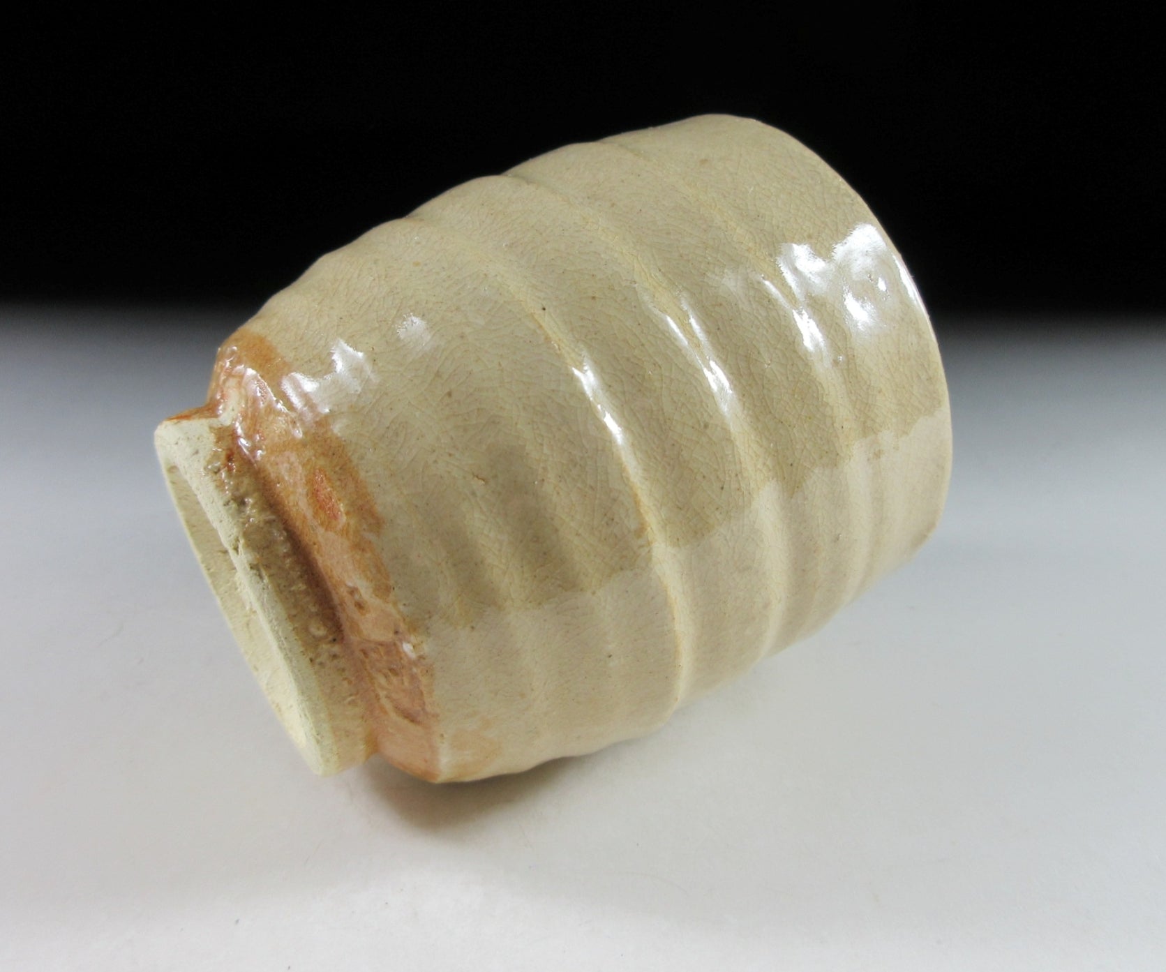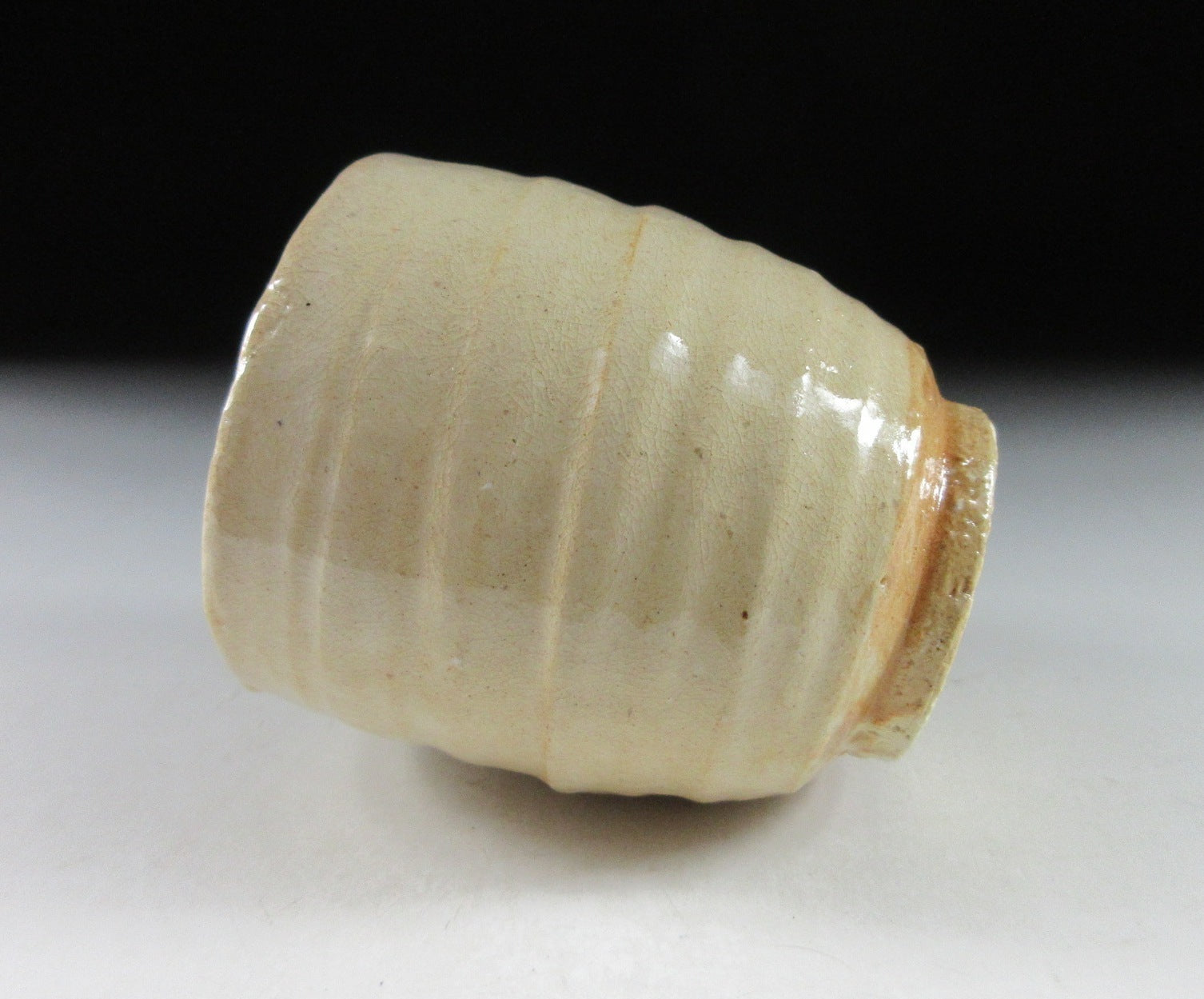 This listing is for a Hagi-ware yunomi style tea cup made around 30 years ago by distinguished potter, Nosaka Koki. It is wheel-thrown and coated transparent white glaze over a slightly gritty stoneware base. The surface consists of shallow rings and grooves made during the throwing process. This is a nice little cup for daily use, over time the colour will change and become darker. The stamp of the potter can be found on the bottom, and it comes with its original signed wooden storage box. It also comes with a Japanese language profile about the potter.