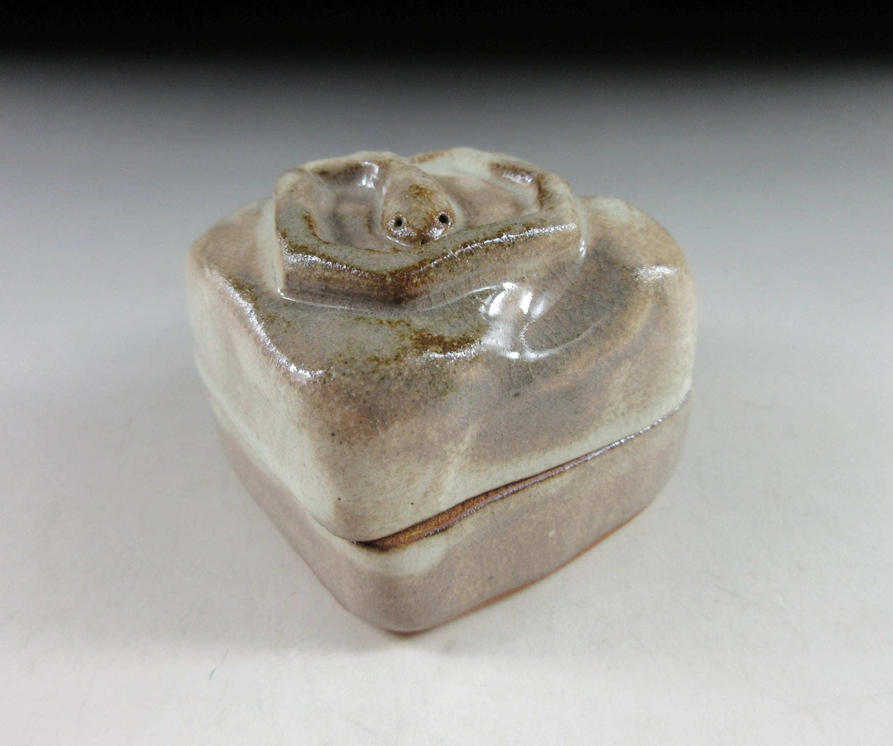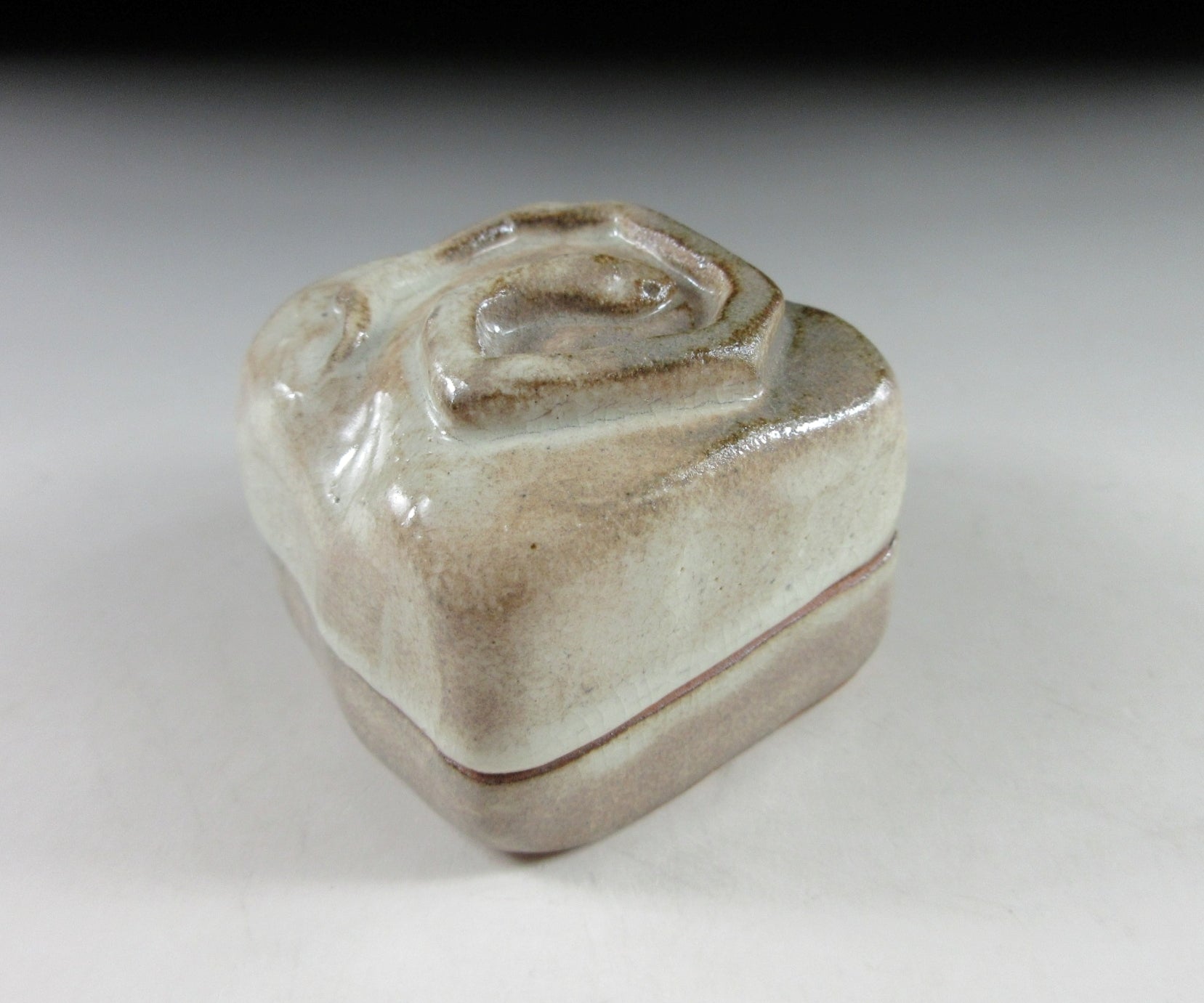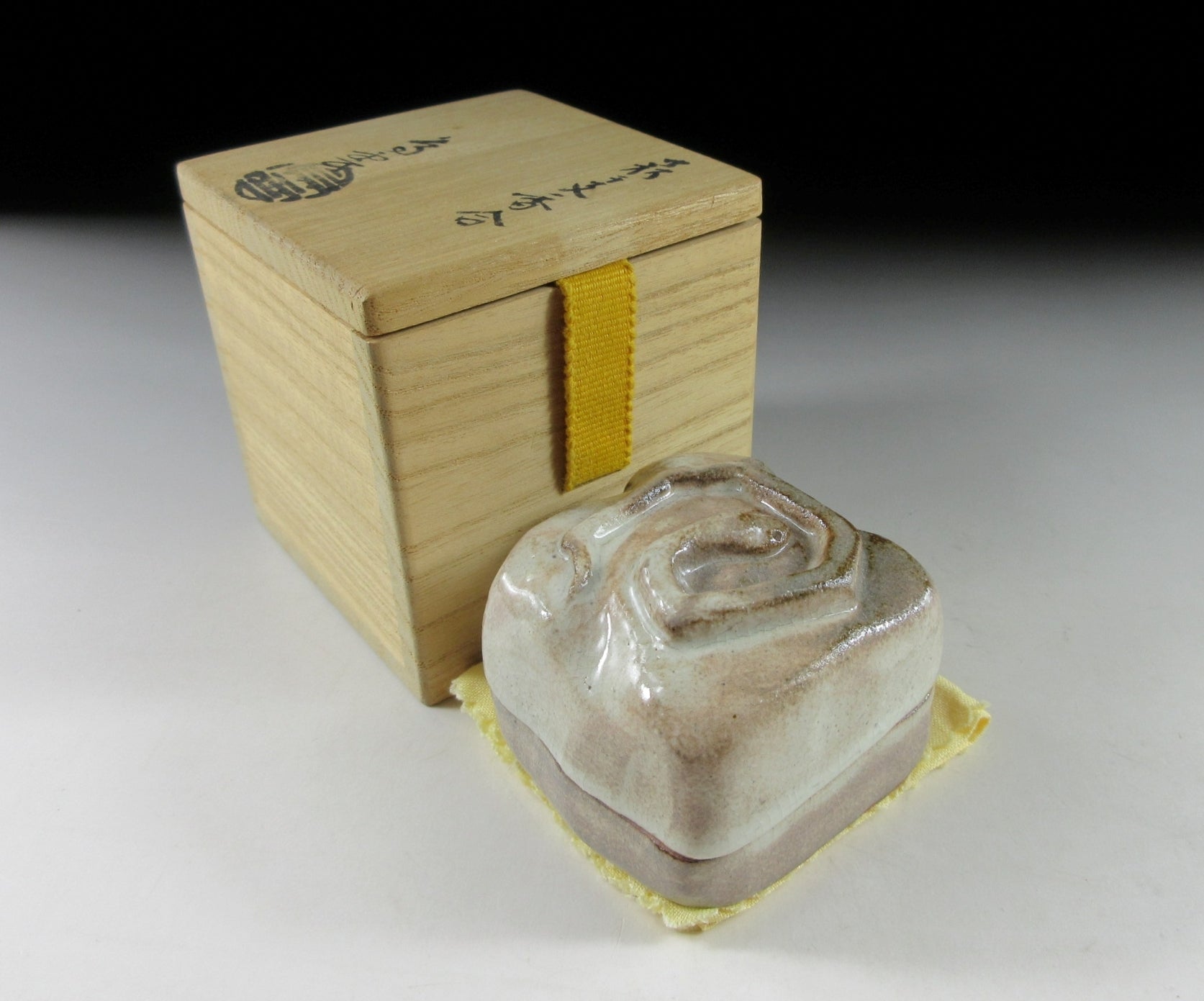 This listing is for a Hagi-ware kogo made around 25 years ago by Notomi Choun I. It is made of high-fired stoneware and the lid is decorated with a small snake shaped like the kanji character for ‘snake’. It is suitable for holding both woodchip and kneaded incense, although pottery kogo are intended for kneaded incense. This piece was most likely made to commemorate the Year of the Snake back in 2001. The stamp of the potter can be found on the bottom, and it comes with its original signed wooden storage box. It also comes with a stamped yellow wrapping cloth for when the item is not in use.