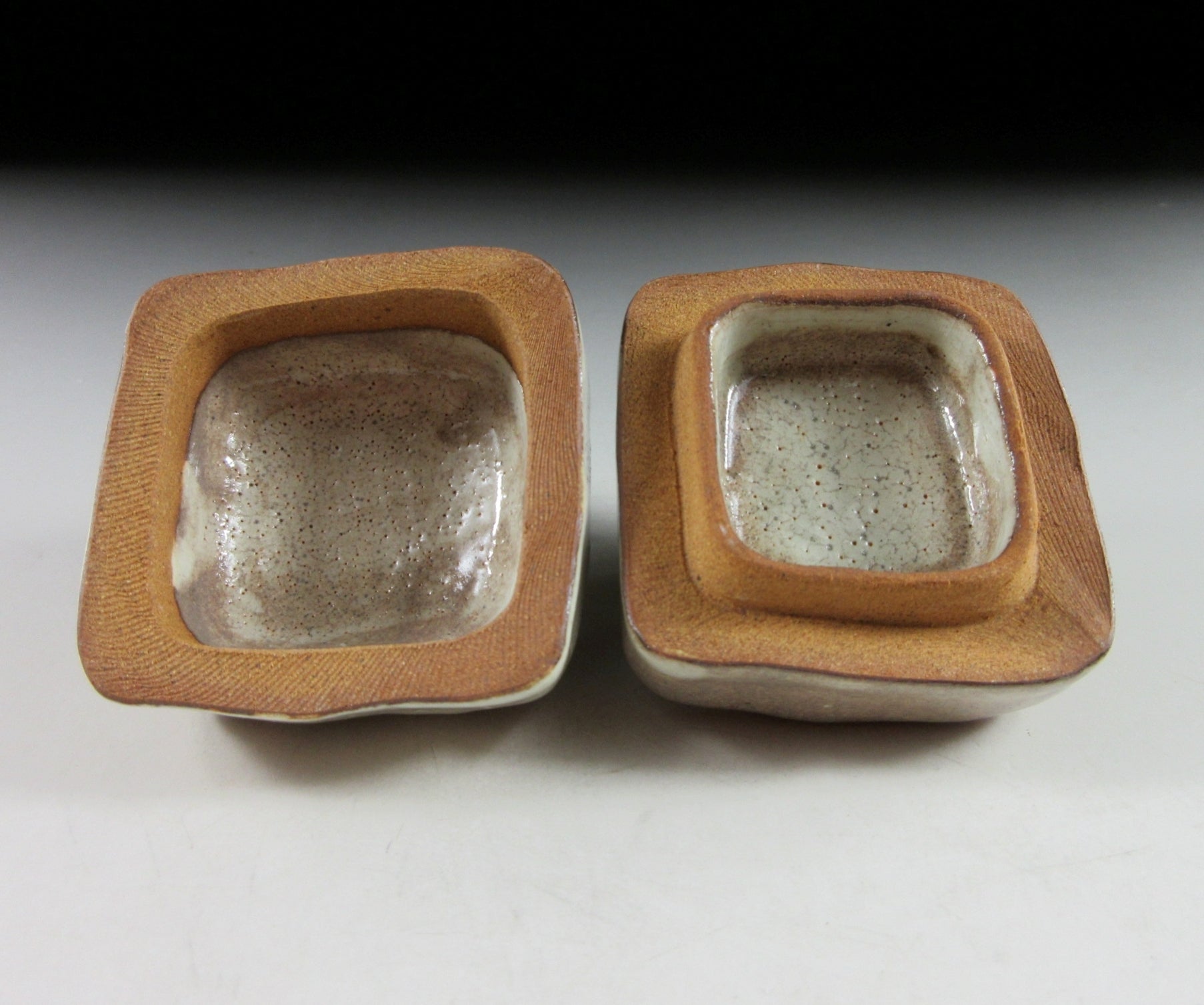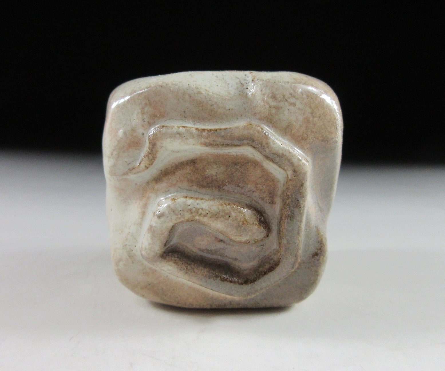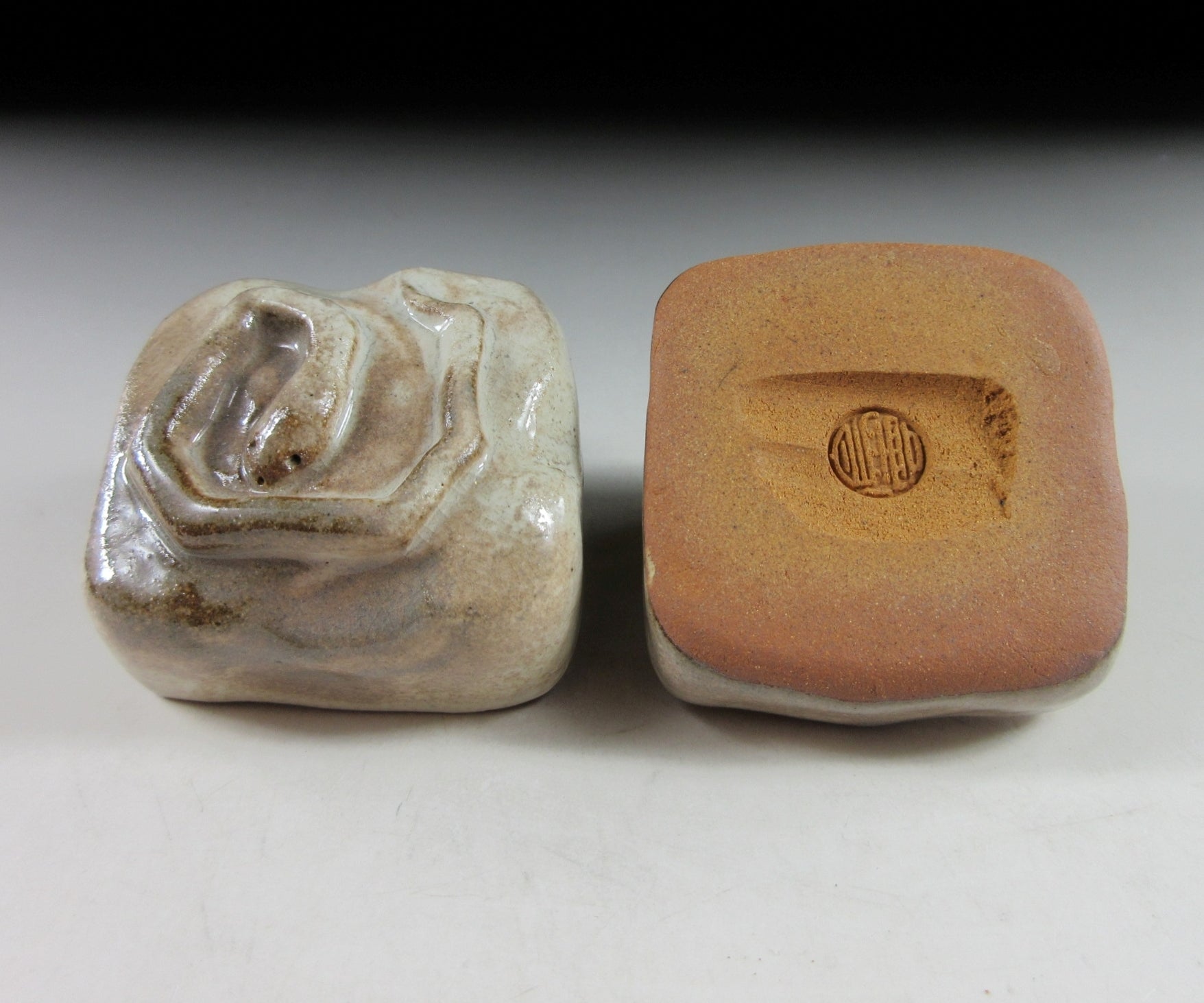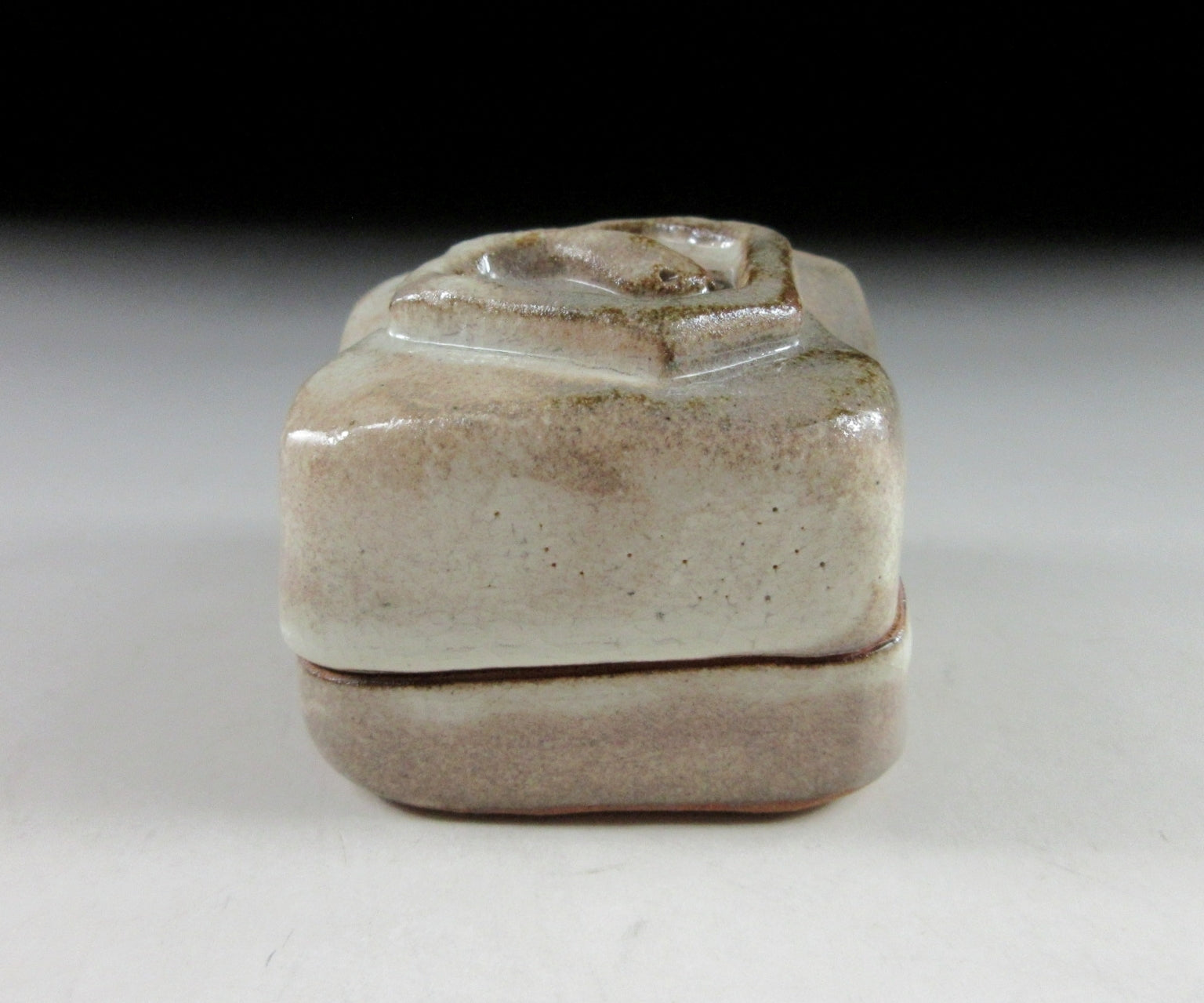 This listing is for a Hagi-ware kogo made around 25 years ago by Notomi Choun I. It is made of high-fired stoneware and the lid is decorated with a small snake shaped like the kanji character for ‘snake’. It is suitable for holding both woodchip and kneaded incense, although pottery kogo are intended for kneaded incense. This piece was most likely made to commemorate the Year of the Snake back in 2001. The stamp of the potter can be found on the bottom, and it comes with its original signed wooden storage box. It also comes with a stamped yellow wrapping cloth for when the item is not in use.