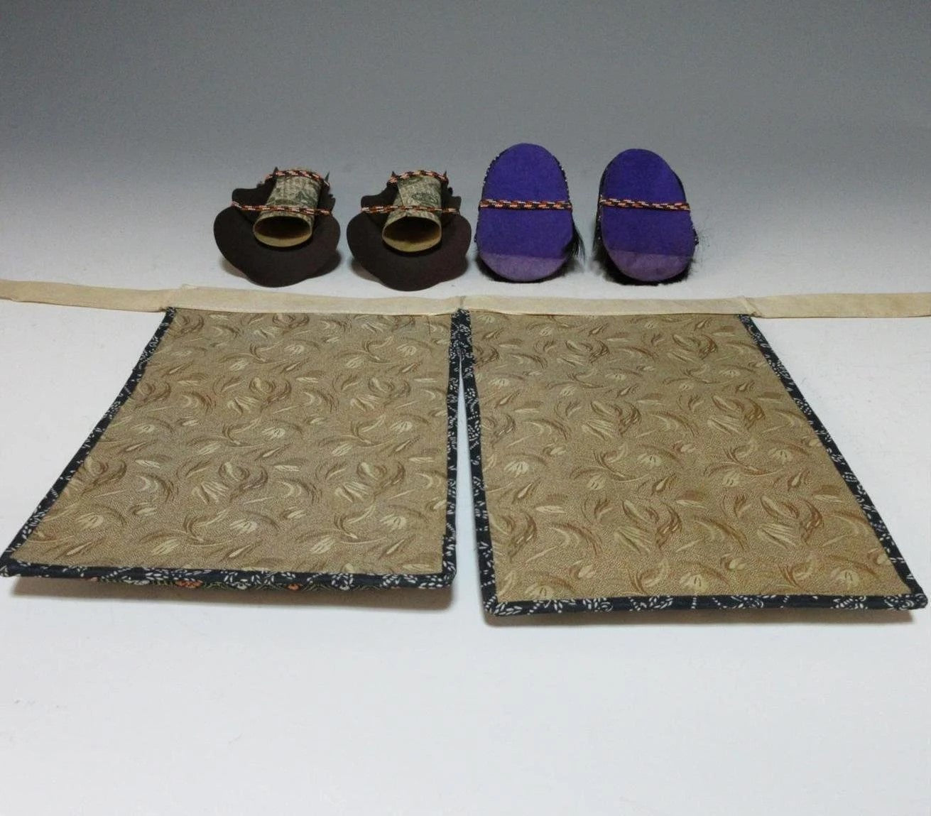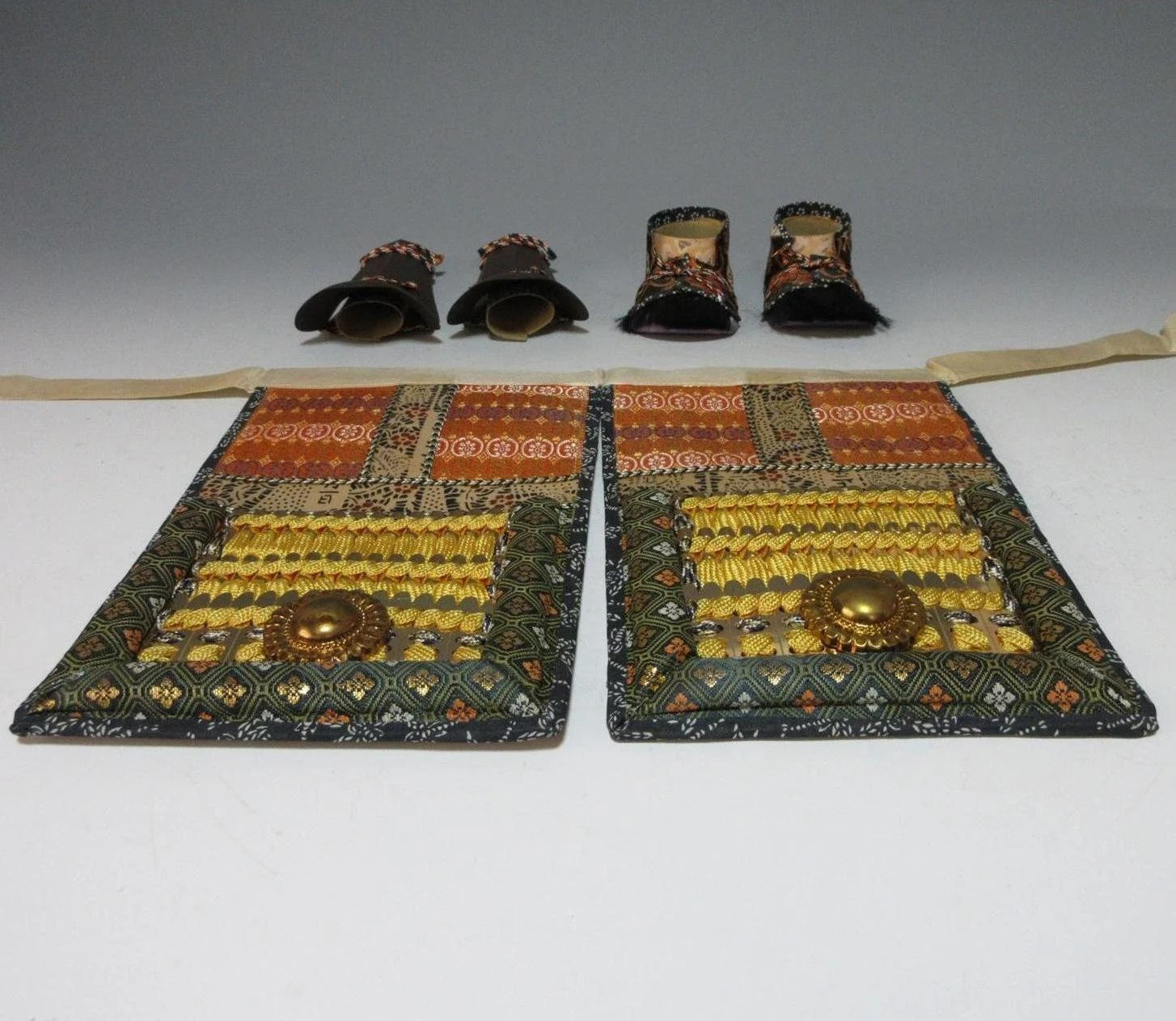 The box has minor scratches and some wood chipped off near the foot, and the purple string is faded. The set also comes with an outer paper box which is discoloured but in good condition. There is patina on the “antlers” and minor scuffing on the shin guards, and the cloth covered cardboard parts located on the back of the armour are curled around the edges. The orange tassels on the back are scruffy, and some of the armour’s flap parts (front, back, legs) are slightly misshapen/warped due to being stored for so long without use.