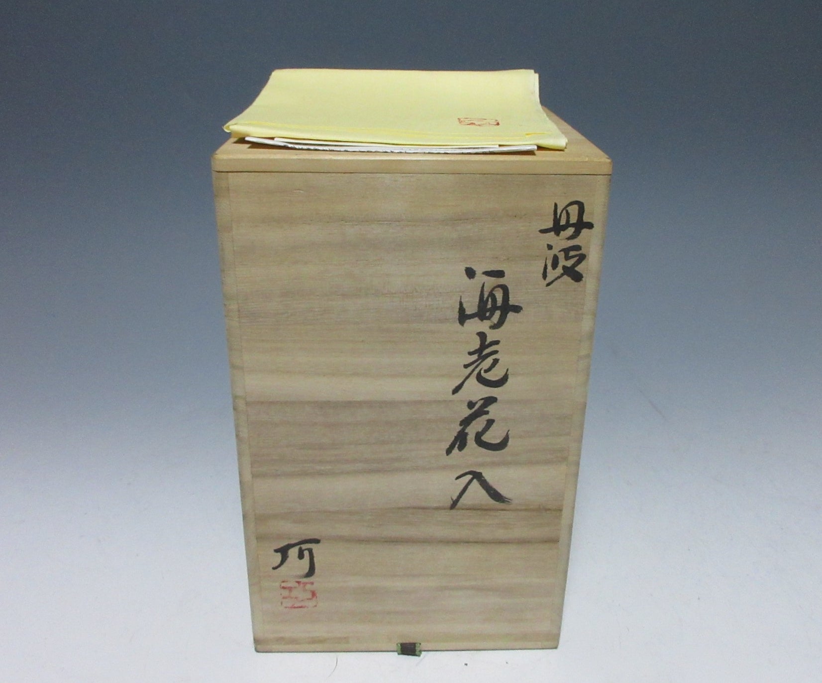 This listing is for an exquisite Tanba-ware vase made around 10 years ago by noted potter, Ogami Takumi. It is wheel thrown and the front is decorated with an iron glazed depiction of an Ise ebi (spiny lobster) over white slip. This piece also features transparent celadon glaze, and the rim is wide enough to accommodate a decent sized arrangement of flowers. The stamp of the potter can be found on the bottom, and it comes with its original signed wooden storage box. It also comes with a stamped yellow wrapping cloth for when the item is not in use, as well as a Japanese language profile paper about the potter.