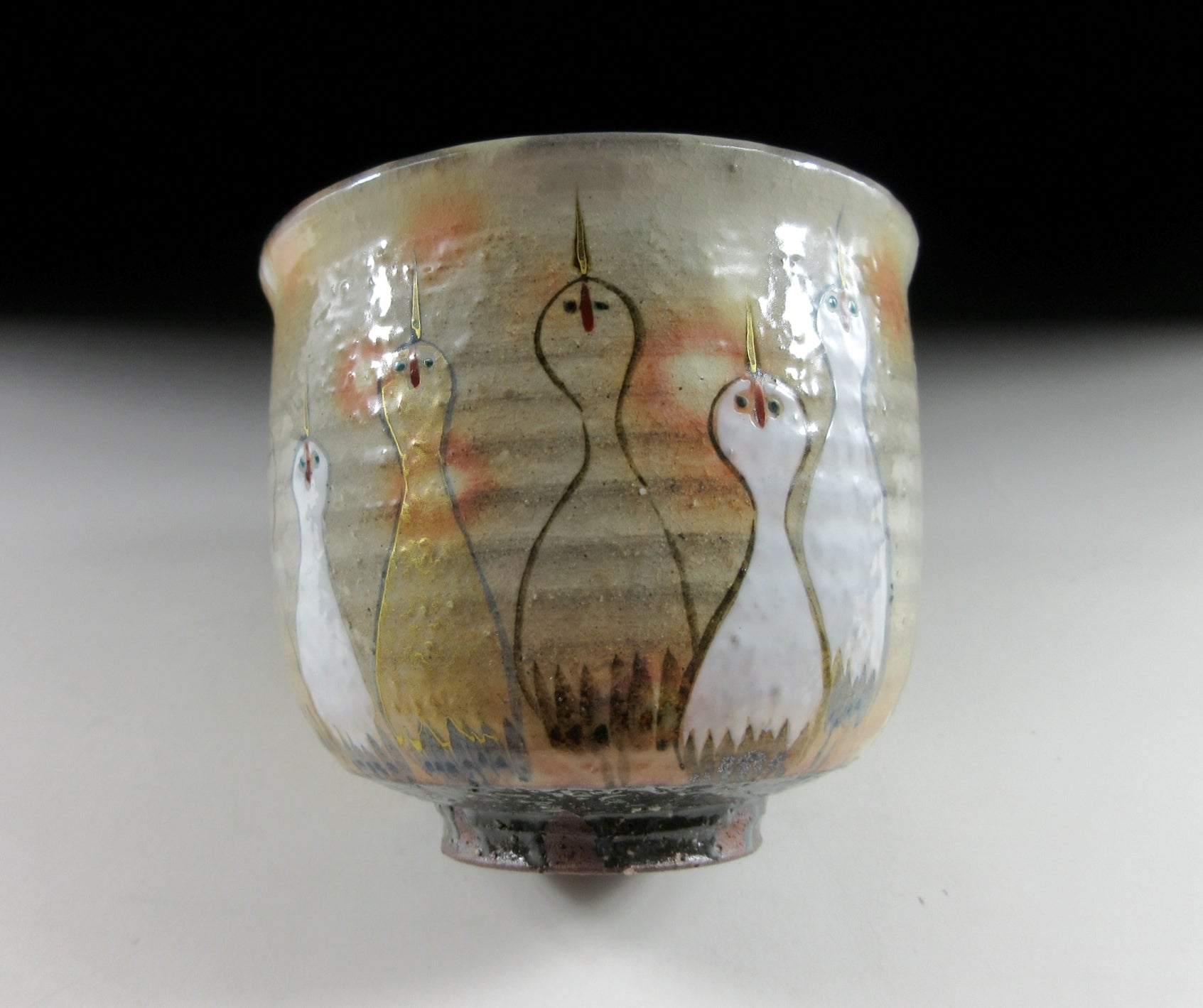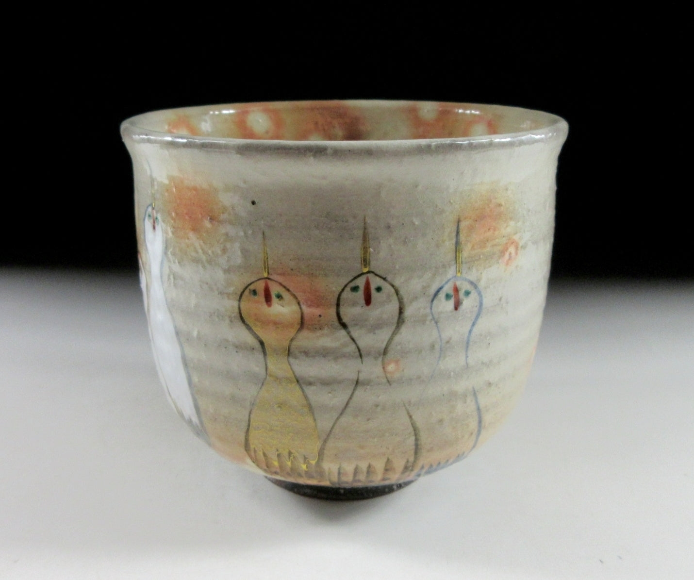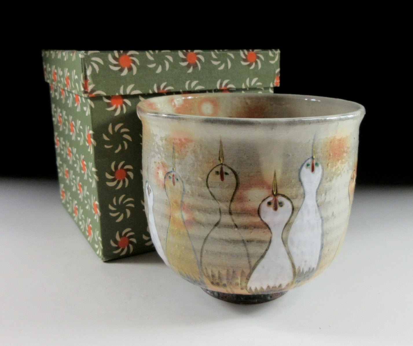 This listing is for a rather beautiful Kyo-ware tsutsu jawan made around 20-30 years ago by noted potter, Ogura Toru. Tsutsu jawan are winter tea bowls, their tall shape keeps the tea hotter for longer, flat hira chawan being the opposite and set aside for summer use. The jawan in this listing is wheel-thrown and decorated with hand painted depictions of ‘tachizuru’ standing cranes. This unique and somewhat stylised depiction is attributed to master potter Ogata Kenzan (1663-1743). This piece also features gohonte markings. Gohonte refers to the pale spots that appear on the pottery due to the natural reactions from the iron found in the clay when being fired in the kiln. The stamp of the potter can be found on the bottom, and it comes with its original paper storage box.
