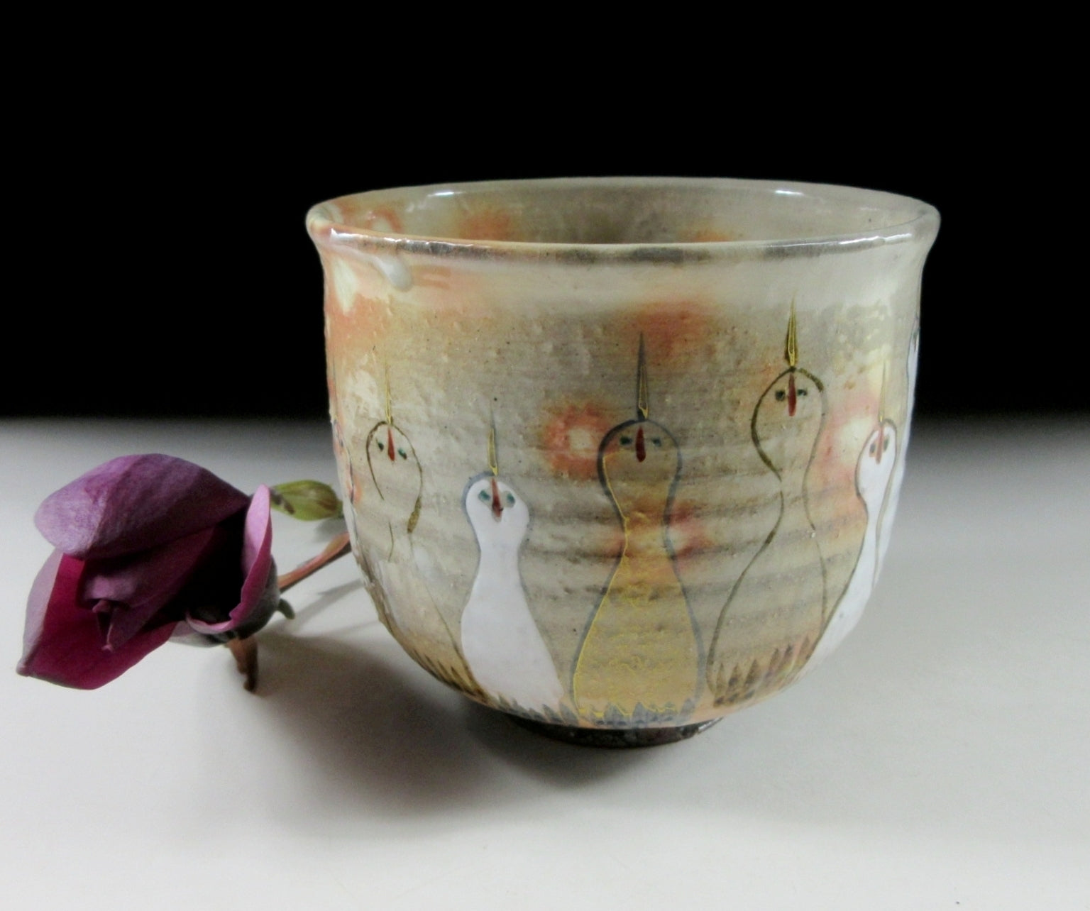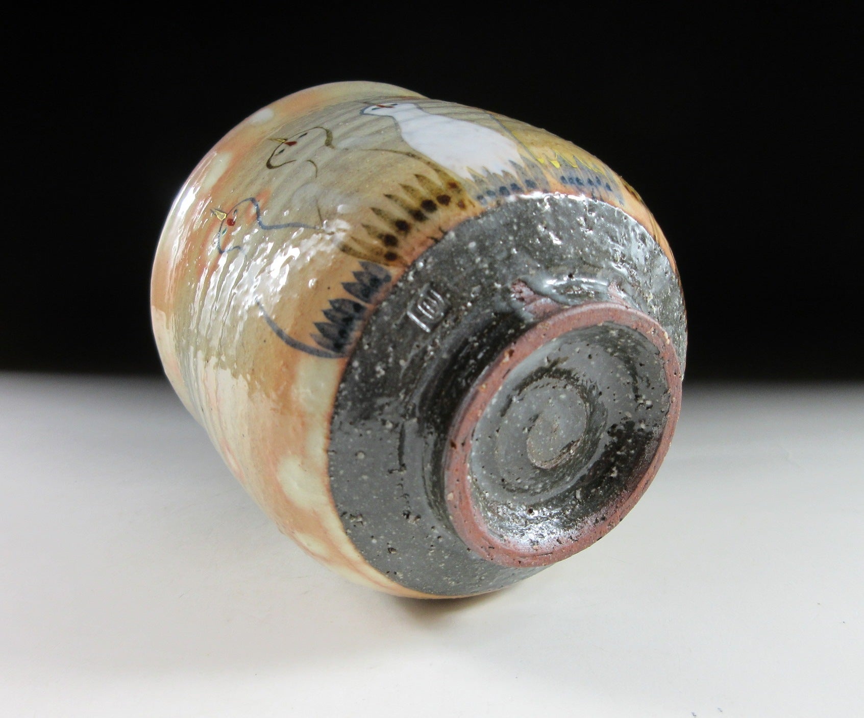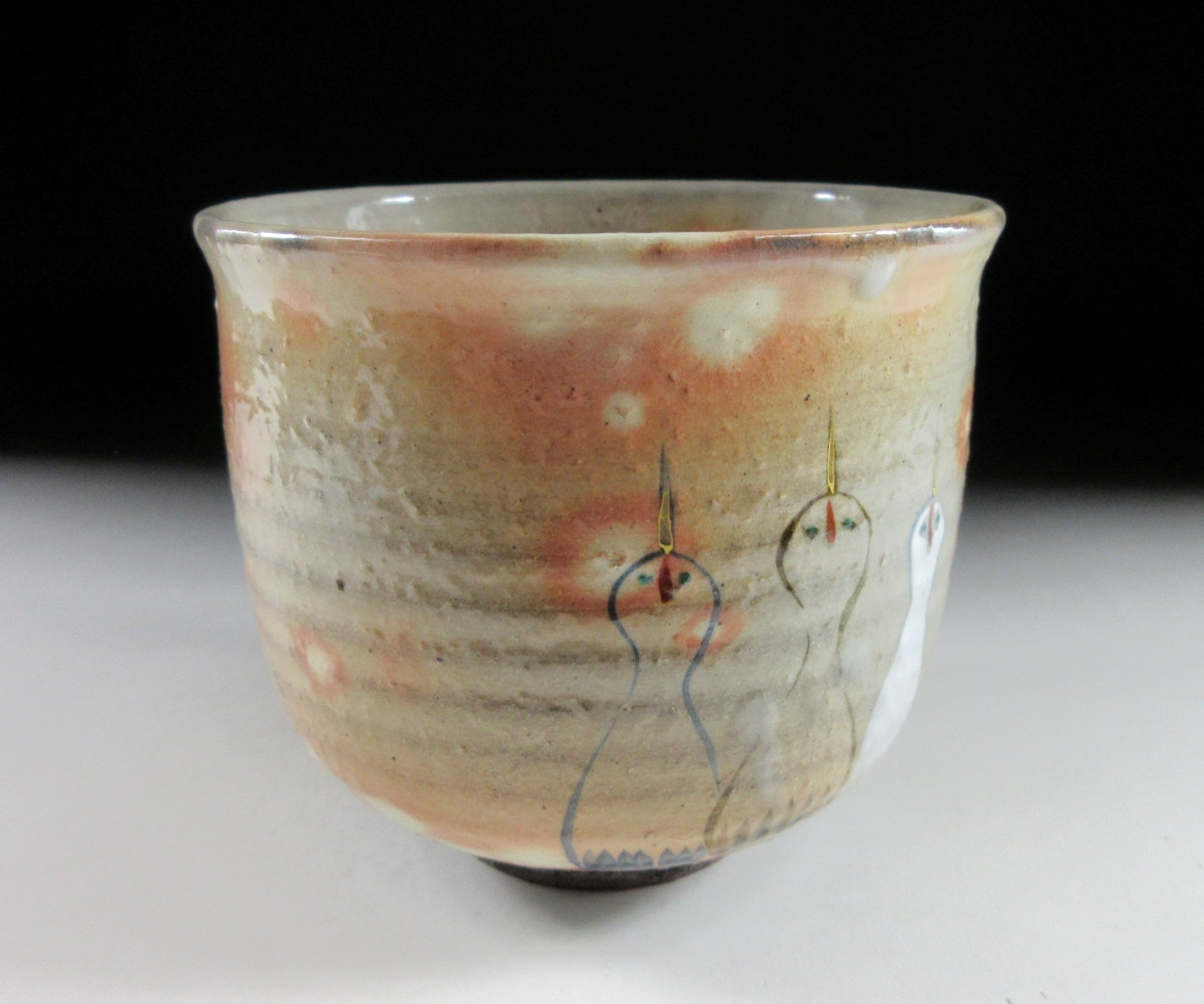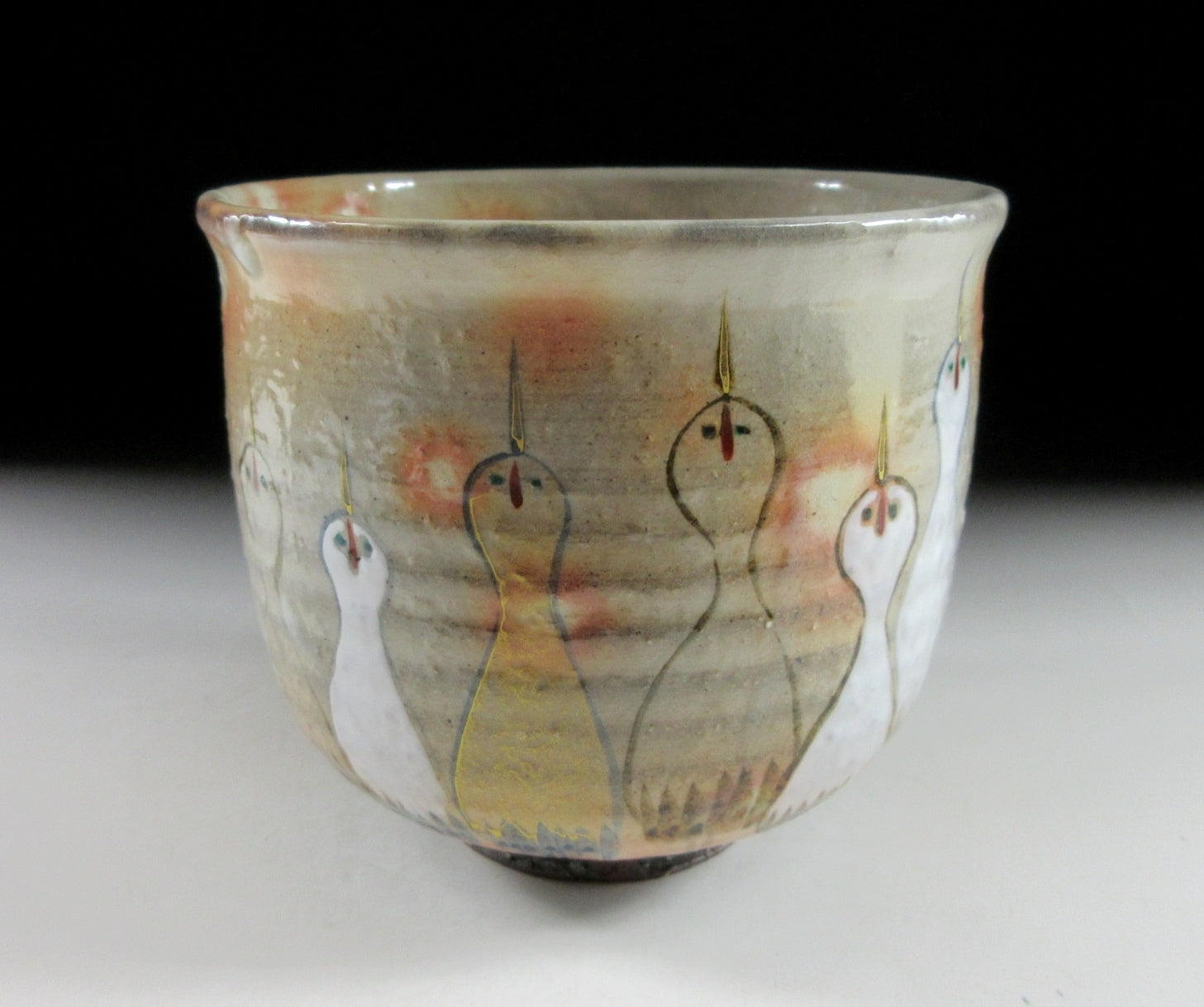 This listing is for a rather beautiful Kyo-ware tsutsu jawan made around 20-30 years ago by noted potter, Ogura Toru. Tsutsu jawan are winter tea bowls, their tall shape keeps the tea hotter for longer, flat hira chawan being the opposite and set aside for summer use. The jawan in this listing is wheel-thrown and decorated with hand painted depictions of ‘tachizuru’ standing cranes. This unique and somewhat stylised depiction is attributed to master potter Ogata Kenzan (1663-1743). This piece also features gohonte markings. Gohonte refers to the pale spots that appear on the pottery due to the natural reactions from the iron found in the clay when being fired in the kiln. The stamp of the potter can be found on the bottom, and it comes with its original paper storage box.
