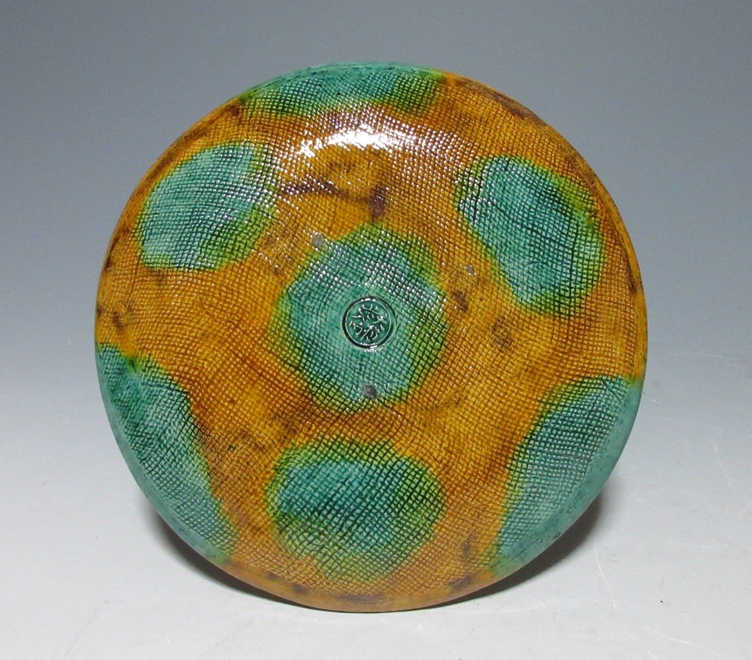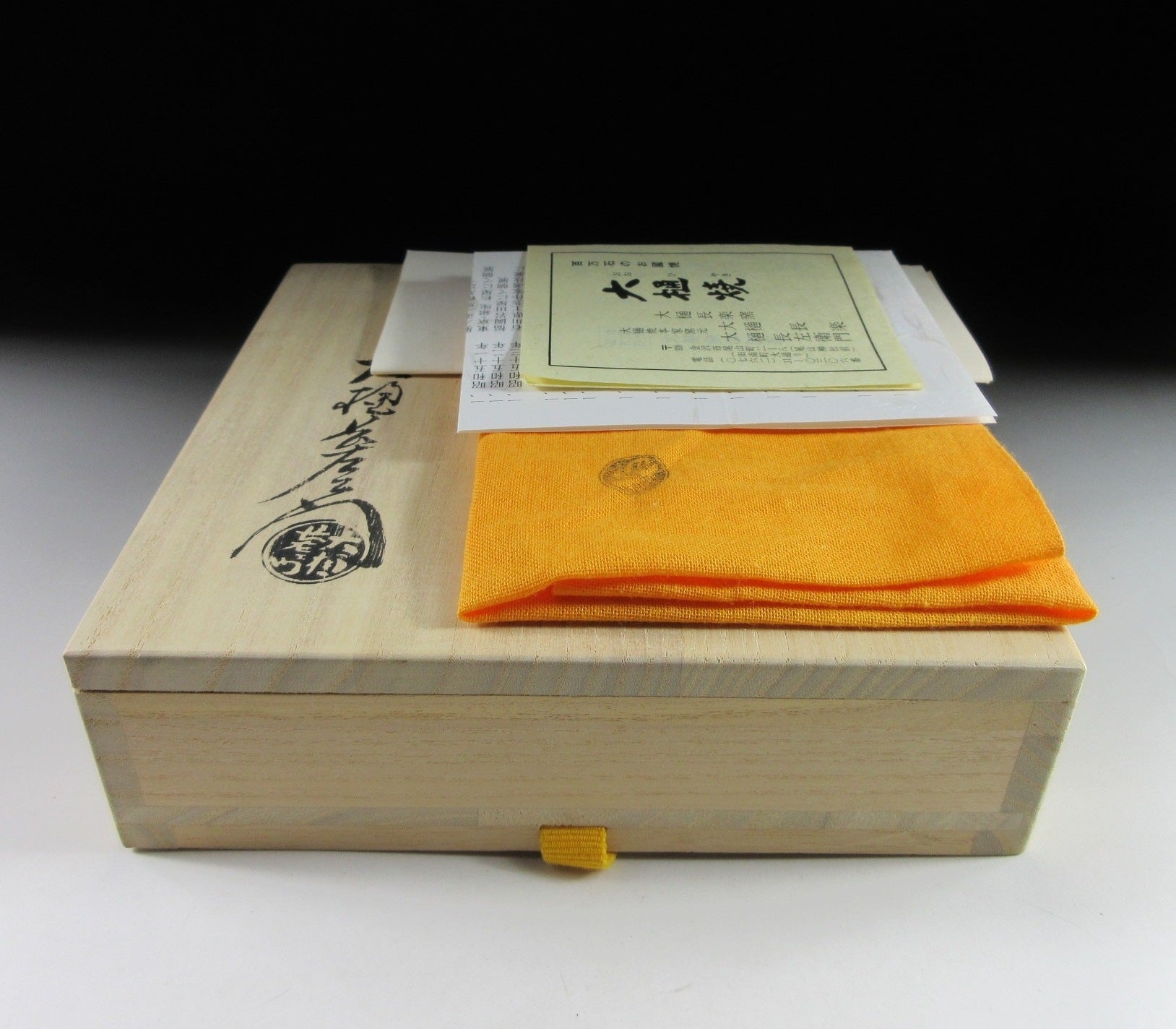 This listing is for a splendid Ohi-ware plate made around 40 years ago by master potter, Ohi Chozaemon X. It is hand-shaped and the front is decorated with a dragon motif in bas-relief. The glaze is a stunning combination of green and yellow, similar to the Art Noveau glazes used by Minpei-ware potters in the early 1900s. The stamp of the potter can be found on the back, and it comes with its original signed wooden storage box. It also comes with a stamped turmeric coloured wrapping cloth for when the plate is not in use, and three Japanese language profile papers. One of the papers suggests that the plate was presented to guests at the ceremony for Chozaemon’s succession to 10th generation master in Showa 62 (1987). This paper also has some handwritten notes on the back regarding the date and location of the ceremony.
