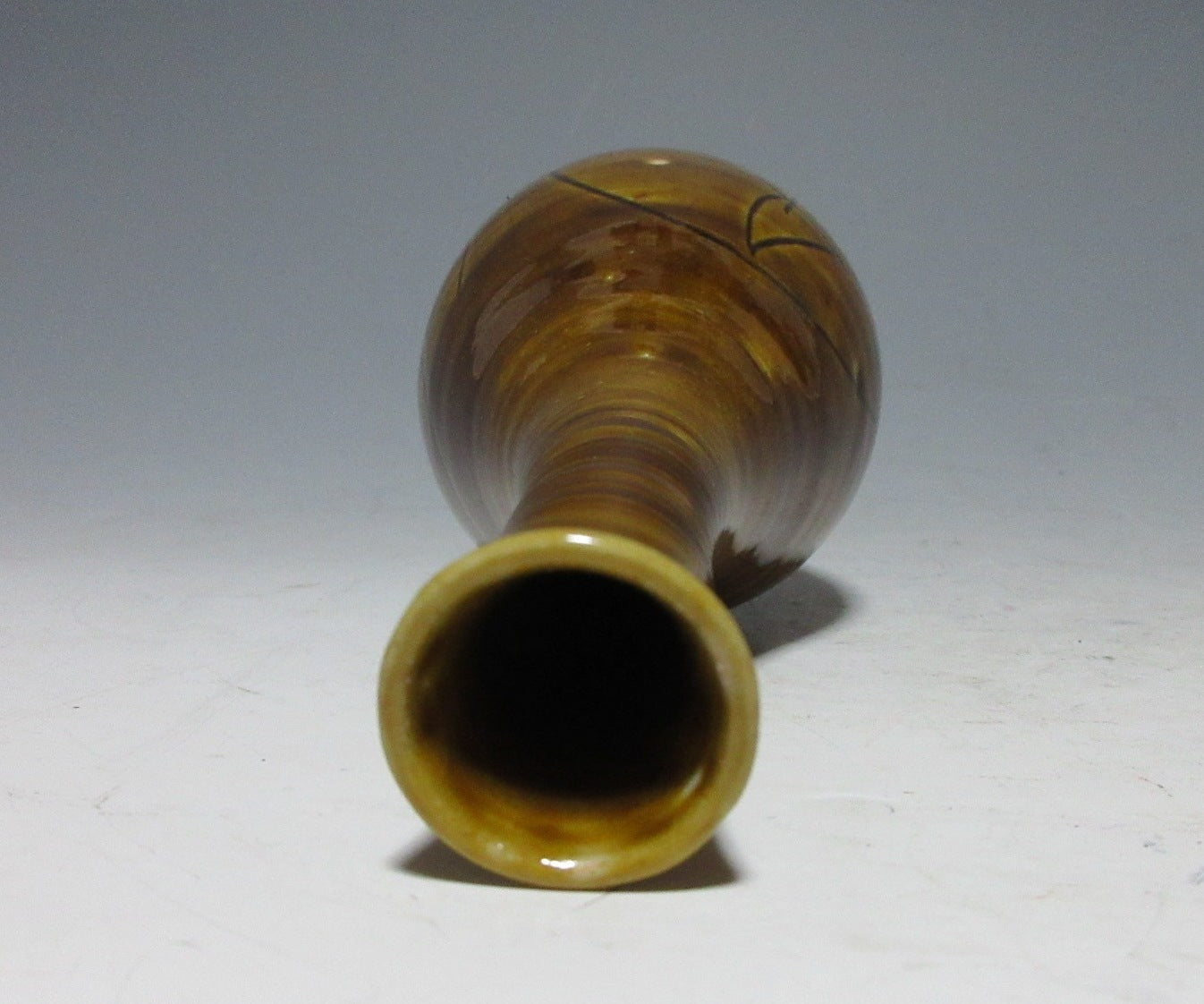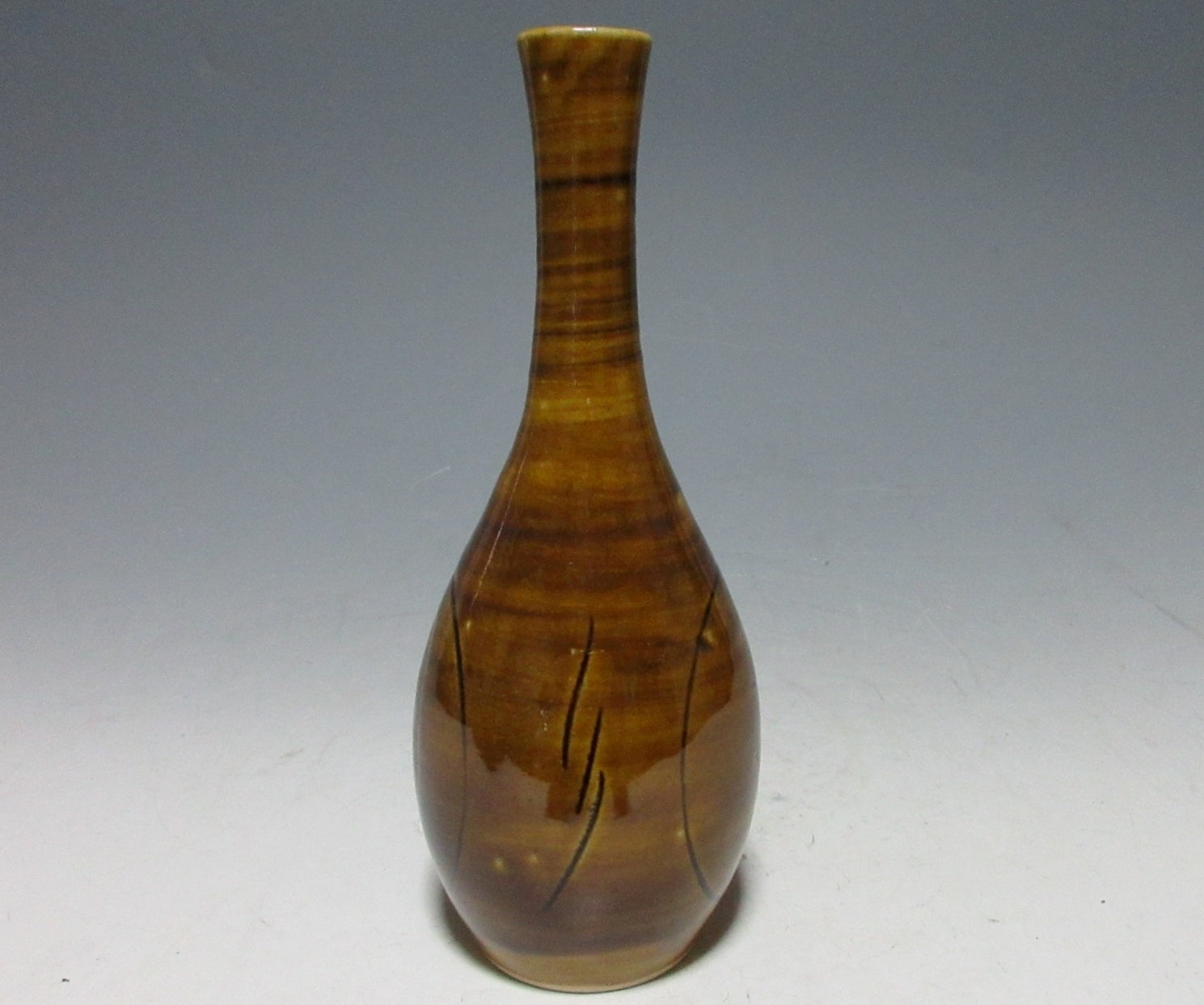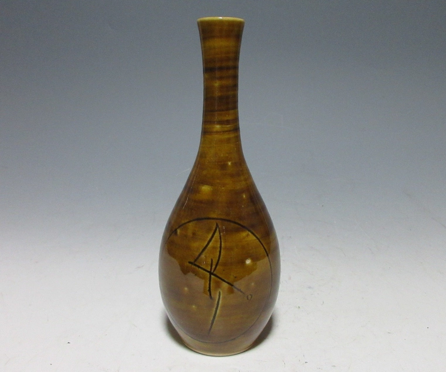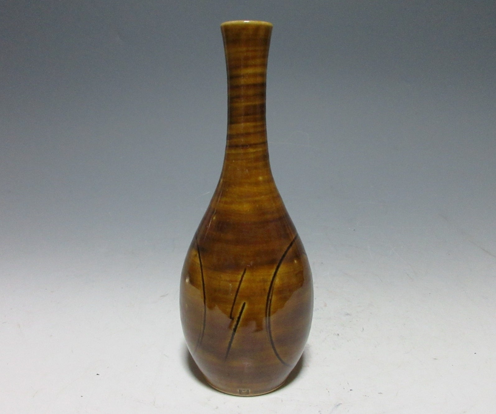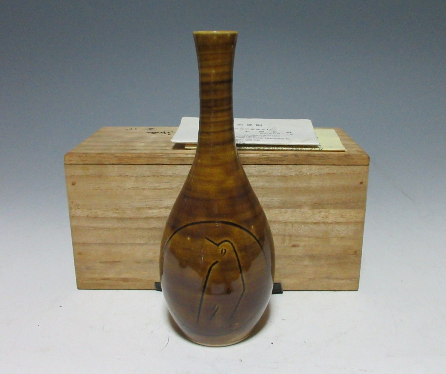 This listing is for an Ohi-ware vase made around 40 years ago by Ohi Chozaemon X. It is wheel-thrown and features glossy ‘hijiri’ glaze, and the front is incised with a simple bird motif. The opening is wide enough to accommodate a few thin stemmed flowers, and this piece is intended for use in a tea room or tokonoma. The stamp of the potter can be found on the bottom, and it comes with its original signed wooden storage box. It also comes with two Japanese language profile papers for Ohi Toshiro, this is Chozaemon’s name before he succeeded his father as the 10th generation in 1987.
